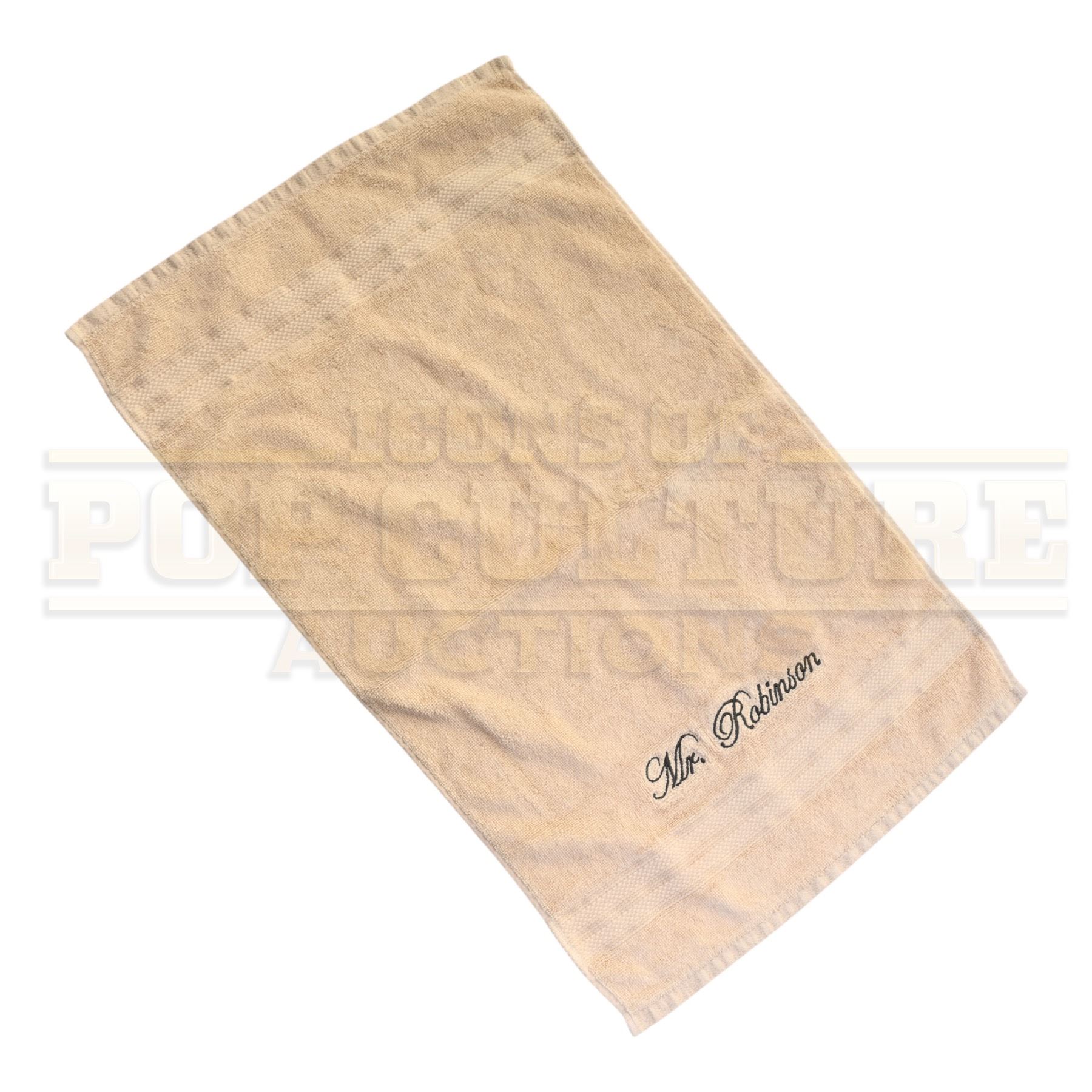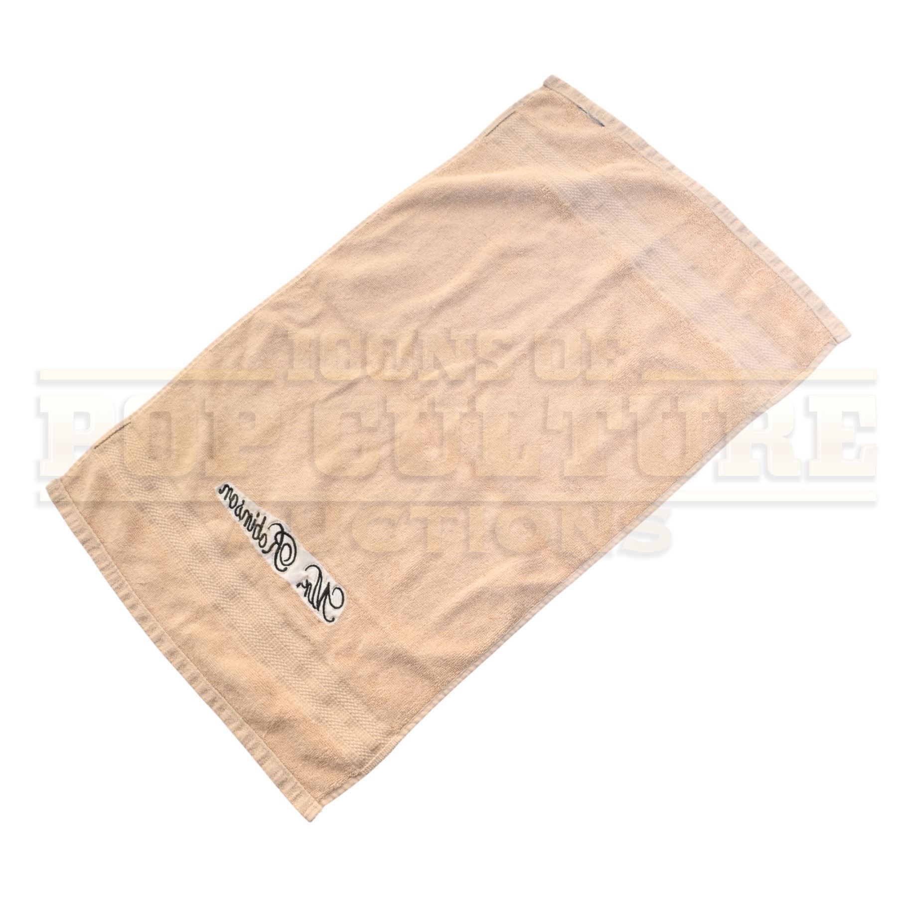 This hand towel was acquired by the production for use by Craig Robinson as “Himself”. The tan terry cloth hand towel features “Mr. Robinson” embroidered in grey lettering.