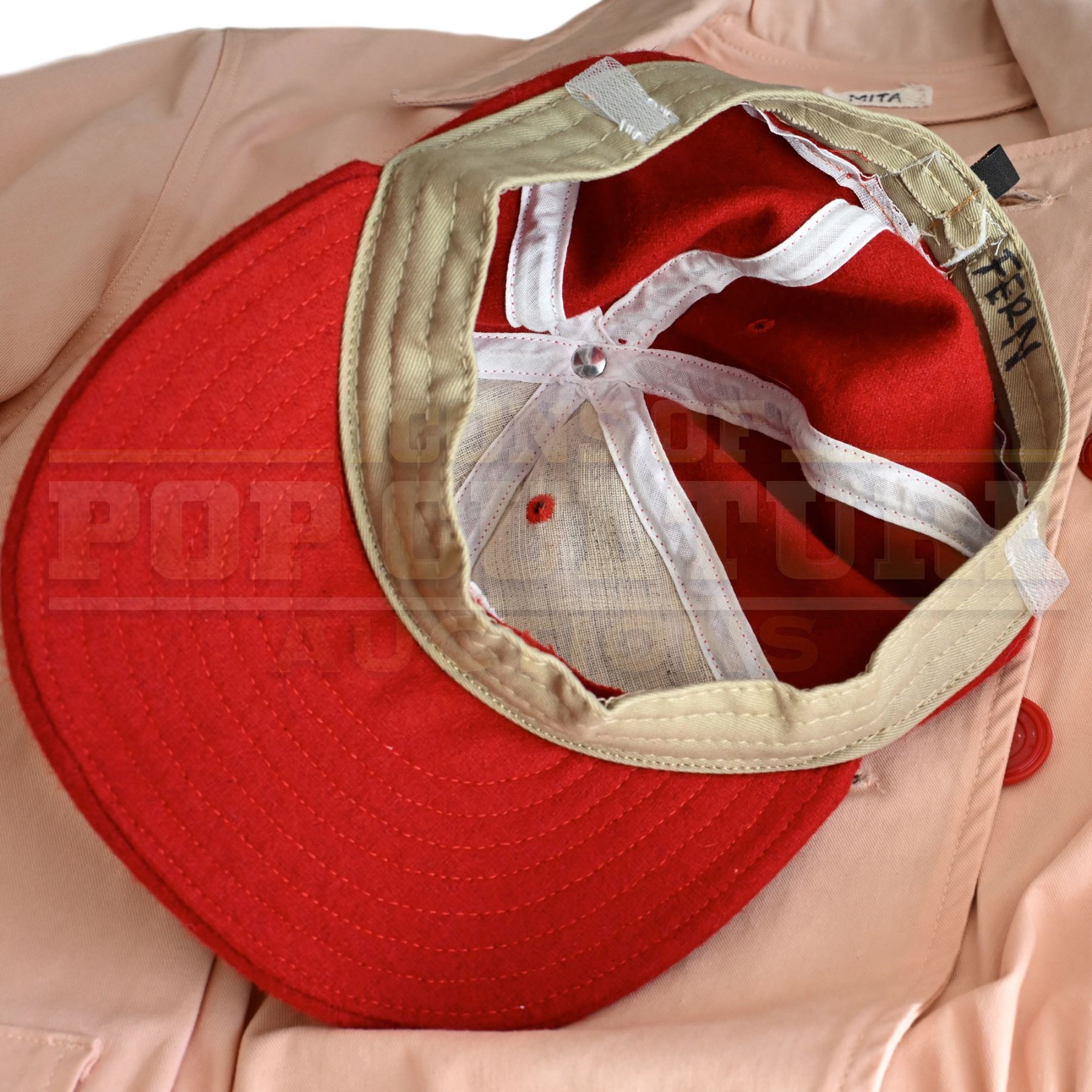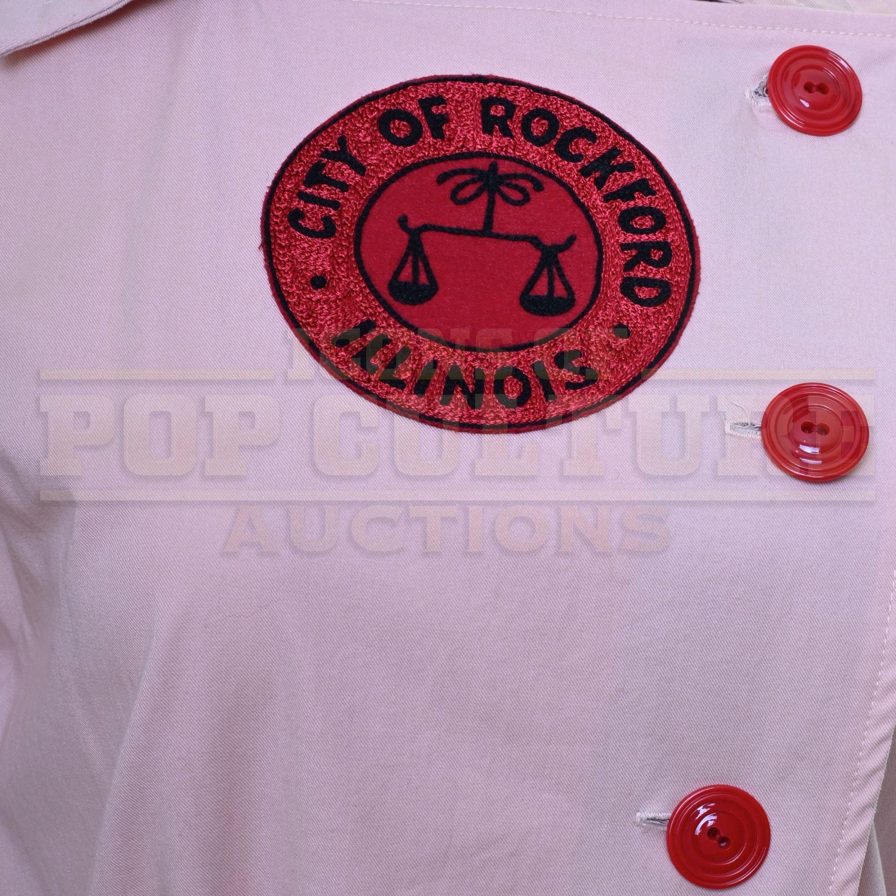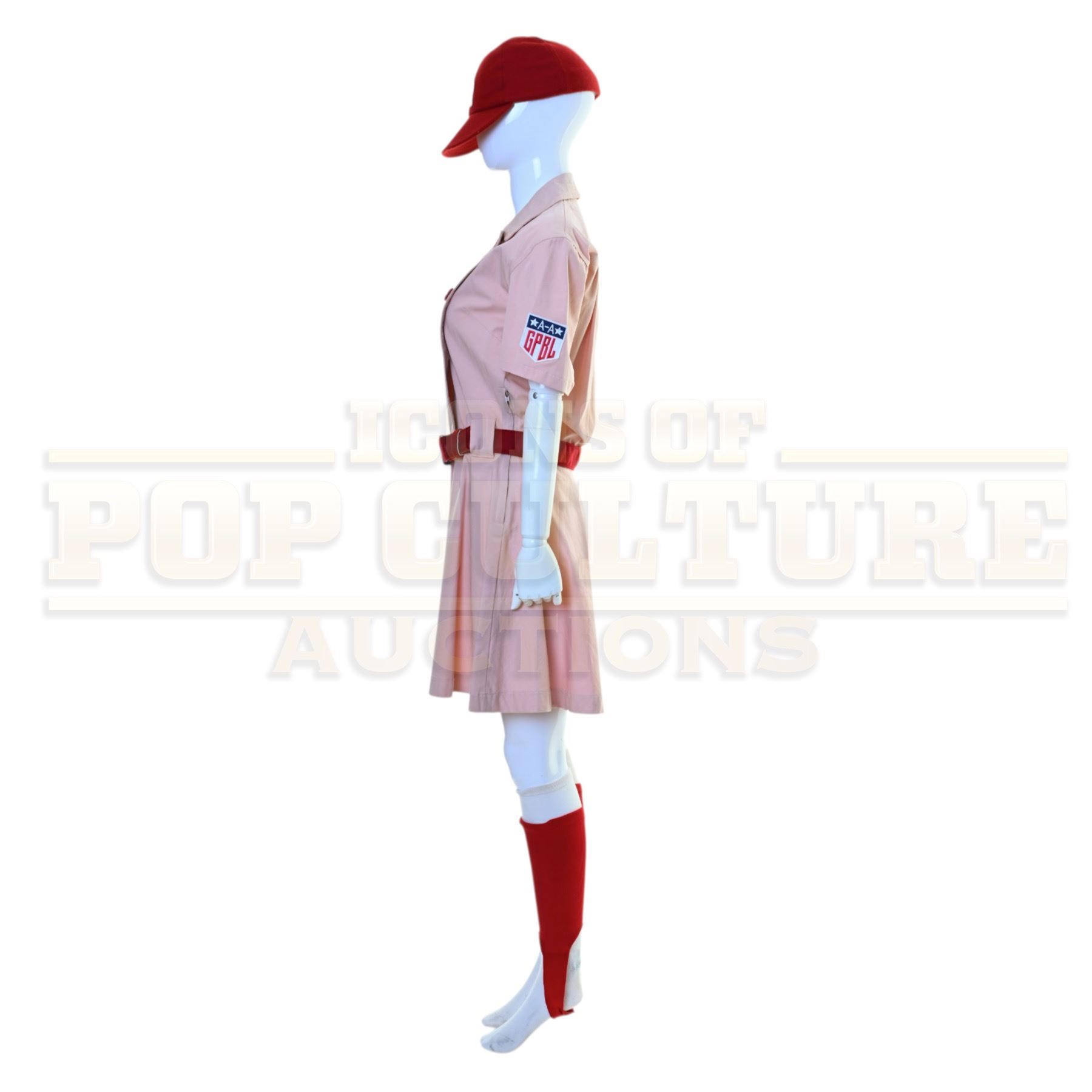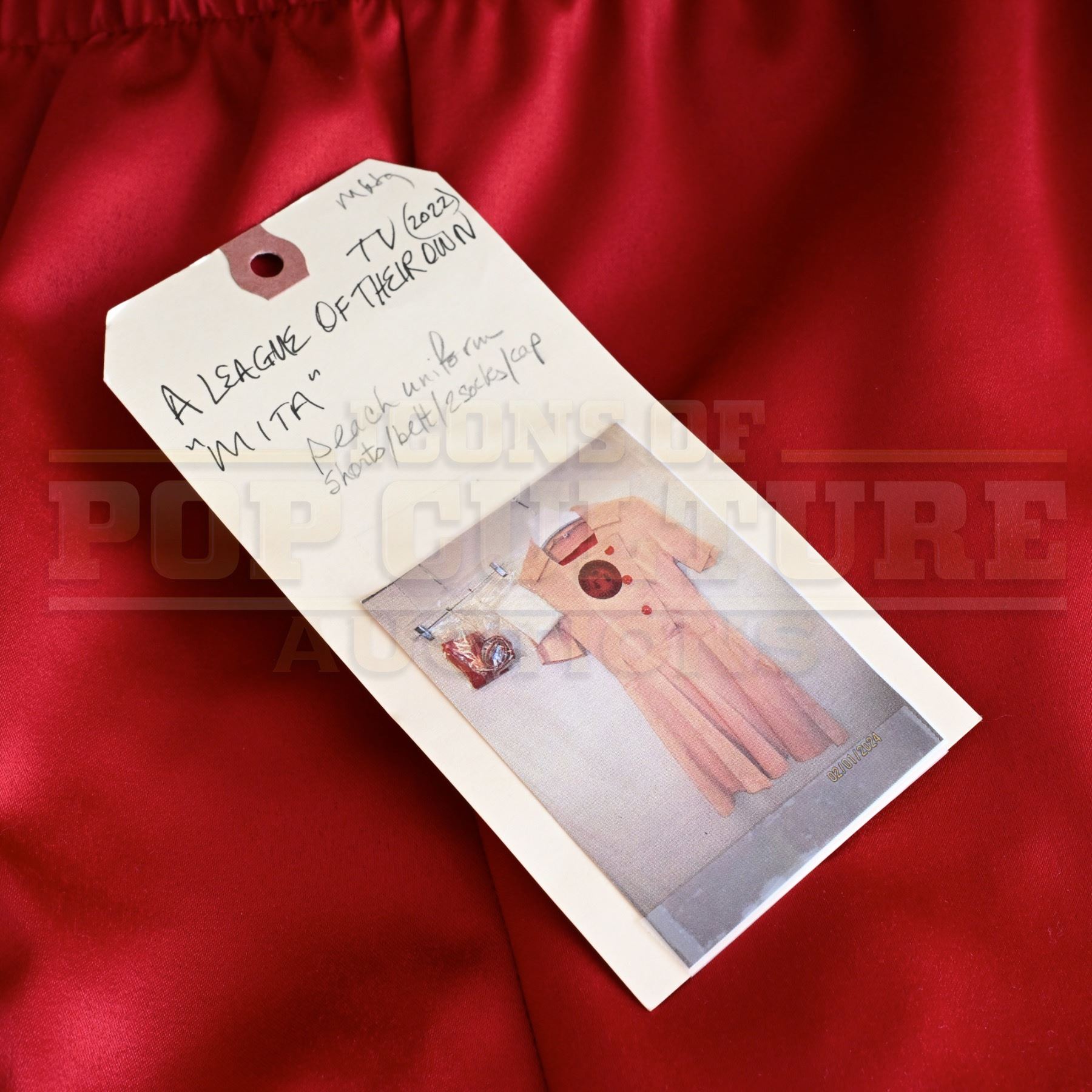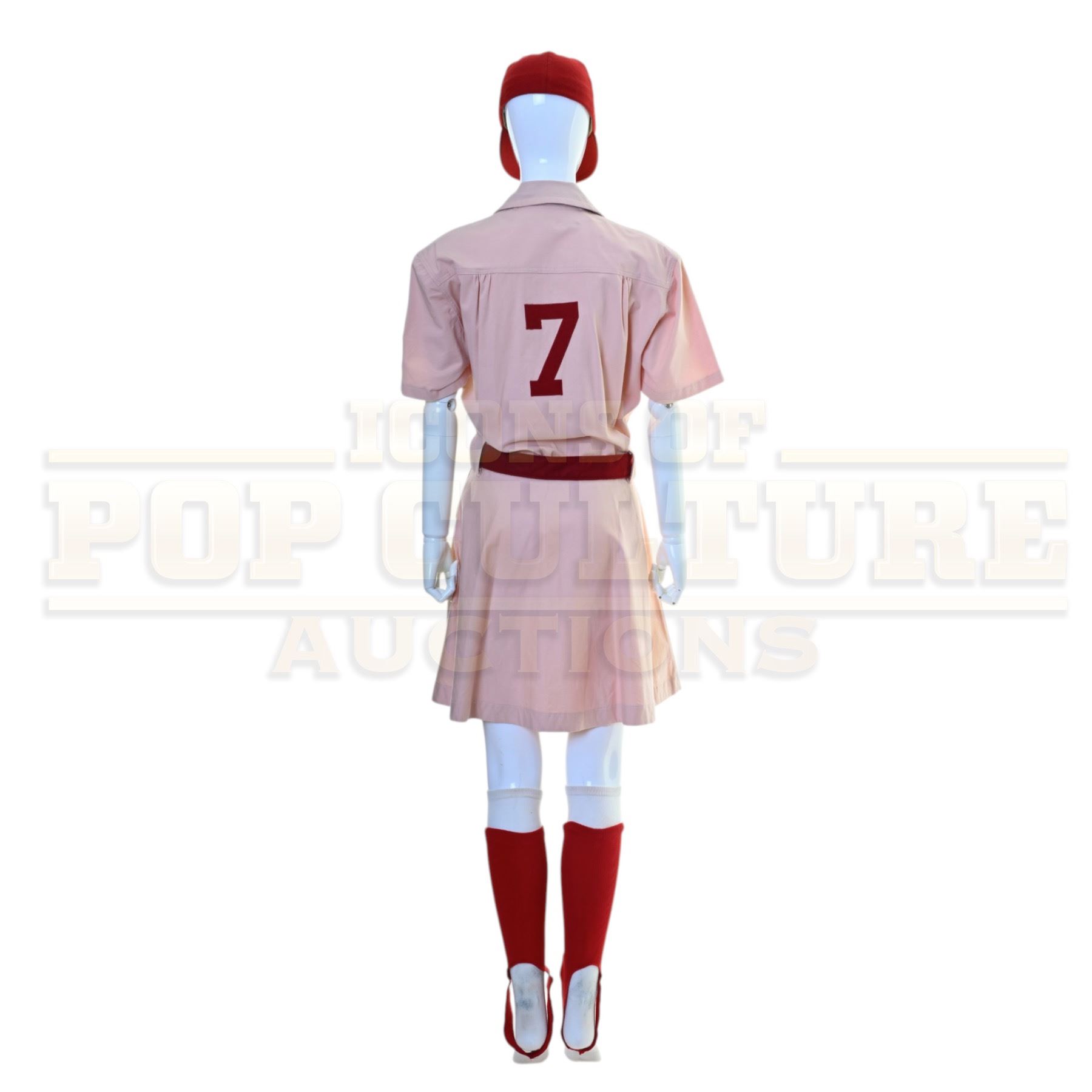 This uniform was custom-made by the production for use by an uncredited actor in various episodes of the series. The pink #”7” Rockford Illinois “Peaches” uniform consists of a uniform dress with a “City of Rockford Illinois” patch applied to the chest, a “GPBL” patch applied to the left arm and a large number “7” on the back, a red hat with a white "R" applied above the visor, a pair of red socks and a red belt.