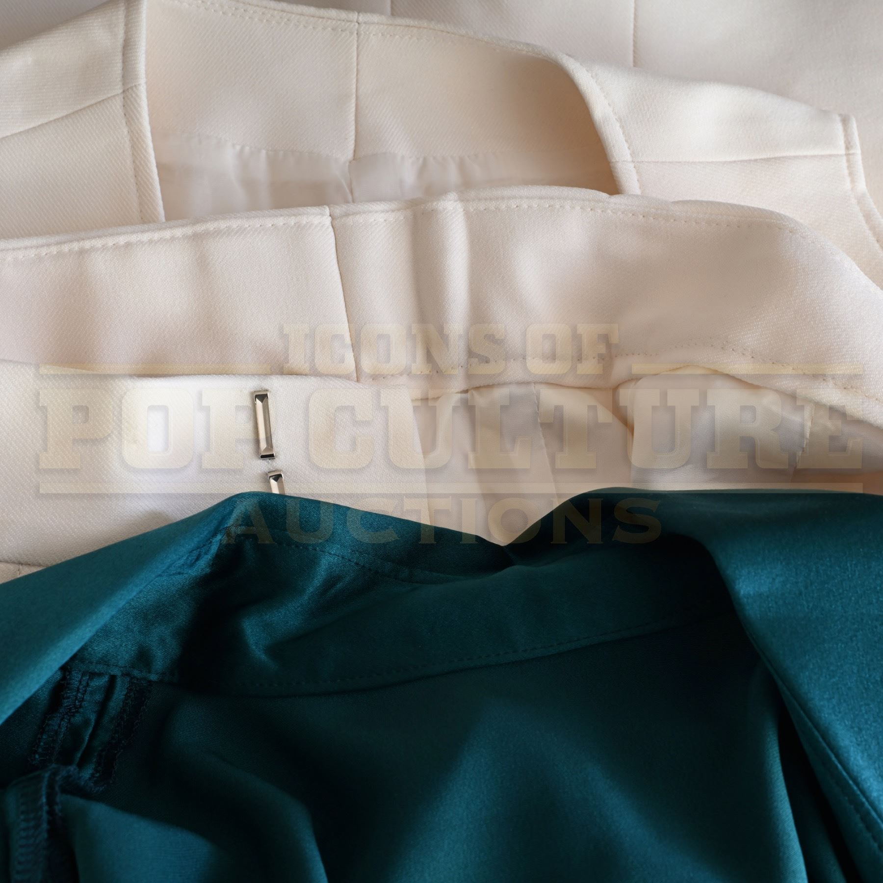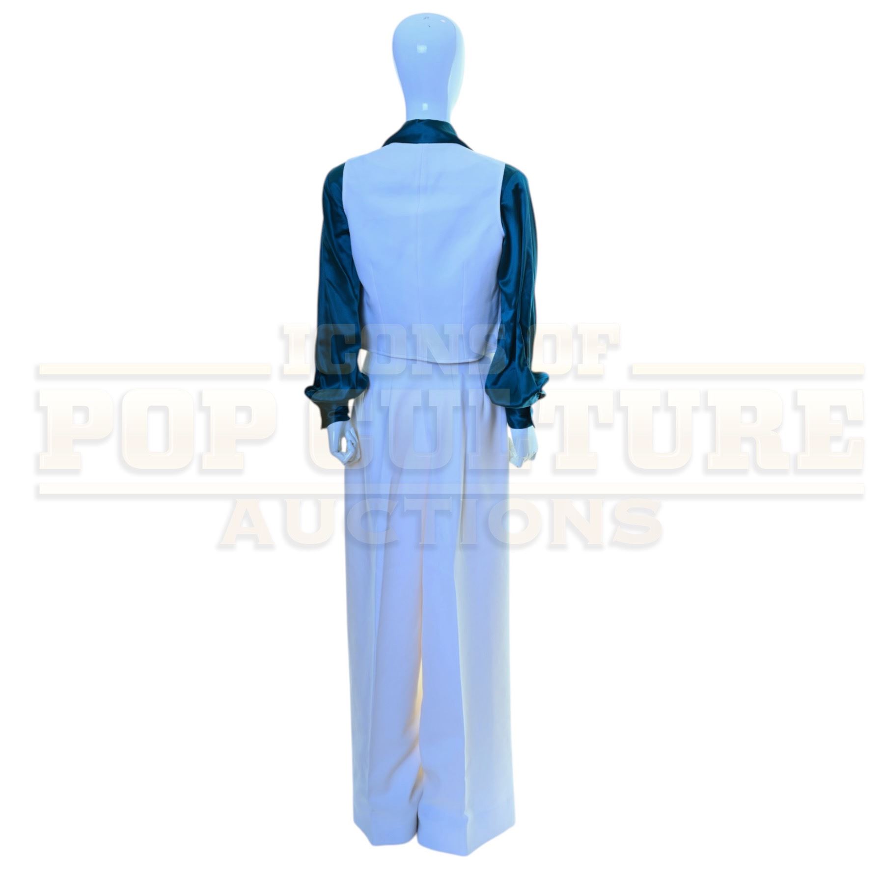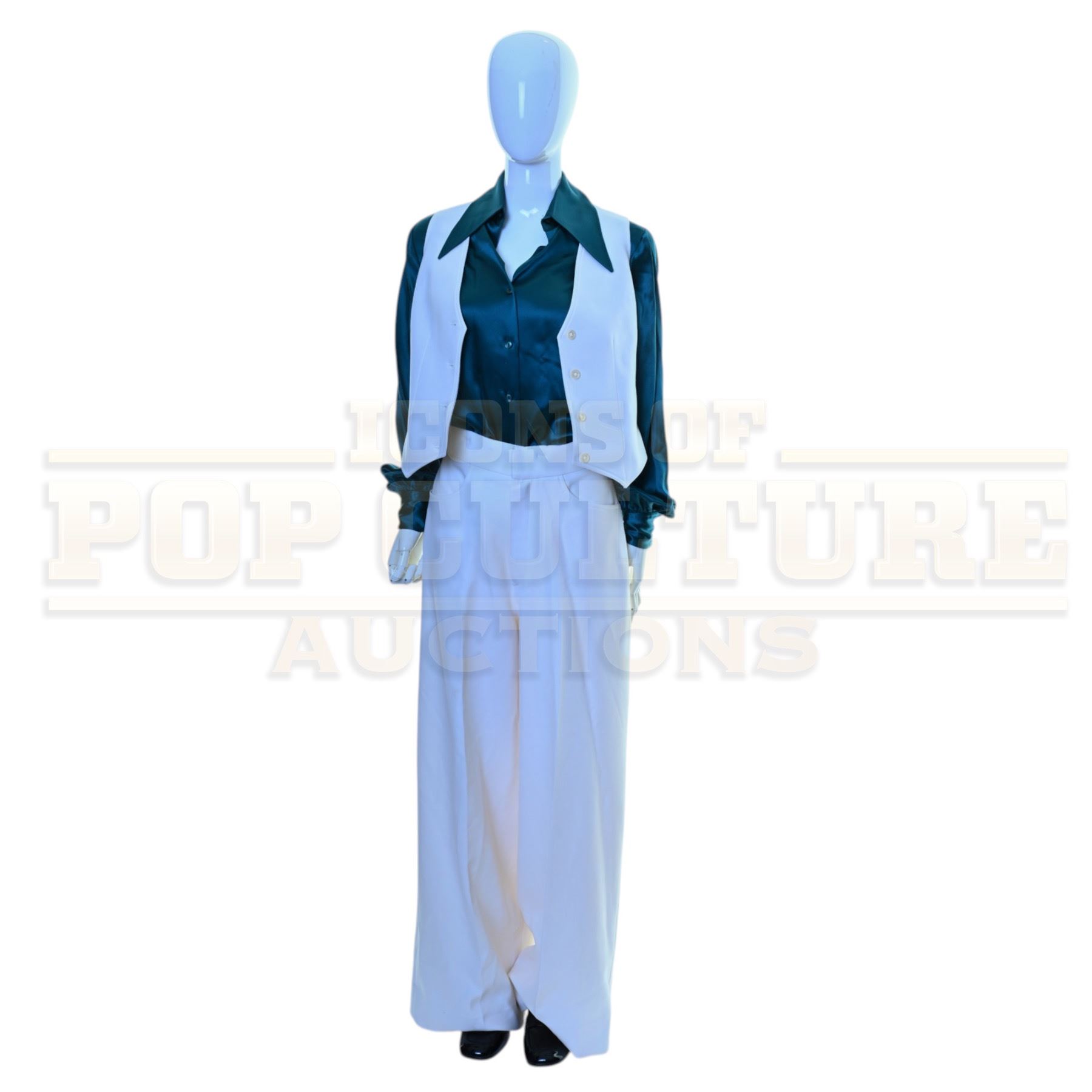 This is an original costume acquired by the production of the film "Saturday Night". This costume is not a replica; it is an actual piece acquired by the production for use by Naomi McPherson as “Janis Ian”. The costume consists of a long sleeve button front blouse, a white vest, a pair of white pants and a pair of shoes.