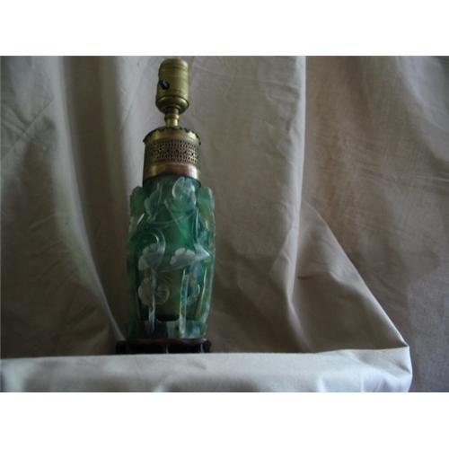 Spectacular 19th century lamp in jade quartz that is intricately carved. The green is just stunning and the lamp sits on a carved wooden base.  This is truley a beauty.