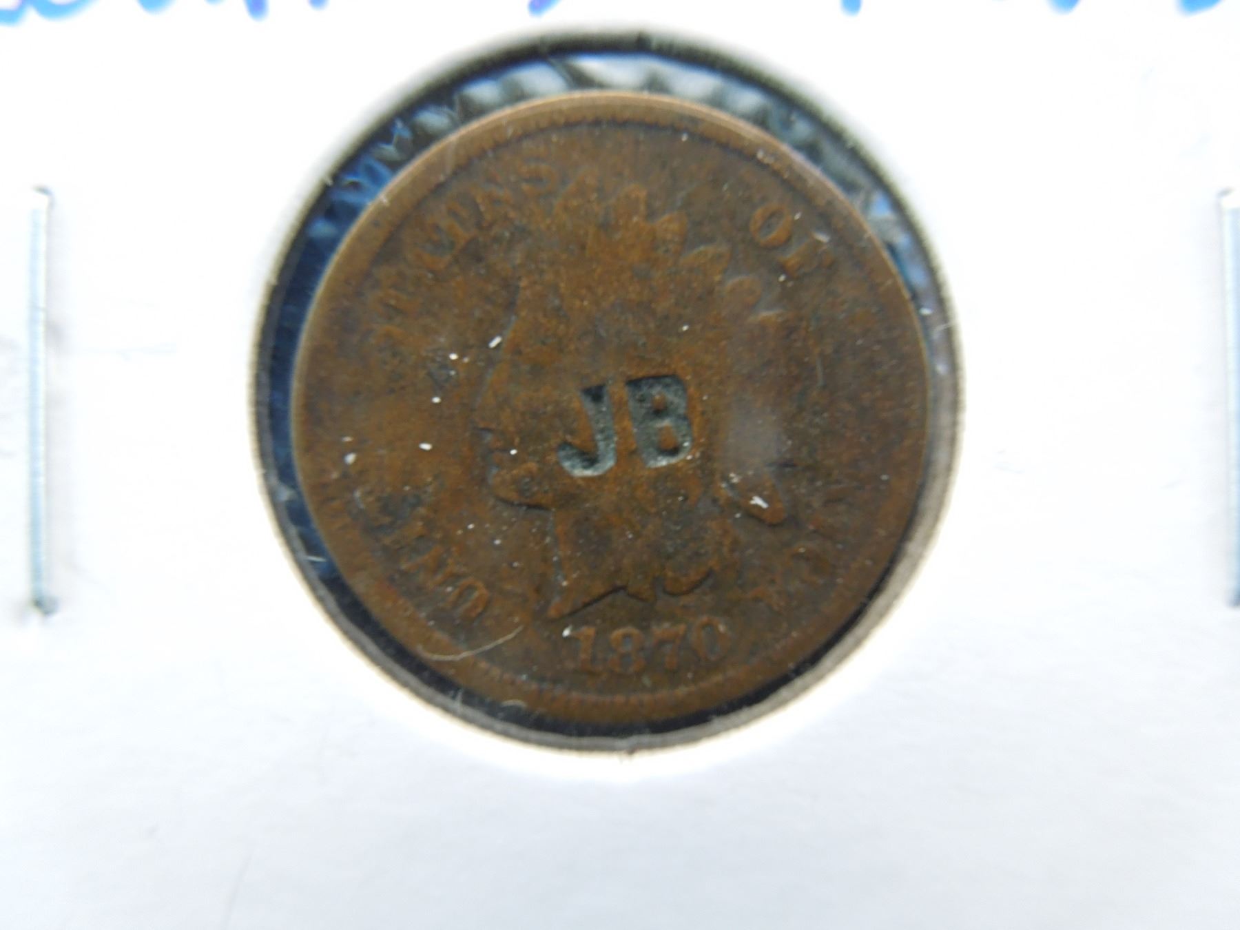 key date 1870 Indian head cent counter stamped with the initials "JB".