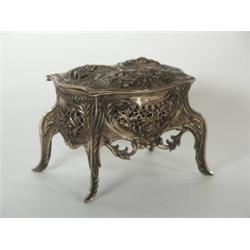 Ezüst, 203 g. Lábakon álló, ívelt oldalú téglatest forma, zsanérosan nyíló tetovel. Egész felületén áttört, domborított díszítéssel. Jelzés nélkül, német XIX. sz. vége