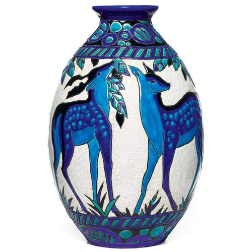 Exceptional Boch vase, designed by Charles Catteau, large and bulbous form with incised and painted design of four deer among foliage, marked, artist signed, 12.5in.h, excellent piece