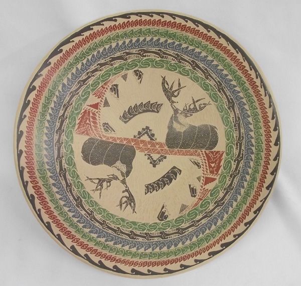 Mata Ortiz Sgrafitto Bowl - Silvia Villa. This is an amazingly beautiful, intricate designed bowl. There are rows and rows of different colored, different shaped designs incised into the bowl. There is also incised fined lines in the background tan. In the bottom, there are two magnificent elks. The outside is also filled with the intricate rows of designs and two elk. The artist left a signature on the rump of one of the elks on the bottom of the bow. This bowl would be the centerpiece of any pottery collection. Measures 3''Hx12''W. Mata Ortiz is a small village in the state of Chihuahua, Mexico. The potters of Mata Ortiz create contemporary works of art, often incorporating Mimbres designs shared by the Southwest, Native American cultures.