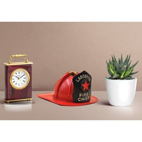 Decorate for any table, desk, or shelf in sporty fashion with Our Rustic ladder 55 FDNY Fire Chief Hat. Featuring a rustic iron frame, this charming vintage Classic hat includes fine detail. The Red and Black metal Exterior are finished in natural colors. Dimensions: approx (H X W): 8 X 15 Inches.