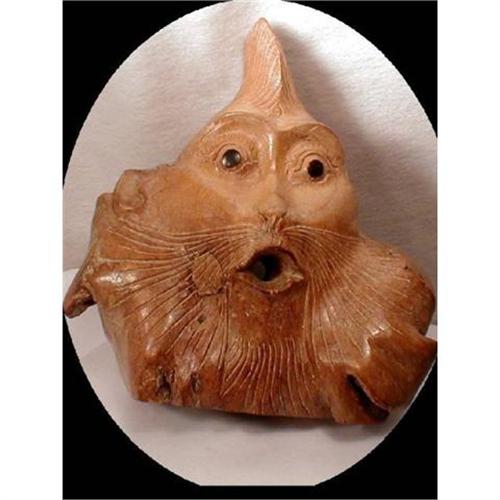 This 6" tall ( see photo next to a DIME) huge carved monkey head is so well done that it looks just like a real critter when you have him sitting next to you. I am not sure what it is carved of but whatever it is, it is all one piece of wood. He is quite the character and has his lips pursed as if to be calling out to someone. So strange he just manages to draw you in with curiosity. IT has beautiful finished touches too.