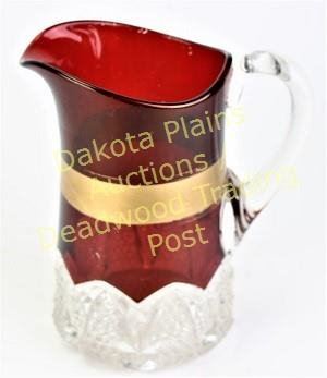 large antique ruby stained water pitcher with painted gold band, 8.5" tall, condition is very good,