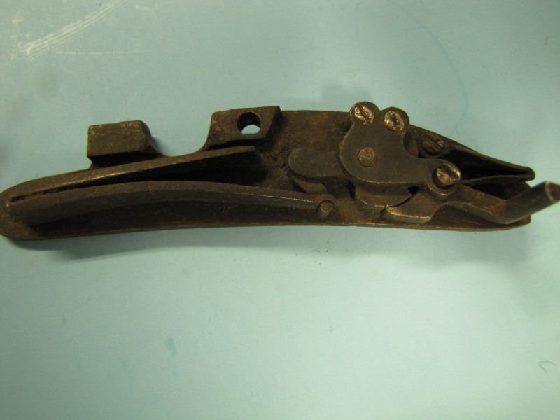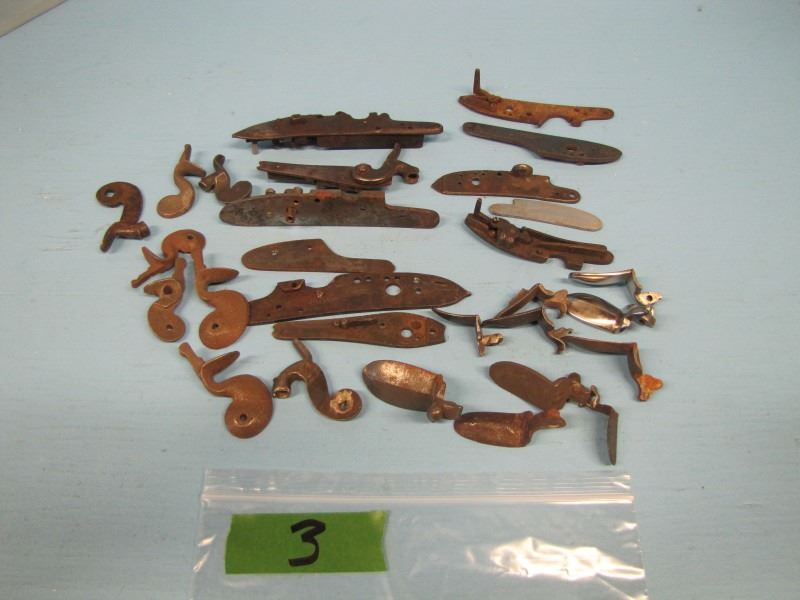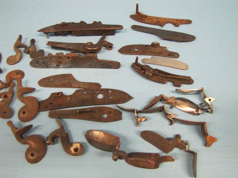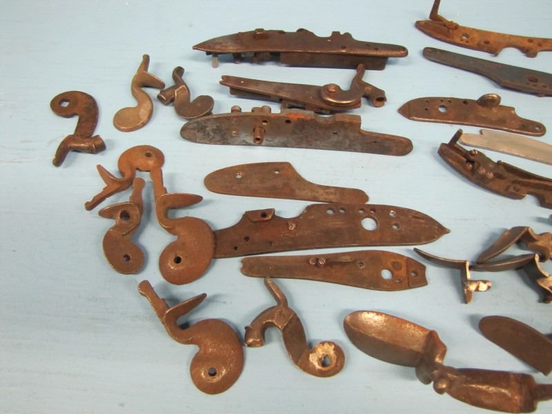 large bag of antique gun parts including 10 Brown Bess and 1807 Springfield locks, 8 Flintlock and percussion hammers, 10 frizzens mostly Brown Bess