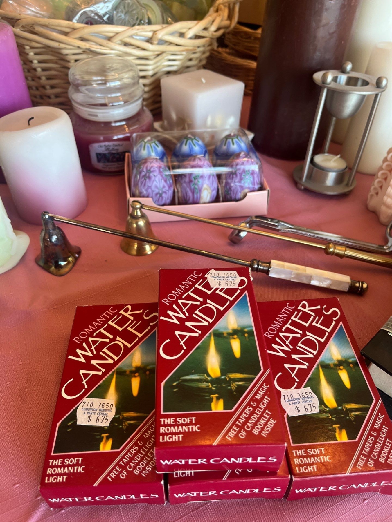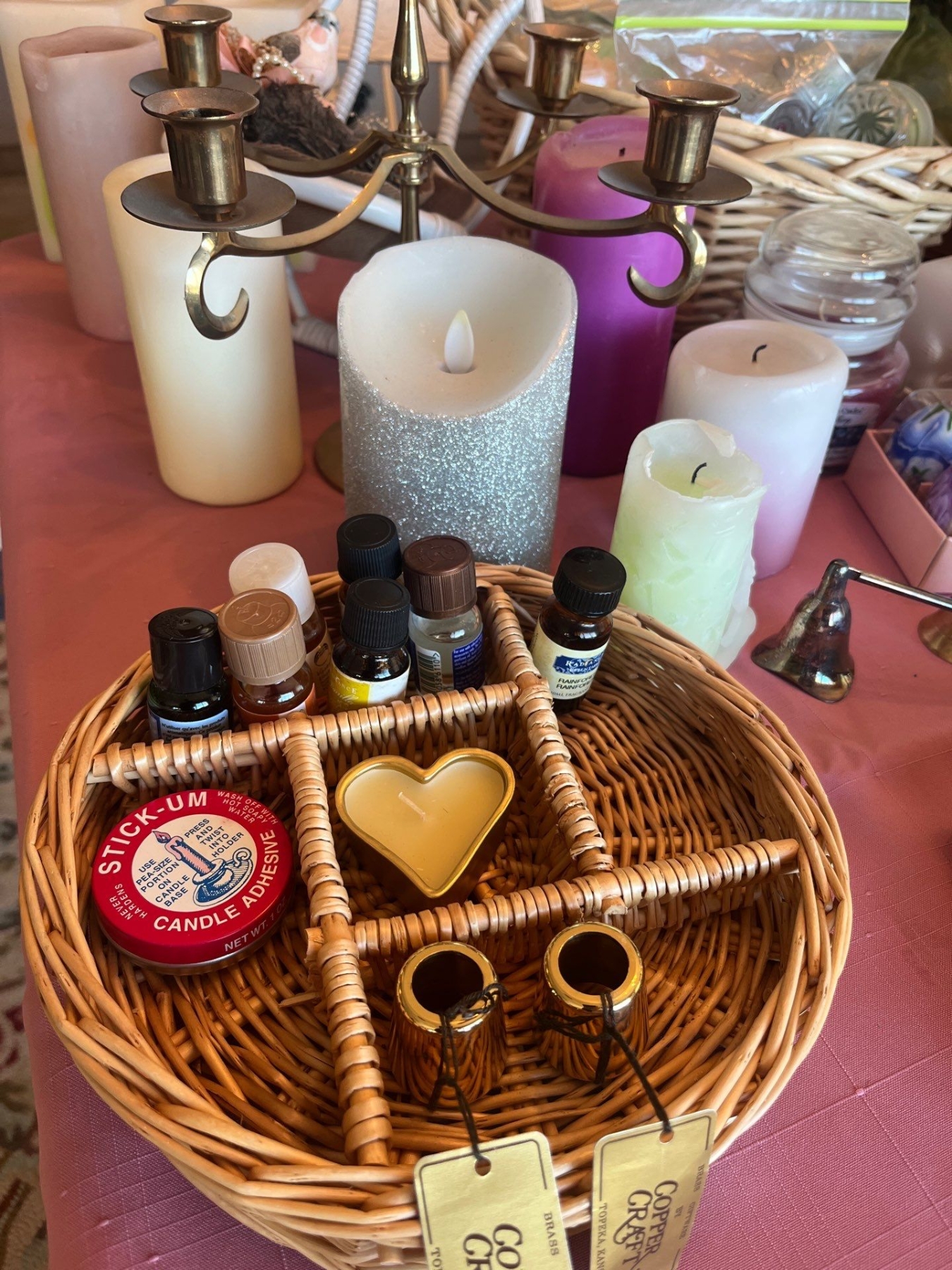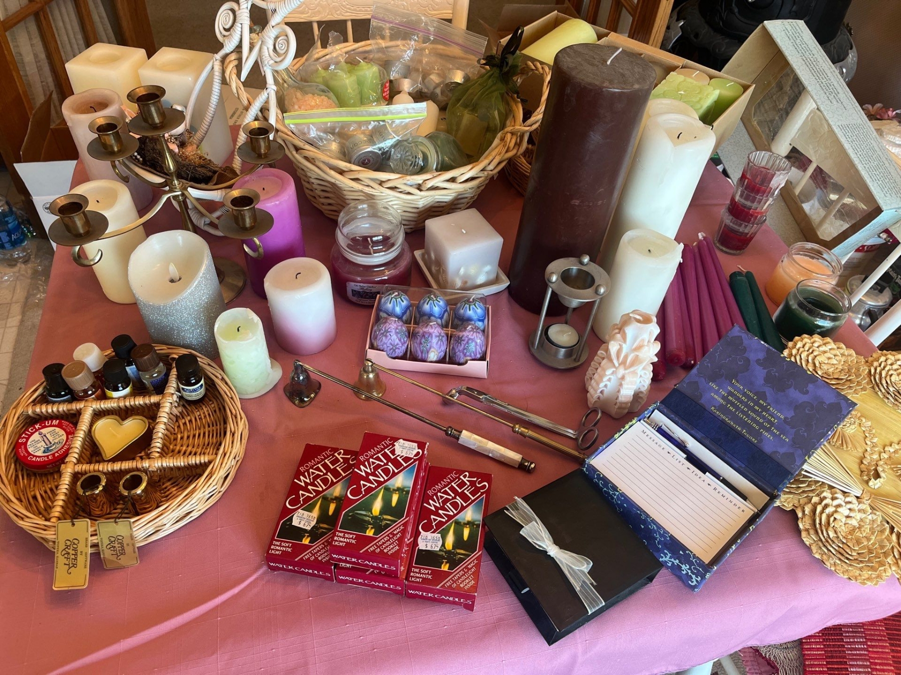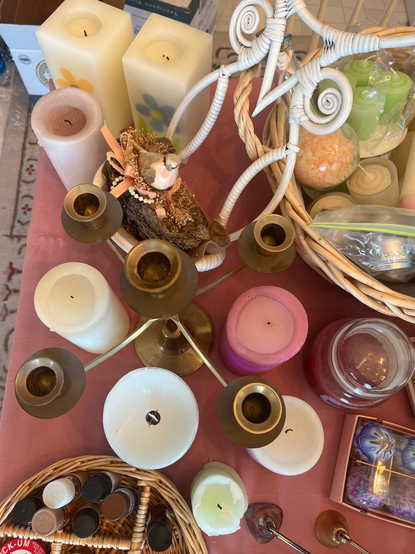 large collection of candles, candle holders, and baskets. Include sense for your candles, as well as there are brass candle holders, and two candle, sniffers, and WIC trimmer