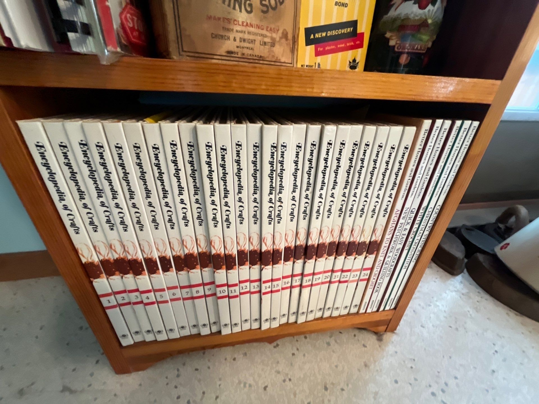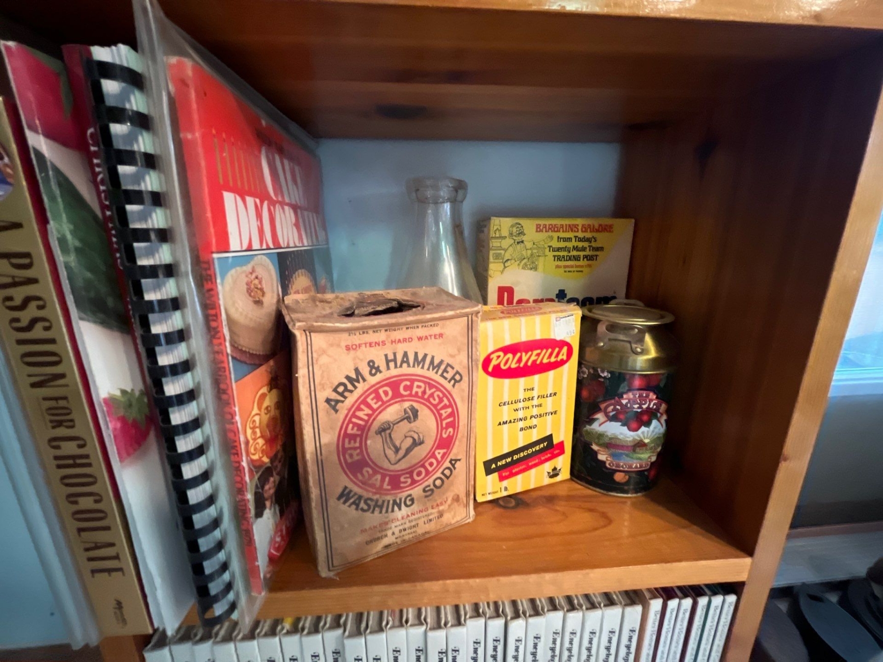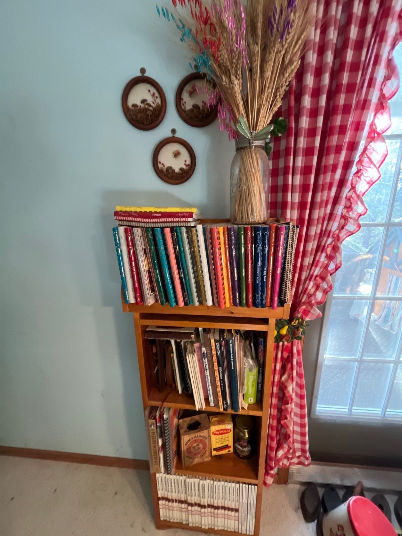 large collection of cookbooks with wooden stand and wall hanger with wheat grass ornament and three small round mushroom artwork