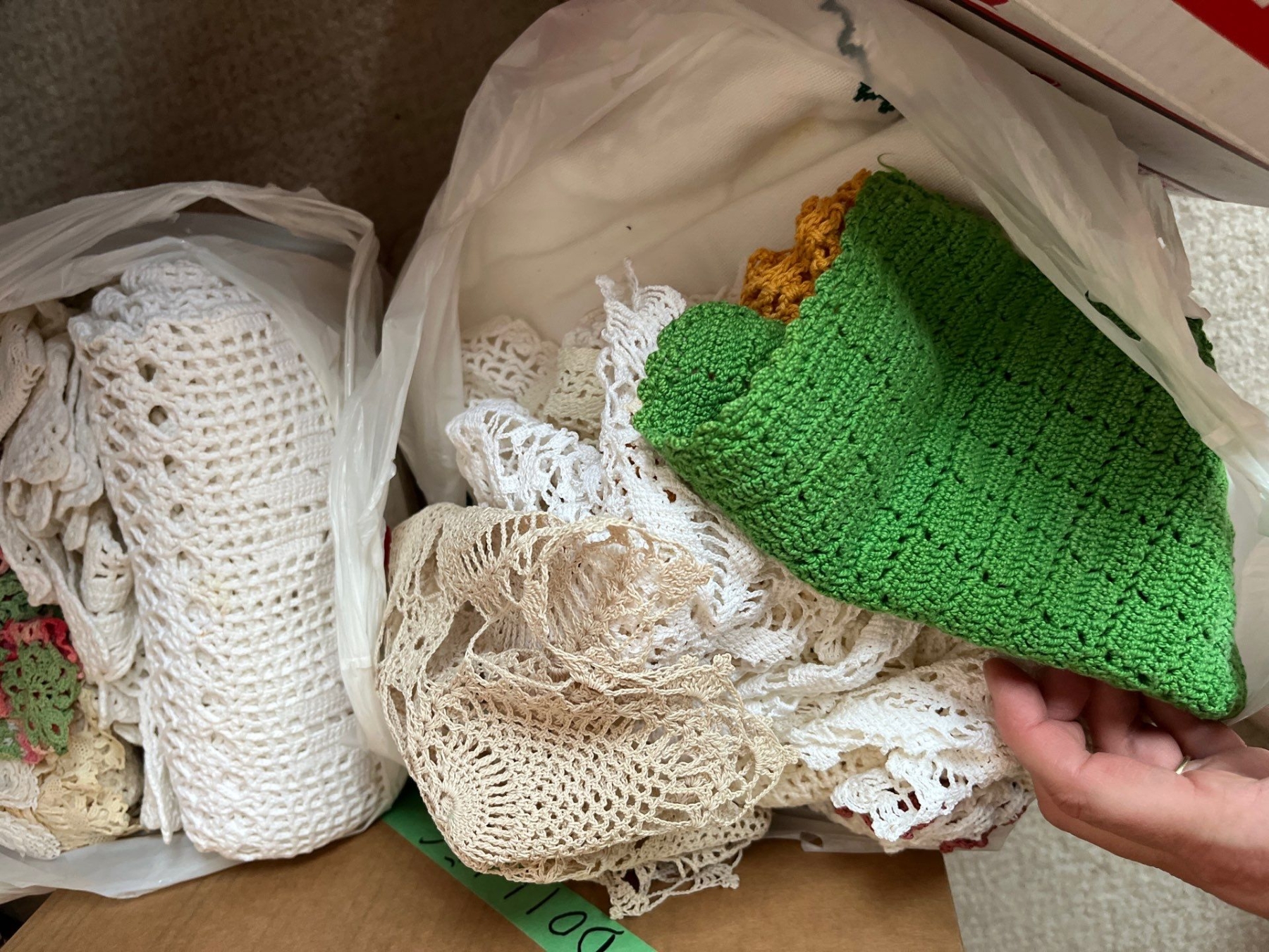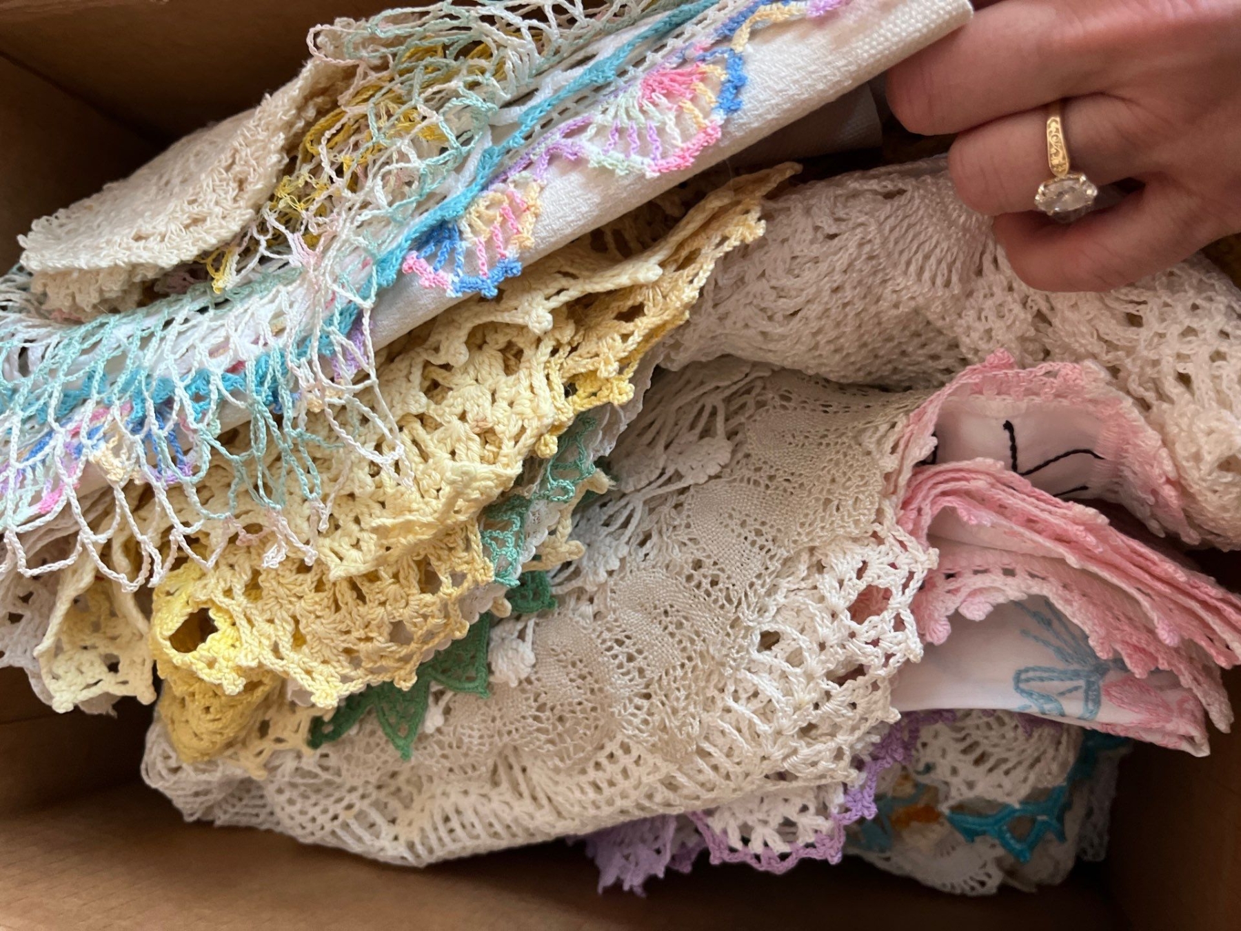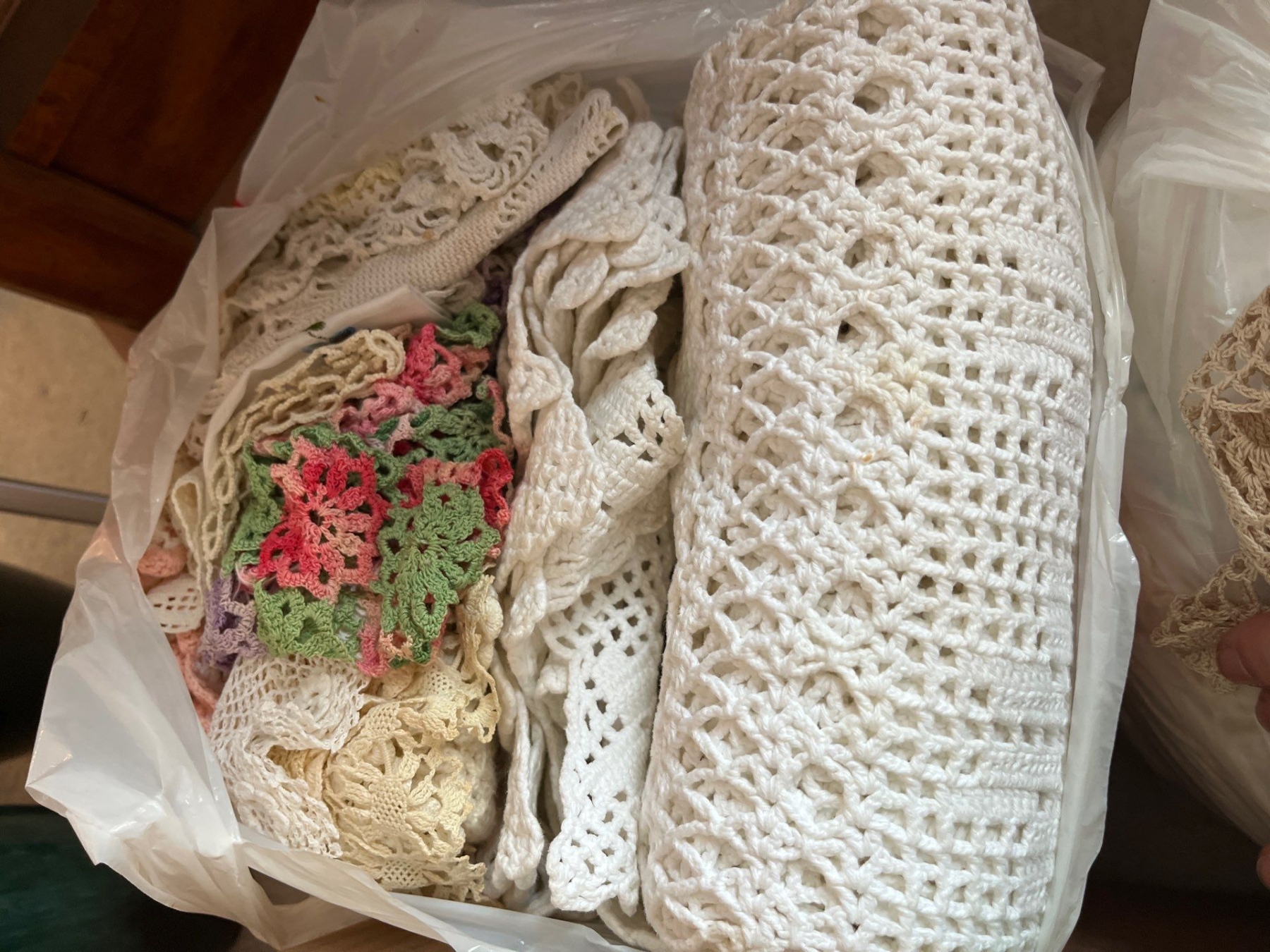 large collection of doilies tablecloth, napkins, all handmade with a variety of colors and styles