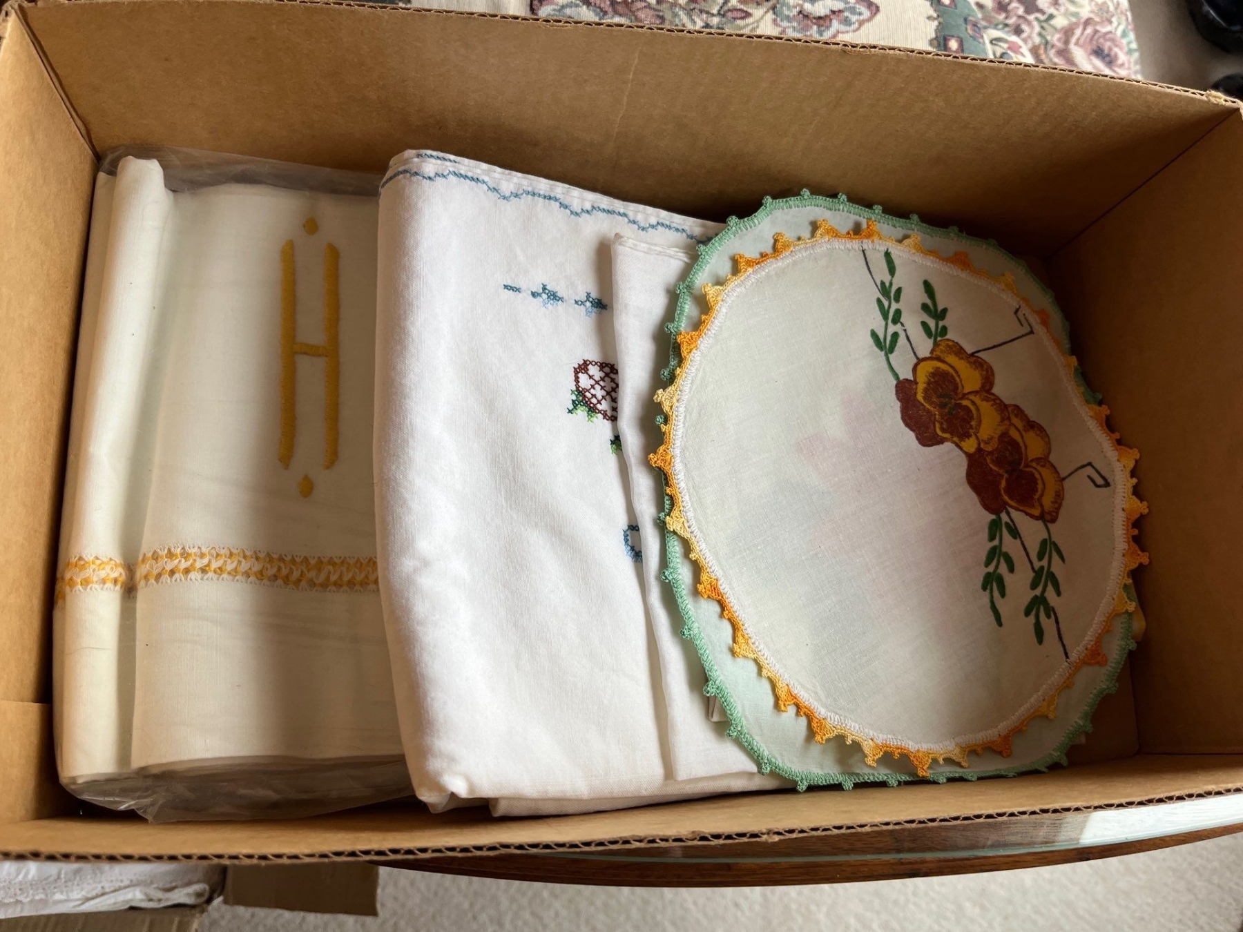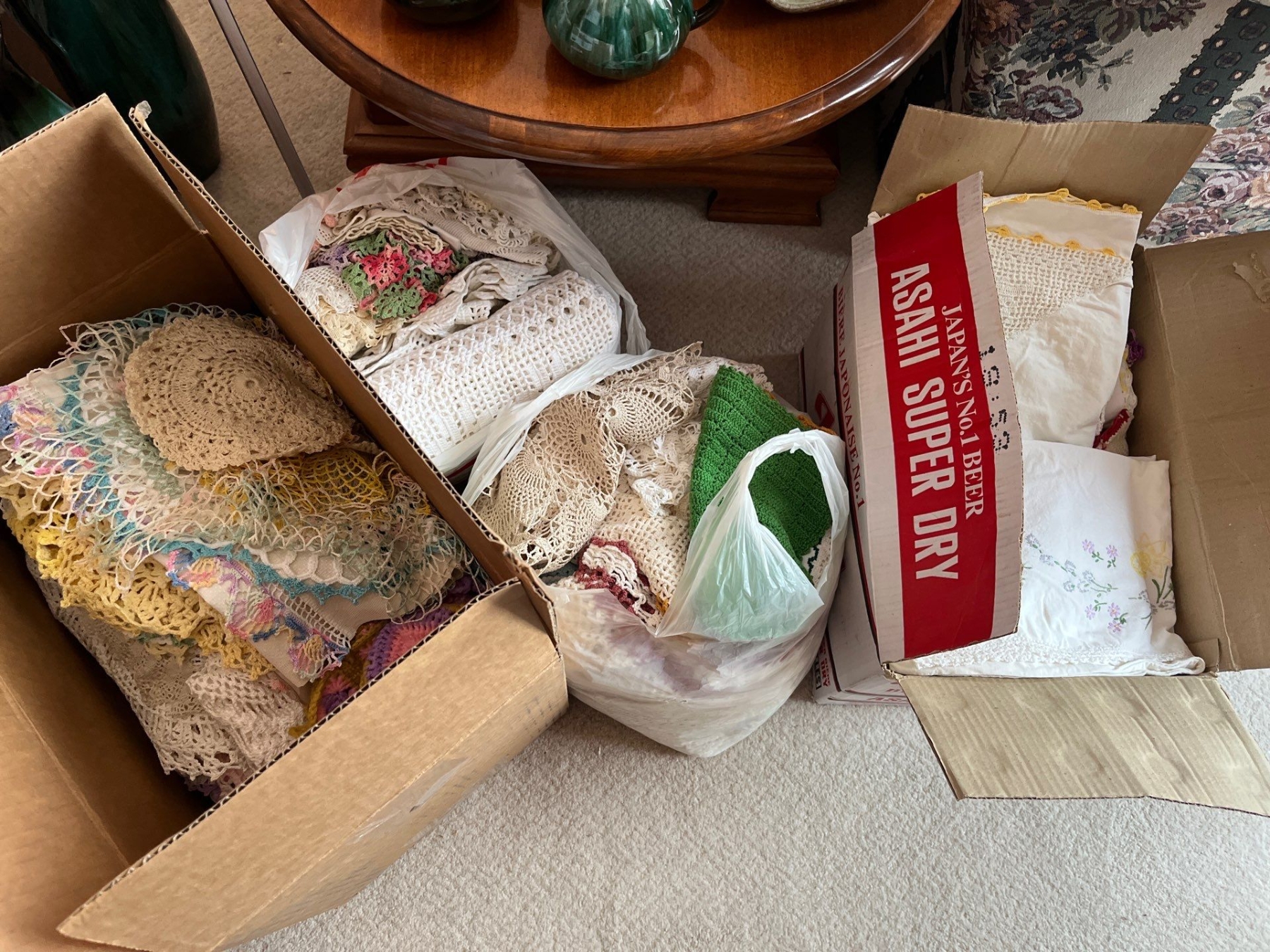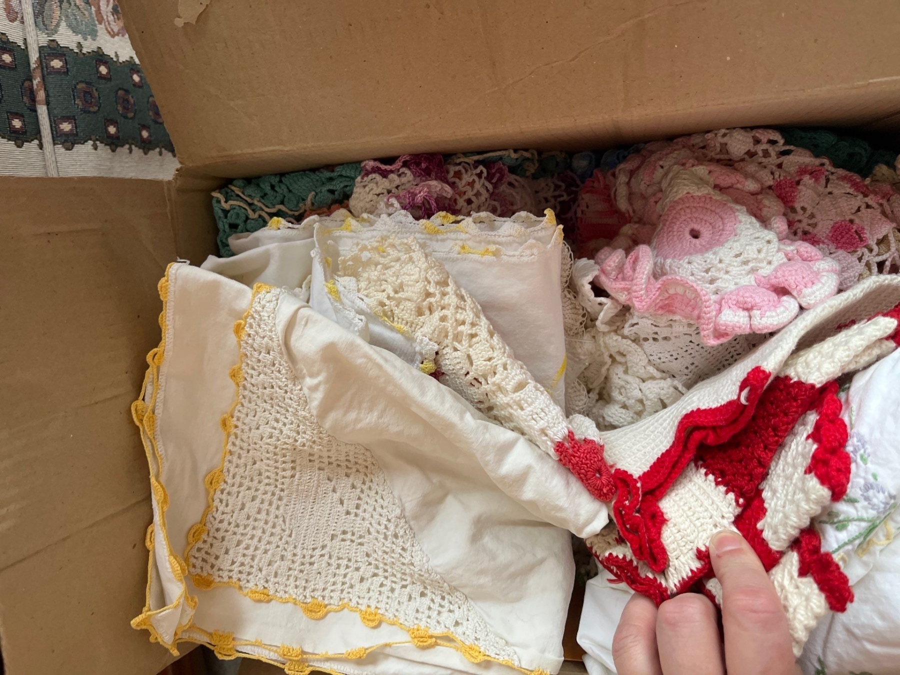 large collection of doilies tablecloth, napkins, all handmade with a variety of colors and styles