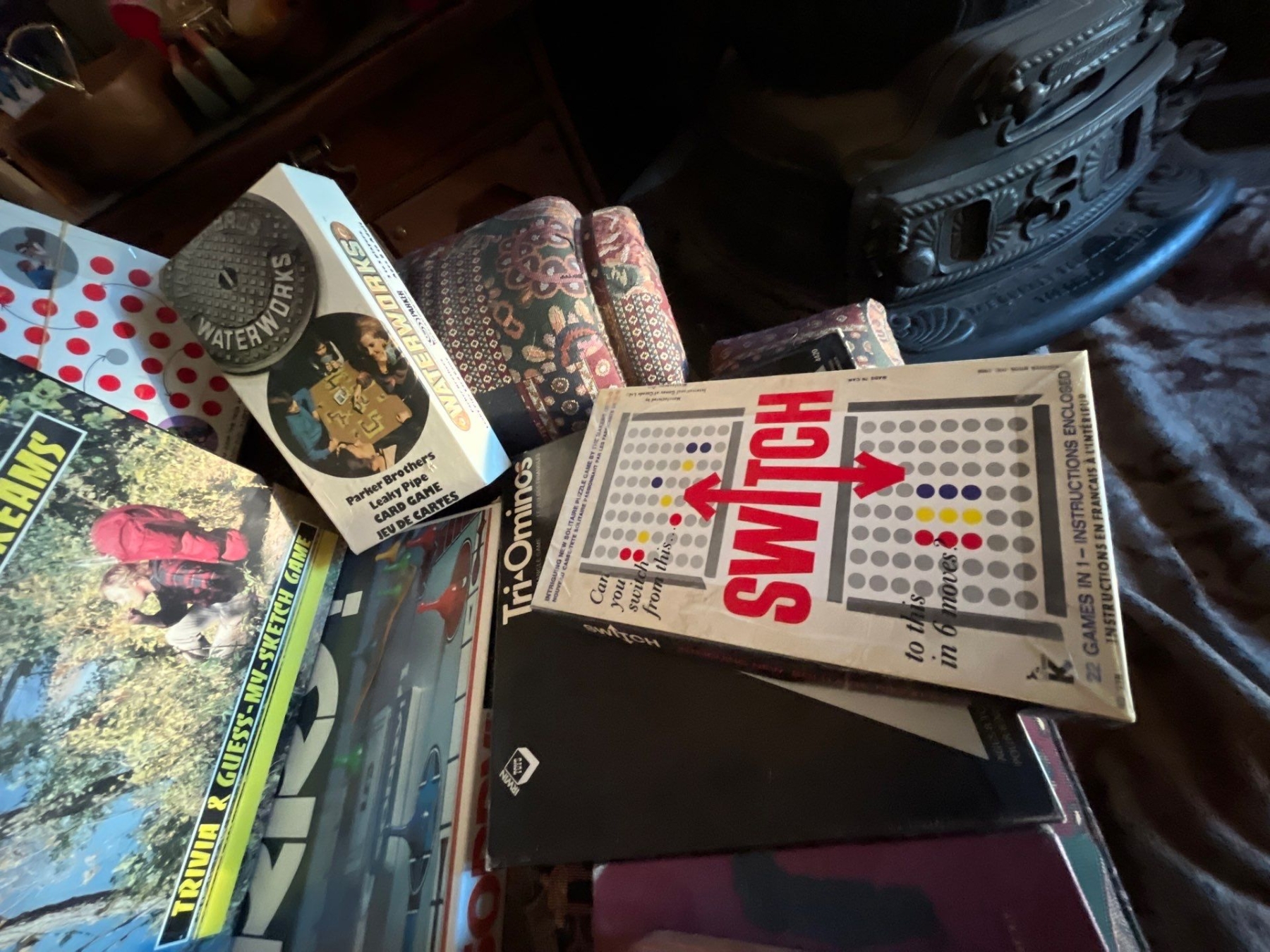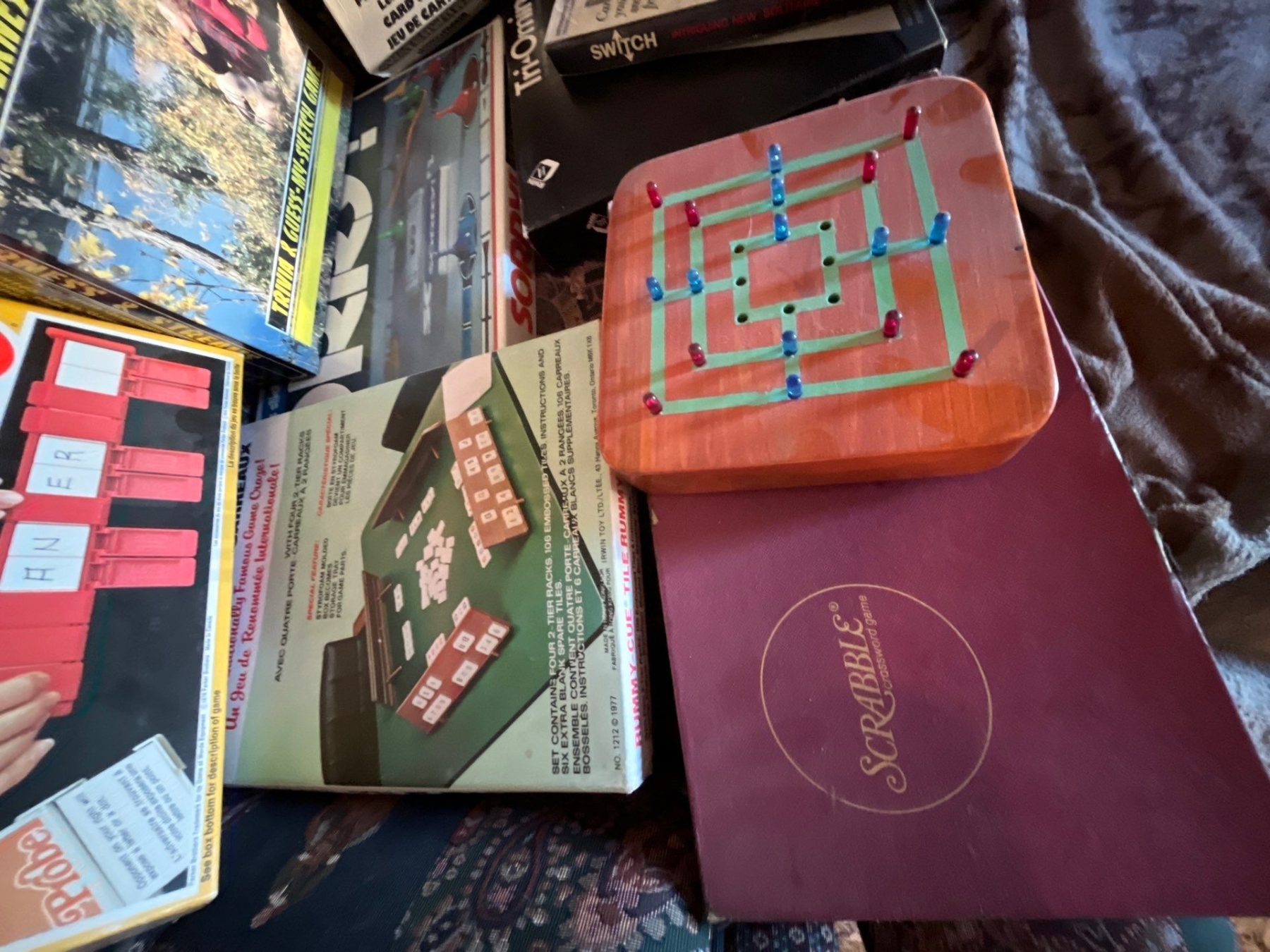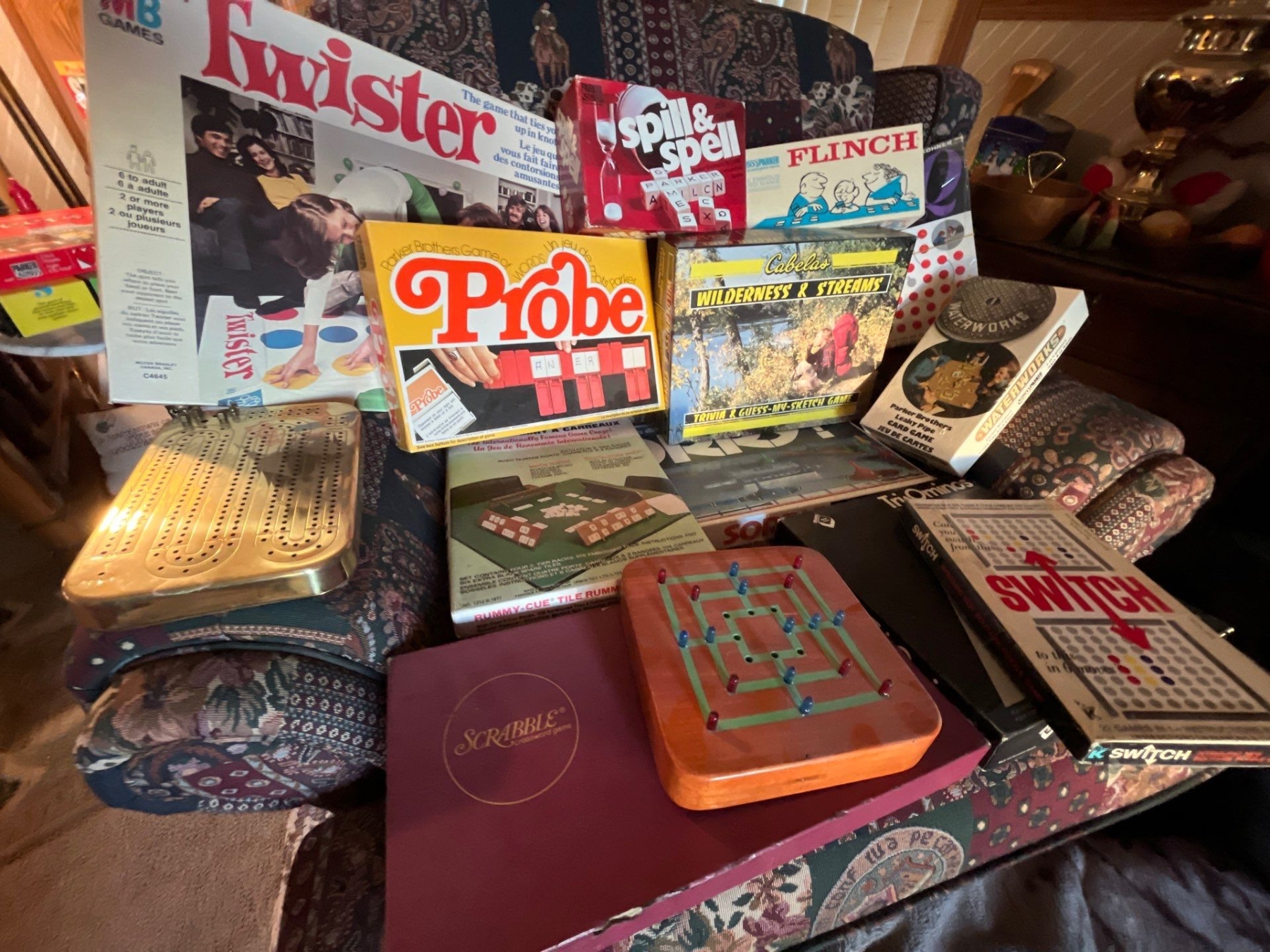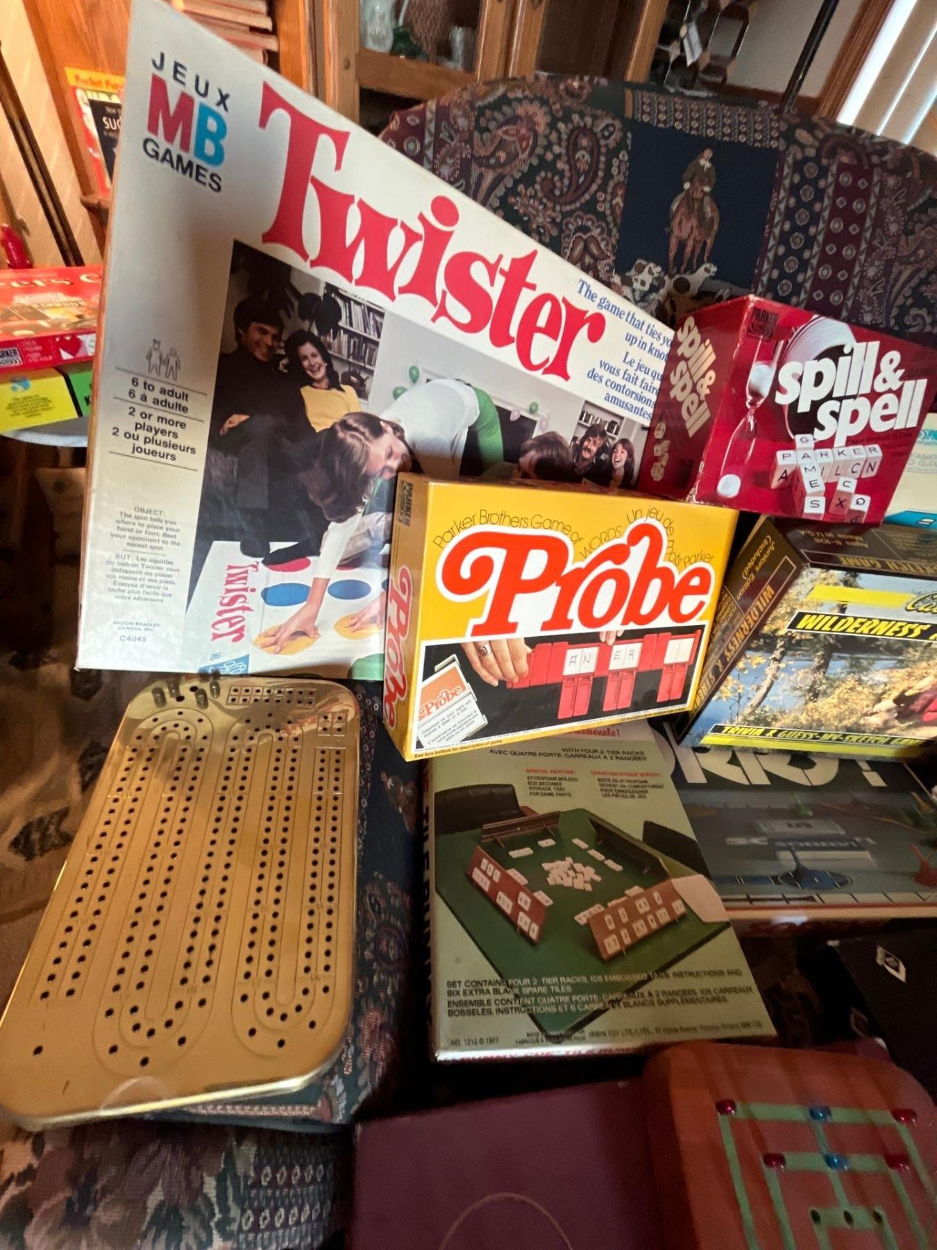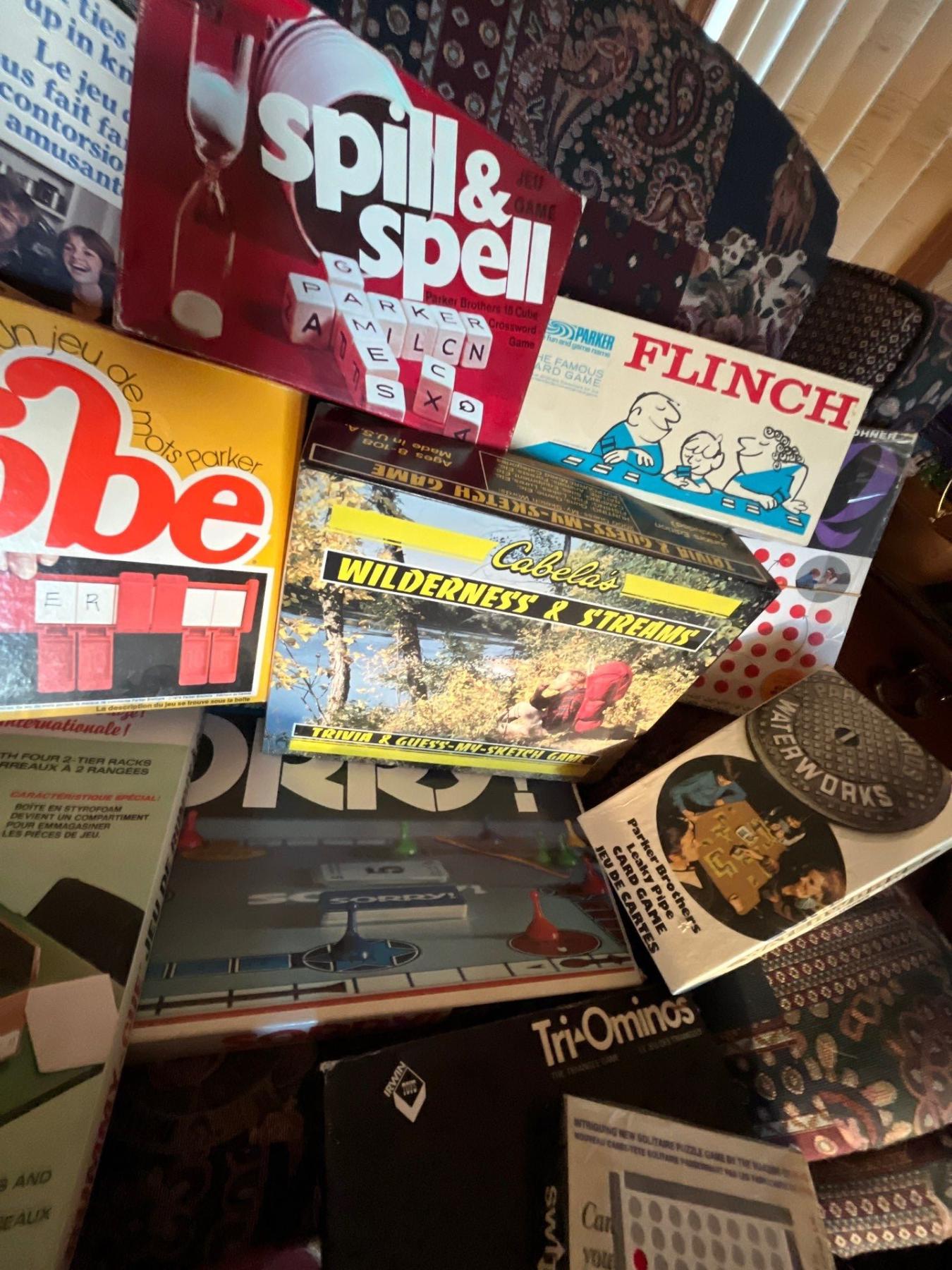 large collection of vintage games, twister spill and spell probe, flinch, scrabble sorry . Tri- ominous wilderness and streams. And cribbage.