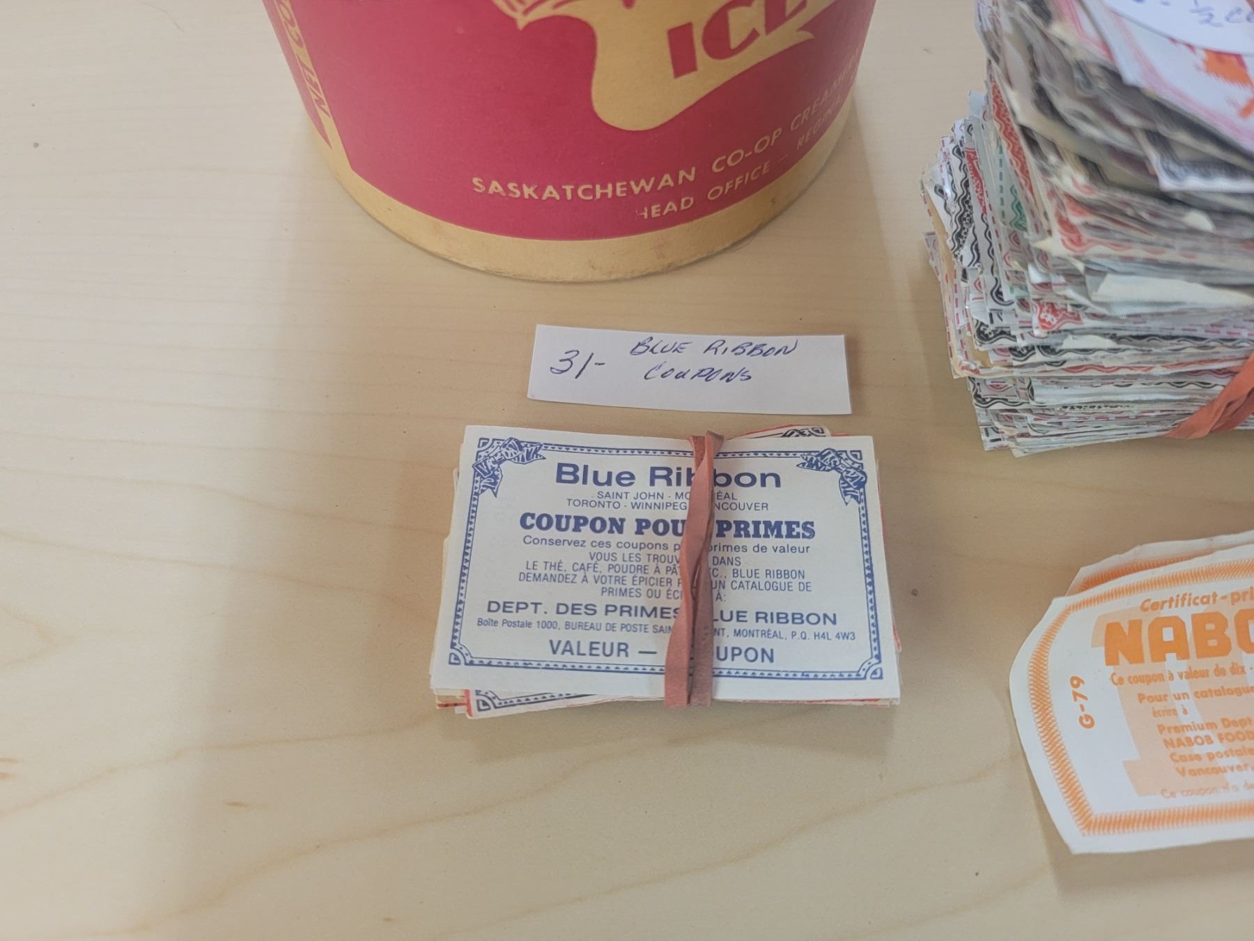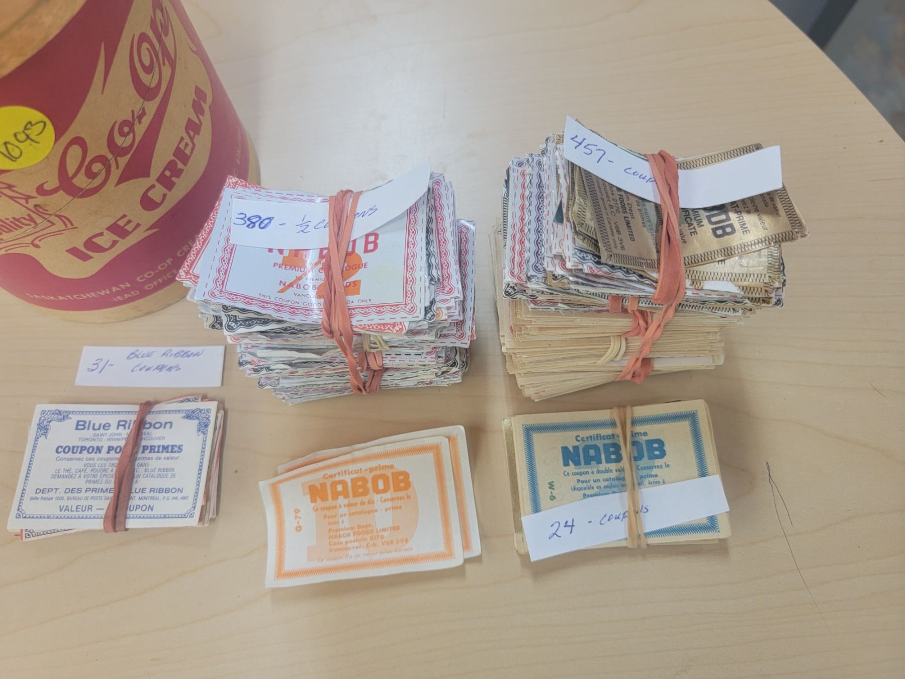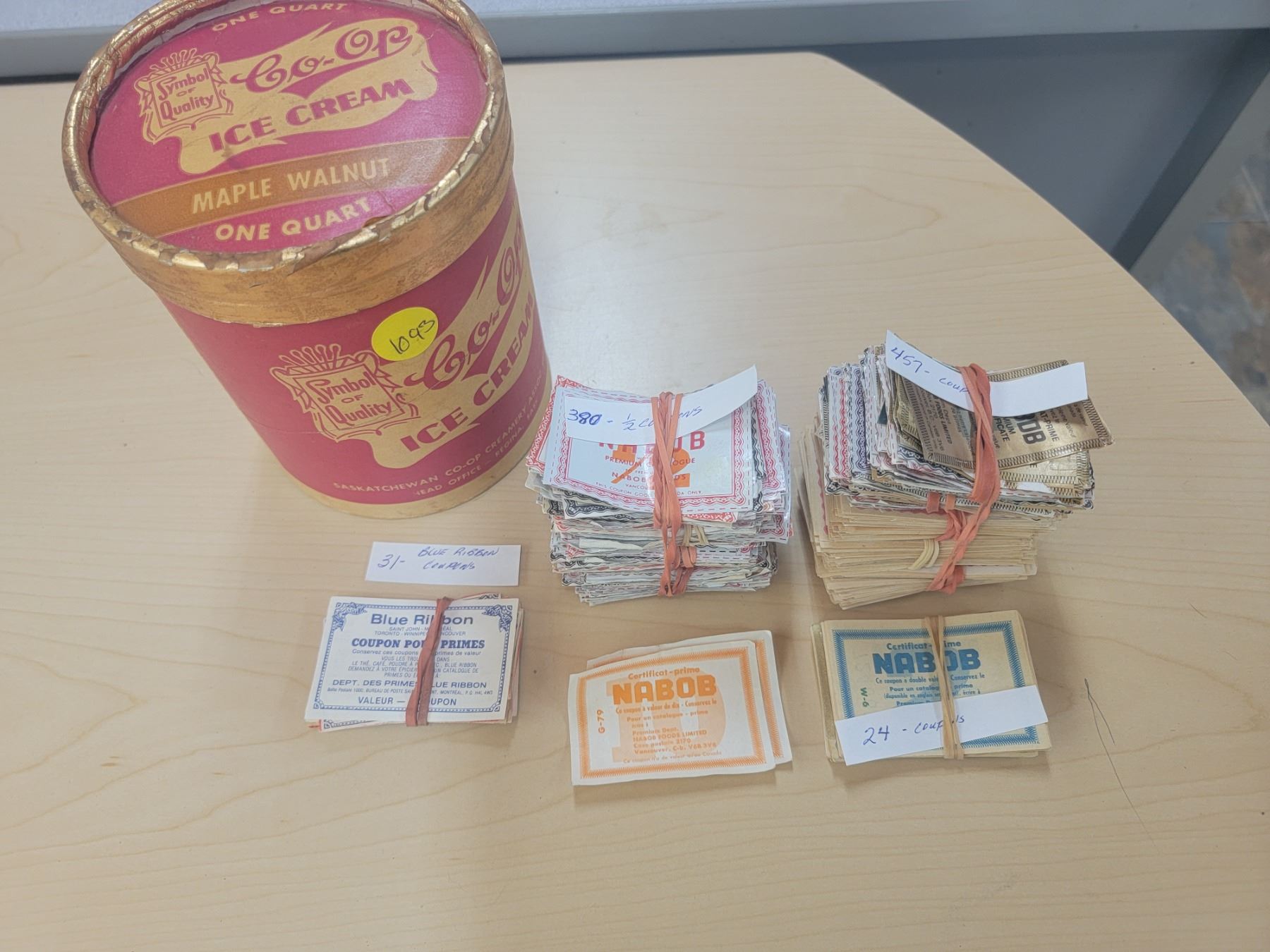 large lot of Nabob & Blue Ribbon coupons in Co-Op ice cream container