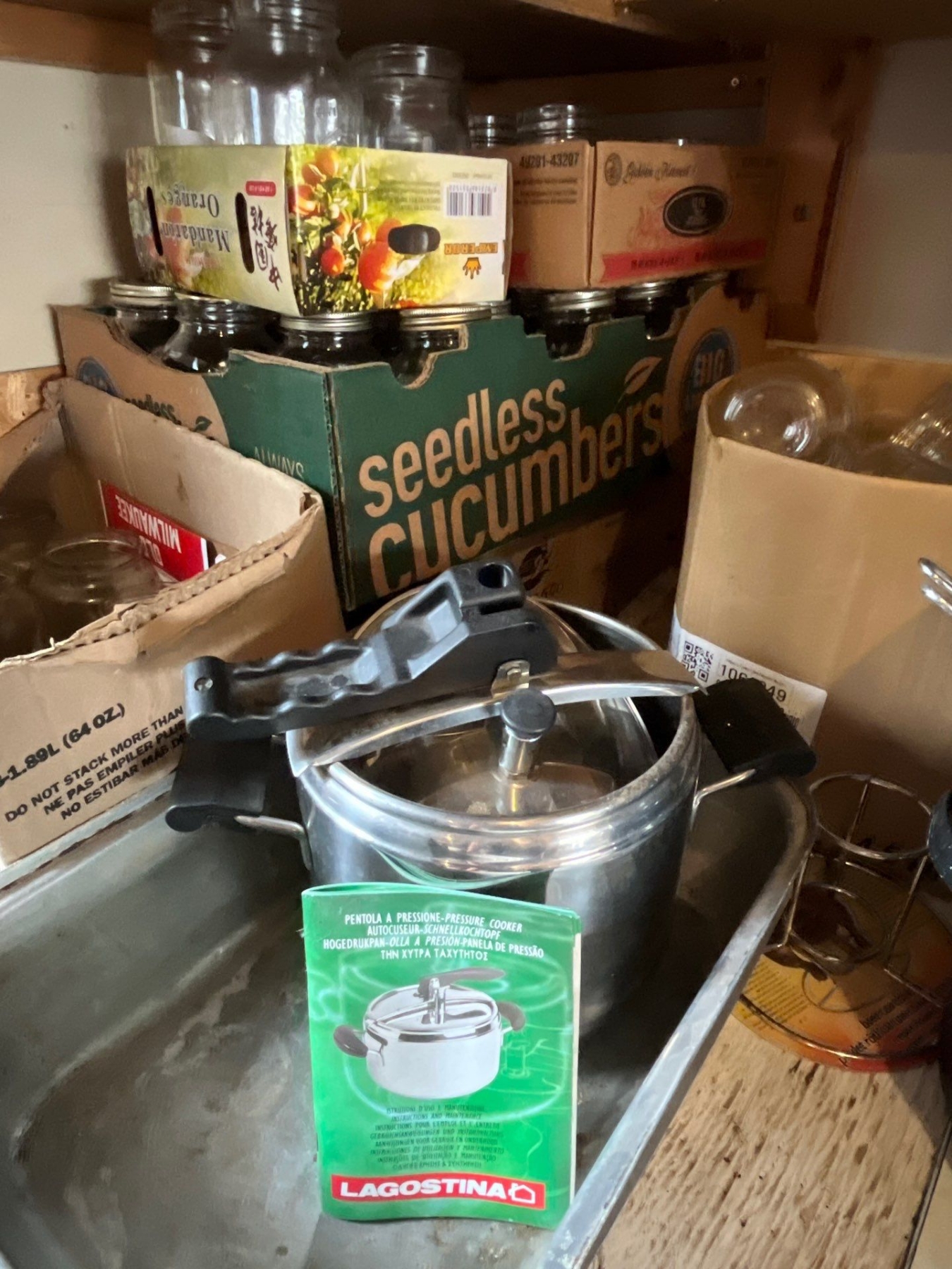 large selection of canning items, pressure cookers the original all metal squeeze, strainer, cannin