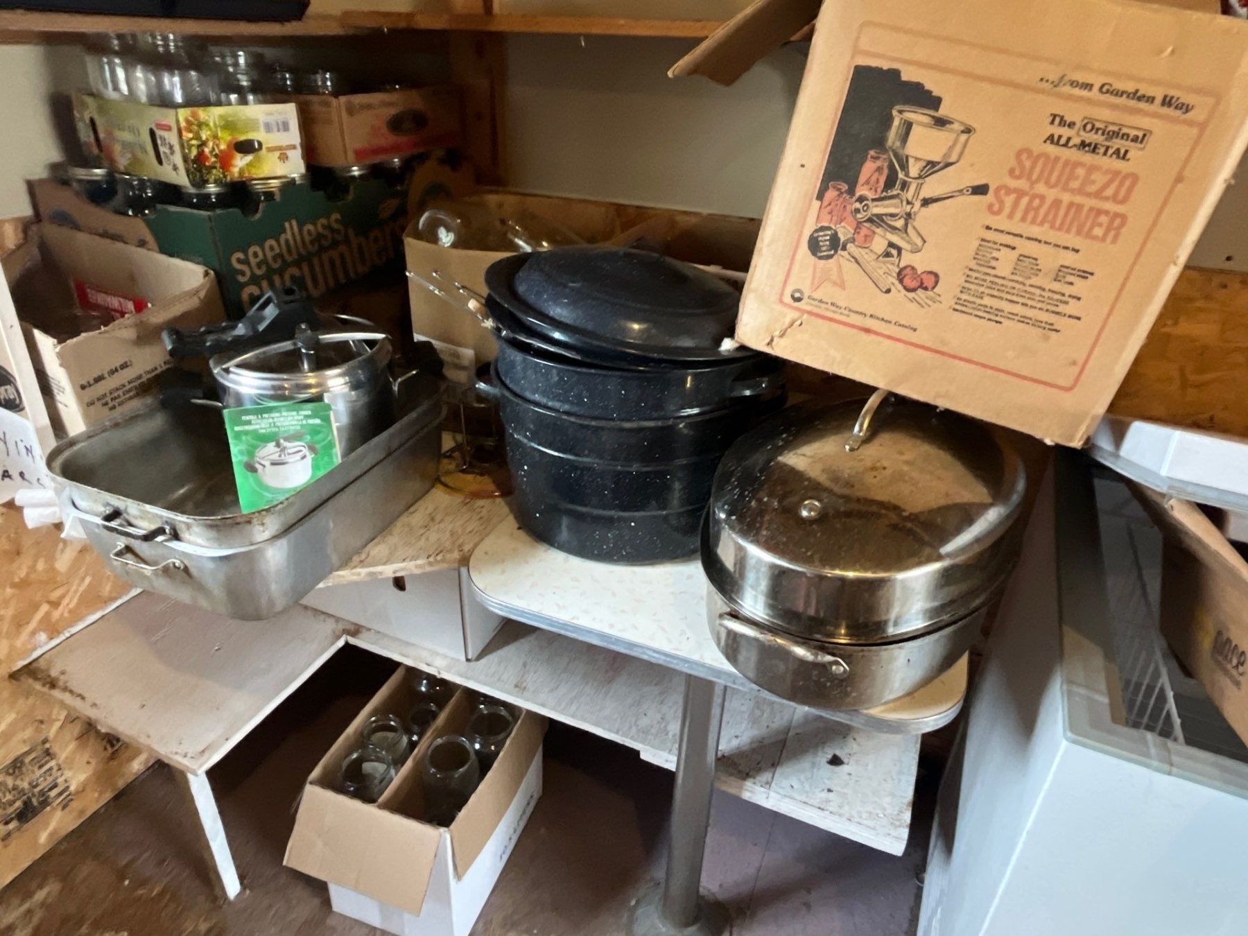 large selection of canning items, pressure cookers the original all metal squeeze, strainer, canning jars, and large stainless steel roaster