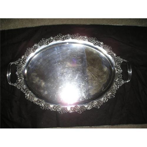 Very old silver-plate tray. Measures 17" wide and 25.5" long. There is a discoloration on the left side with a few minor stains. Nothing to take away from the brilliance of this exquisite piece.