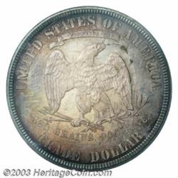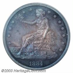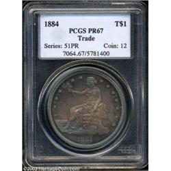 <table><tr><td><TABLE cellSpacing=0 cellPadding=0 width="100%" bgColor=#000000 border=0><TBODY> <TR><TD width="100%"><TABLE cellSpacing=1 cellPadding=3 width="100%" border=0><TBODY><TR><TD width="100%" bgColor=#79735c><FONT face=arial color=#ffffff size=3><B>Description</B> </FONT></TD></TR><TR><TD width="100%" bgColor=#ffffff><FONT face=arial size=2><B>1884 T$1 PR67 PCGS.</B></I> The history of the United States Trade Dollar is one that is checkered with abuses, misuses, and deceit. More than 40 years ago a definitive history was written of the Trade Dollar by John Willem. The subtitle of Willem's book sums up the coin's status: <I>America's Only Unwanted, Unhonored Coin.</B></I> Originally intended as a competitive coin for the Mexican 8-reales and also as an additional outlet for Comstock silver, the coin's questionable legal status coupled with declining silver prices in the mid to late 1870s resulted in a tarnished image for the Trade Dollar. But in the century since, it has become one of the most popular and collectible coins in all of American numismatics. <BR>Production of business strike Trade Dollars ceased in 1878, but proofs continued to be available on an individual basis from the Mint for $1.25. Most of the known 1884 Trade Dollars surfaced in 1908, having originated with William Idler. It has been assumed since that these mysterious rarities (both the 1884 and 1885) were a "nighttime operation;" that is, specimens that were clandestinely produced after hours using hubs and punches available in the die cutter's workroom. However, in June, 1988 Carl Carlson of Stack's revealed in the Sprinkle catalog new information he had gleaned from A.W. Stroub's <I>Die Record Book.</B></I> Carlson's write-up is in-depth and convincing, and we refer anyone interested in this lot to refer to his article on page 26 of the Sprinkle catalog. The upshot of his research is that the 1884 Trade Dollars were, in fact, proper coins that were properly struck under proper authority. The effect of such information is that it adds legitimacy to this issue, a date that has lived under a clandestine cloud for nearly a century. Because the ten coins struck were properly prepared and properly receipted within the Mint, the 1884 Trade Dollar is a <B>legitimate issue</B></I> and the next logical date extension of the proof-only issues of 1879-83. <BR>As mentioned, William Idler is responsible for distributing most of the known 1884 Trade Dollars early last century. A roster of known specimens is as follows:<BR><BR>1) The Dunham/Starr specimen (offered here), the Finest Known. Ex. mint official, probably Col. A. Louden Snowden; William Idler; Capt. John W. Haseltine; unknown; William Forrester Dunham and sold with his collection to B. Max Mehl in 1939; Mehl's inventory; Mehl's 1941 sale of the William Forrester Dunham Collection, lot 1150, $315; Floyd T. Starr; Stack's sale of the Starr Collection, October 21, 1992, lot 844; Goldberg's California Sale, lot 1784, where it had been certified by both NGC (#900003-011) and PCGS as PR67 and realized $510,600.<BR><BR>2) The Newcomer/Carter coin (as above, Snowden, Idler, Haseltine) Waldo Newcomer to Colonel E. H. R. Green; B. G. Johnson around 1943; B. Max Mehl Jack Roe sale, June 12, 1945, lot 627; B. Max Mehl Jerome Kern sale, May 23, 1950, lot 896; Stack's Amon G. Carter, Jr. sale, January 18, 1984, lot 440.<BR><BR>3) The Atwater/Eliasberg coin Snowden; Idler; Haseltine; B. Max Mehl Atwater sale, June 11, 1946, lot 377 to the Eliasberg Collection; Bowers and Merena Galleries, April 1997, lot 2353.<BR><BR>4) The Menjou/Wolfson coin as above, Abe Kosoff Adolphe Menjou sale, June 15, 1950, lot 2040; Stack's Farish-Baldenhofer sale, November 11, 1955, lot 1039; Stack's Fairbanks sale, December 10, 1960, lot 698; Stack's Samuel Wolfson sale, May 3, 1963, lot 1541; Abner Kreisberg/ Carlson-Shipkey sale, November 8, 1976, lot 426; Bowers and Merena's Arnold-Romisa sale, September 17, 1984, lot 2342; Stack's French Family sale, January 18, 1989, lot 201.<BR><BR>5) The Farouk/Norweb coin as above, Sotheby's Palace Collections sale, February 1954, lot 1679; Bowers and Merena Norweb II sale, March 24, 1988, lot 1847; Heritage Silverman Collection. April 25, 2002, certified PCGS PR63, where it realized $138,000.<BR><BR>6) The Marks/Herstal coin as above, Virgil M. Brand estate; Bowers and Ruddy RCR 15; Bowers and Ruddy Stanislaw Herstal sale, February 7, 1974, lot 734.<BR><BR>7) The 1976 ANA coin as above, Stack's sale, as part of a complete proof set of the year.<BR><BR>8) The Neil/Pelletreau coin as above, B. Max Mehl, Will Neil sale June 17, 1947, lot 296; Stack's Robert Pelletreau sale, March 6, 1959, lot 1054; NERCA/NENA Convention sale, November 7, 1975, lot 635; Hanks & Associates, April 20, 1985 sale, lot 351; RARCOA auction '89, lot 327; Superior Auction '90, lot 1163.<BR><BR>9) The Olsen/Ewalt coin as above, B. Max Mehl/ Fred E. Olsen sale, November 7, 1944, lot 997; Stack's George S. Ewalt sale, November 22, 1965, lot 42, Stacks' Dr. C.L. Emmons sale, September 19, 1969, lot 814, Ivy ANA Convention sale., August 18, 1980, lot 1809; RARCOA Auction '84, lot 1809; Superior L.W. Hoffecker sale, February 8, 1987, lot 1446A; Goldberg's Kardatzke sale, February 2000, lot 1470.<BR><BR>10) The Colonel Green/Kelly coin Colonel E. H. R. Green estate; B.G. Johnson; James Kelly (1943-44) Frank Sprinkle; Stack's Frank Sprinkle sale, June 21, 1988, lot 461; RARCOA Auction '90, lot 845.<BR>Of the pedigreed examples of the 1884 Trade Dollar, only the Eliasberg coin could possibly rival the quality of this magnificent specimen. Once described by B. Max Mehl as a "beautiful perfect brilliant proof," the surfaces acquired over the next half century concentric layers of toning dominated by varying amounts of electric-blue iridescence at the borders that frames interior shades of golden-rose and steel-gray.<BR>A truly unique opportunity to obtain an American numismatic classic, the si