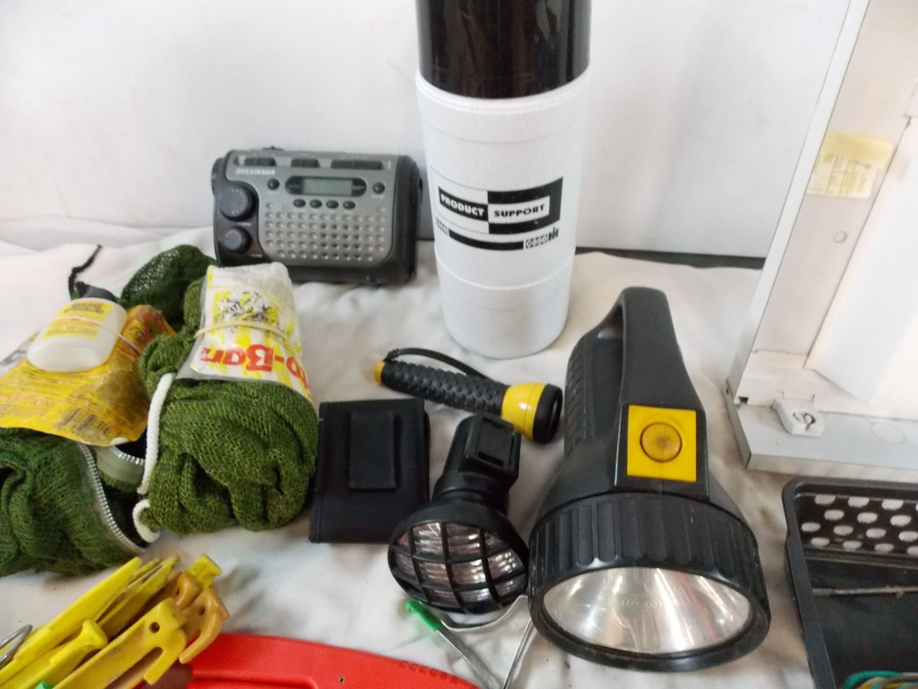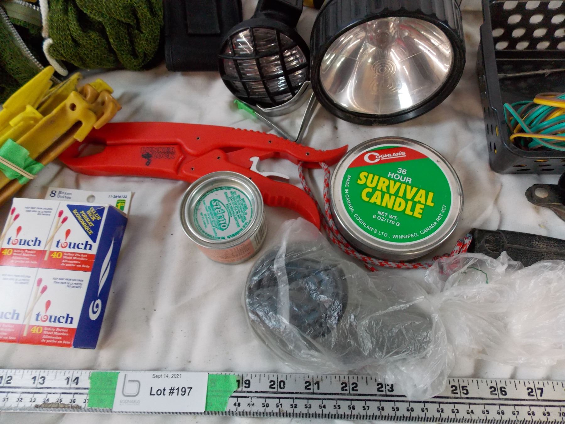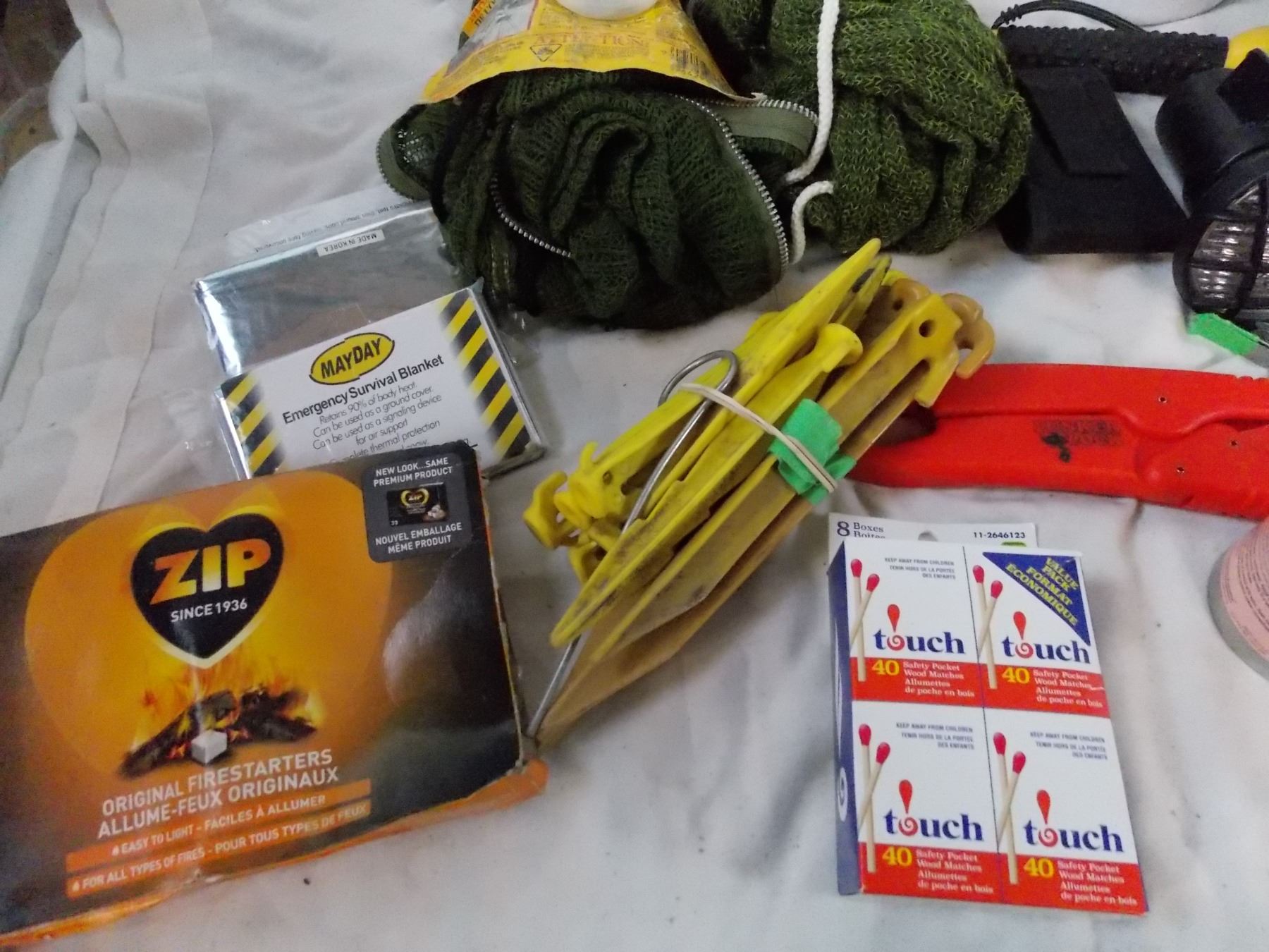 light, flash lights, netting, matches, radio, filleting knife, fish grip