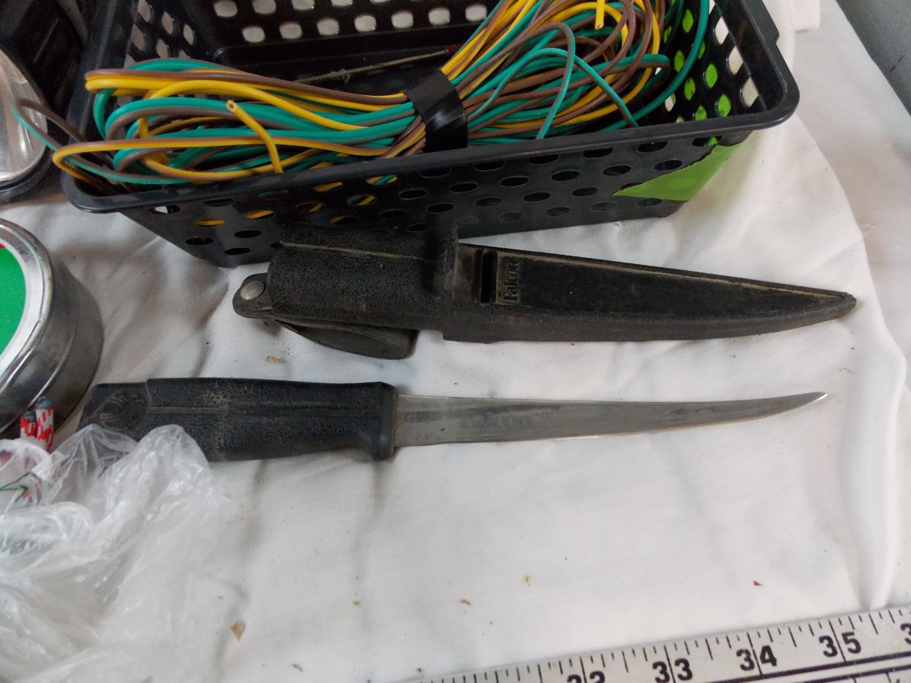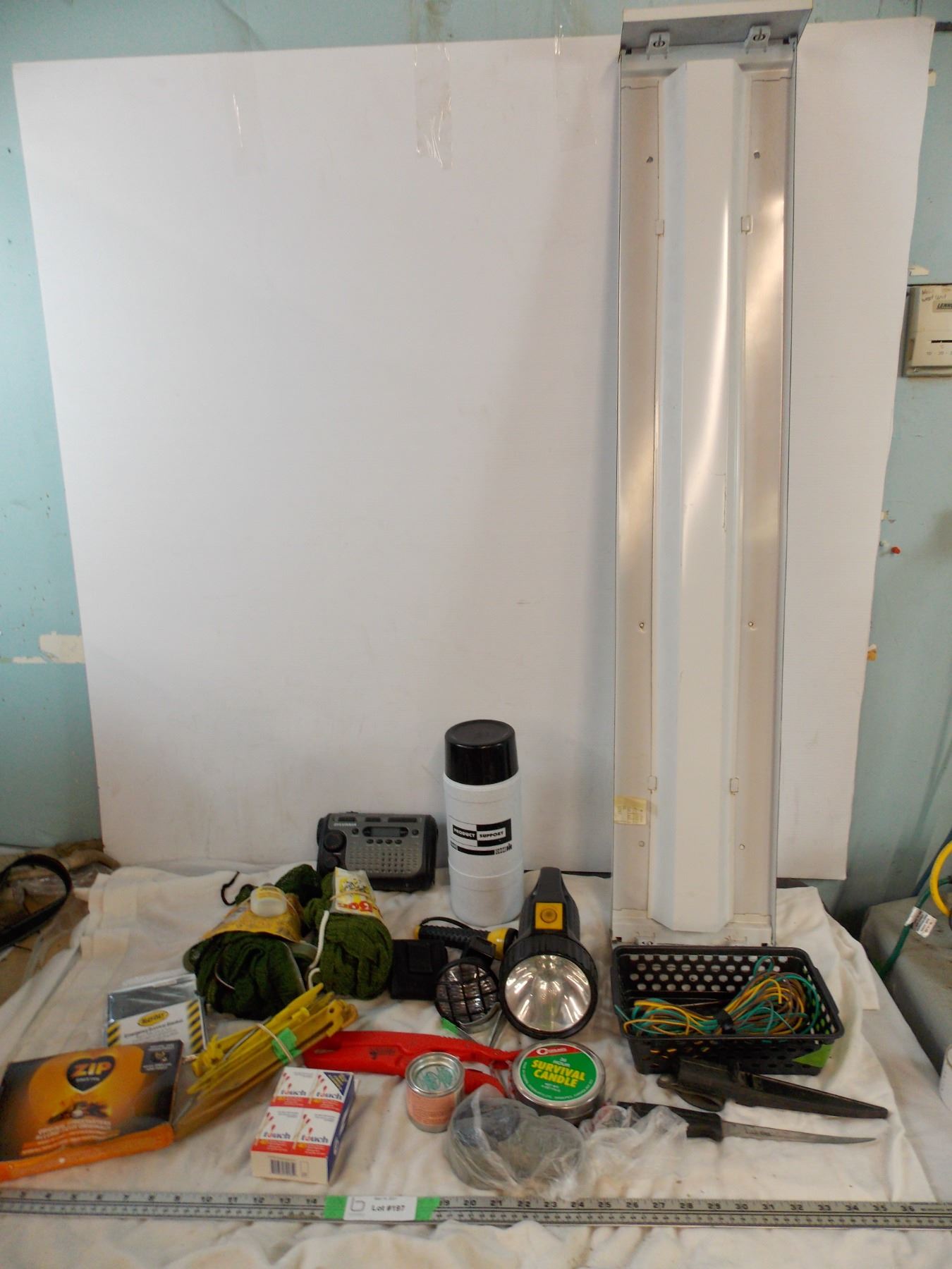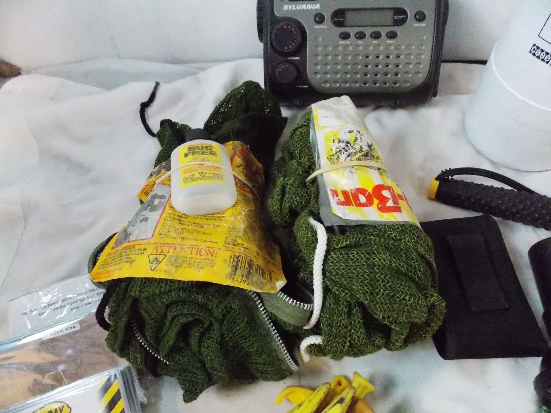 light, flash lights, netting, matches, radio, filleting knife, fish grip