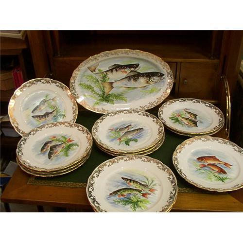 19 century Limoges fish set . a platter 15x9.5 and 12 plates , different kind of fish on each plate , diameter 9.5 , gilded decor . signed . mint condition .