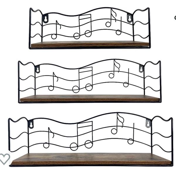 Three-piece wall-mounted shelves with unique musical note design, new. Wood and metal construction, ideal for displaying small items, new.