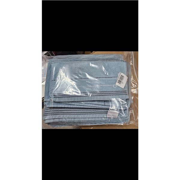 Soft blue towel set of 6, 2 bath towels, 2 hand towels, 2face clothes, decorative borders, packaged, absorbent, easy-care, suitable for bathroom, new