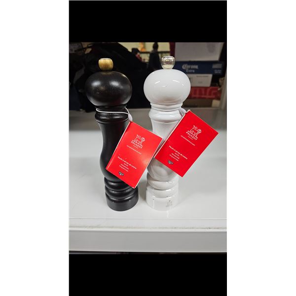 Black and white wooden salt and pepper mills, classic design with metal accents, kitchen essentials, new.