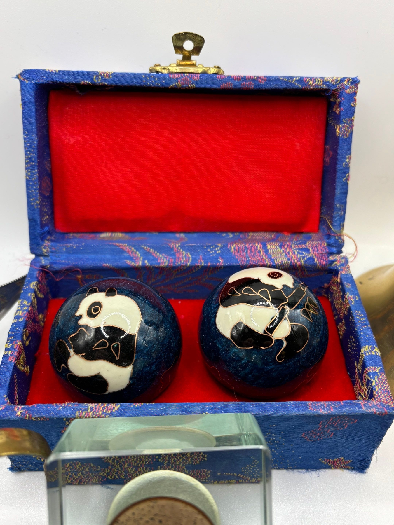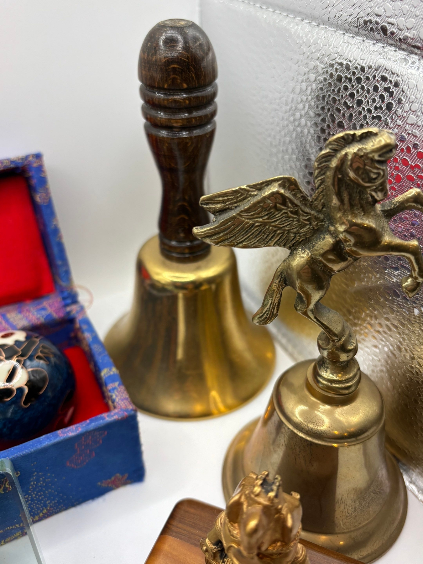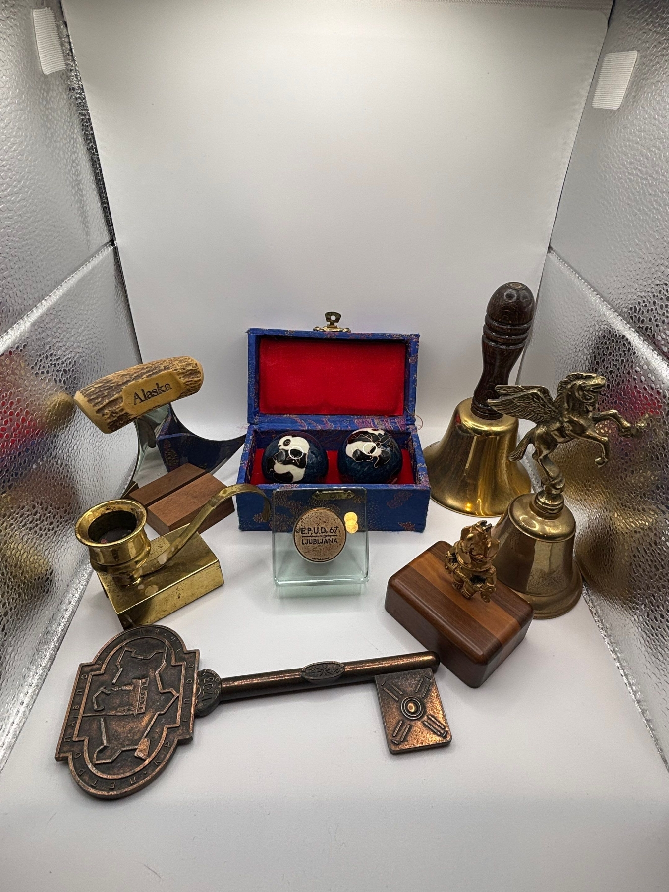 collection of brass bells, and other collectables along with set of medicine balls n21