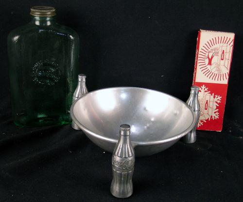 lot of 3 "Coca-Cola" items: aluminum ice dish with bottle shaped legs...refrigerator water bottle and an 8" gold thermometer in the original box...