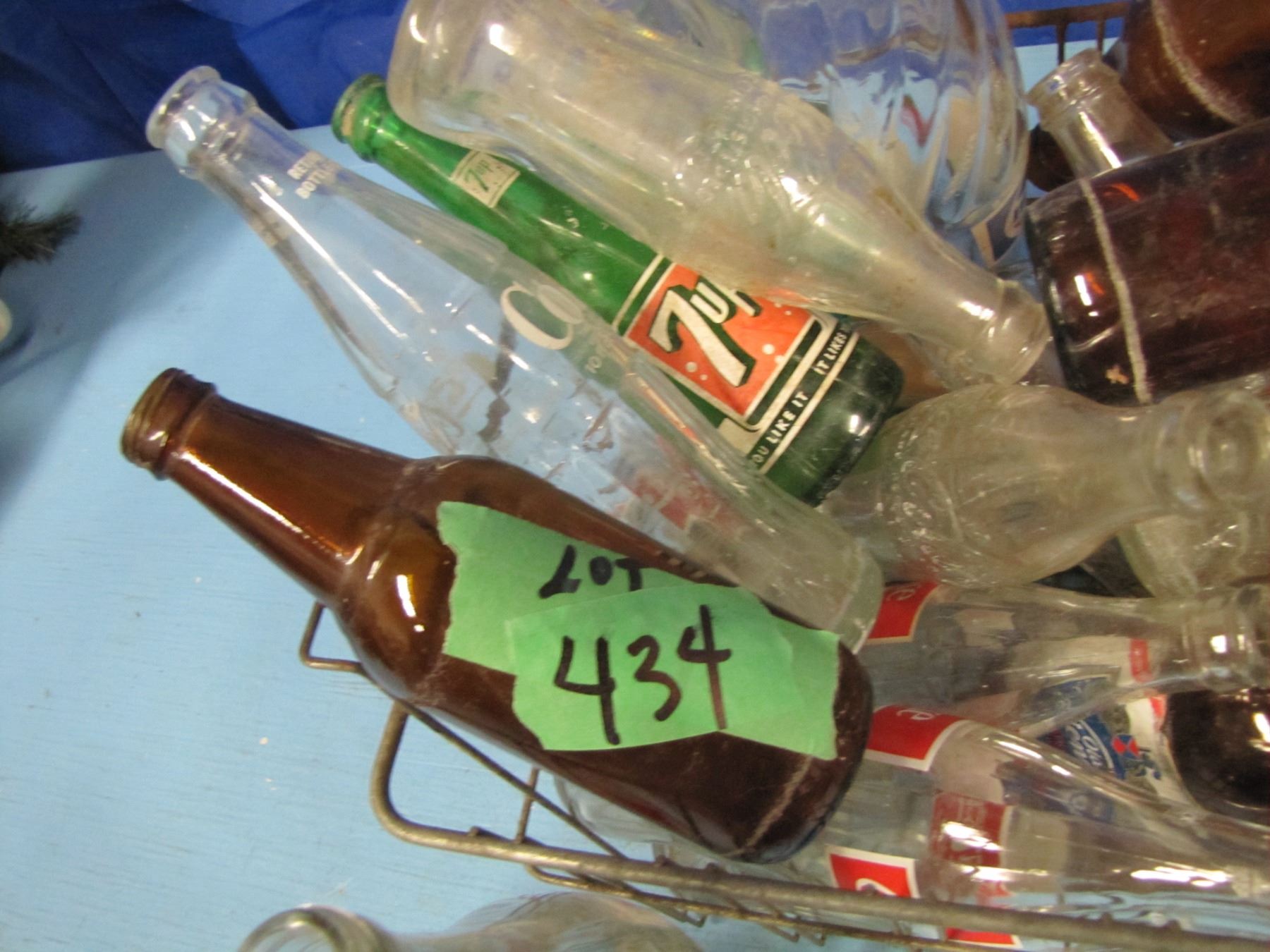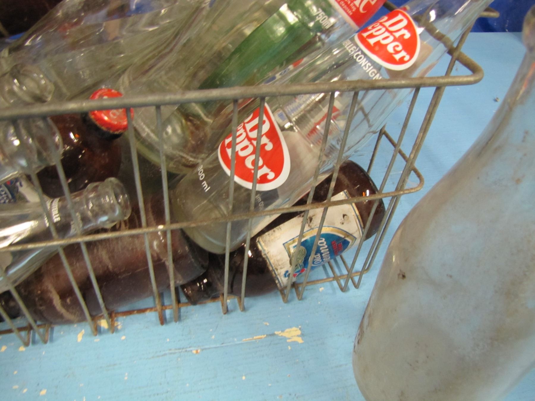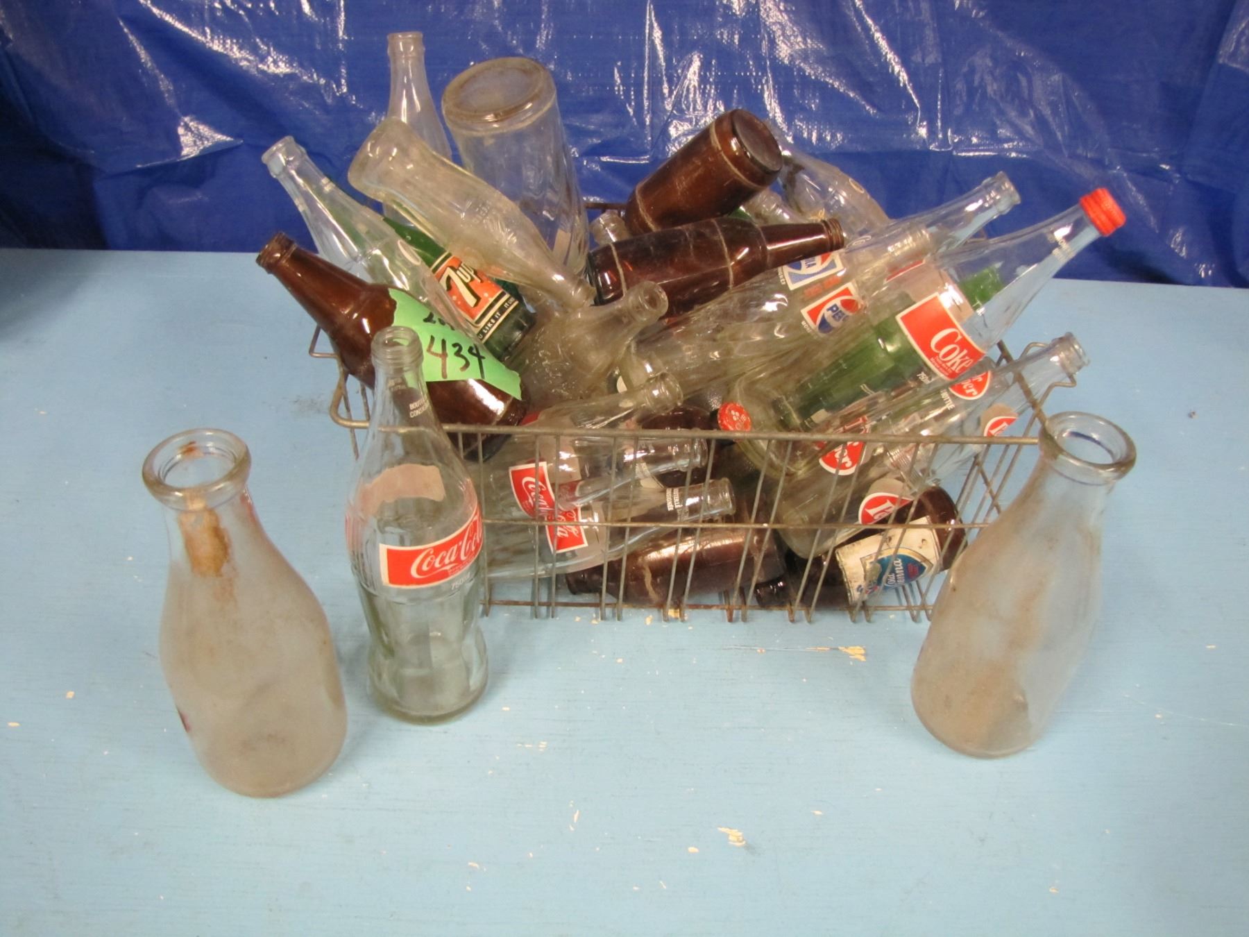 lot of assorted drink bottles, Coke, 7UP, milk bottles etcetera
