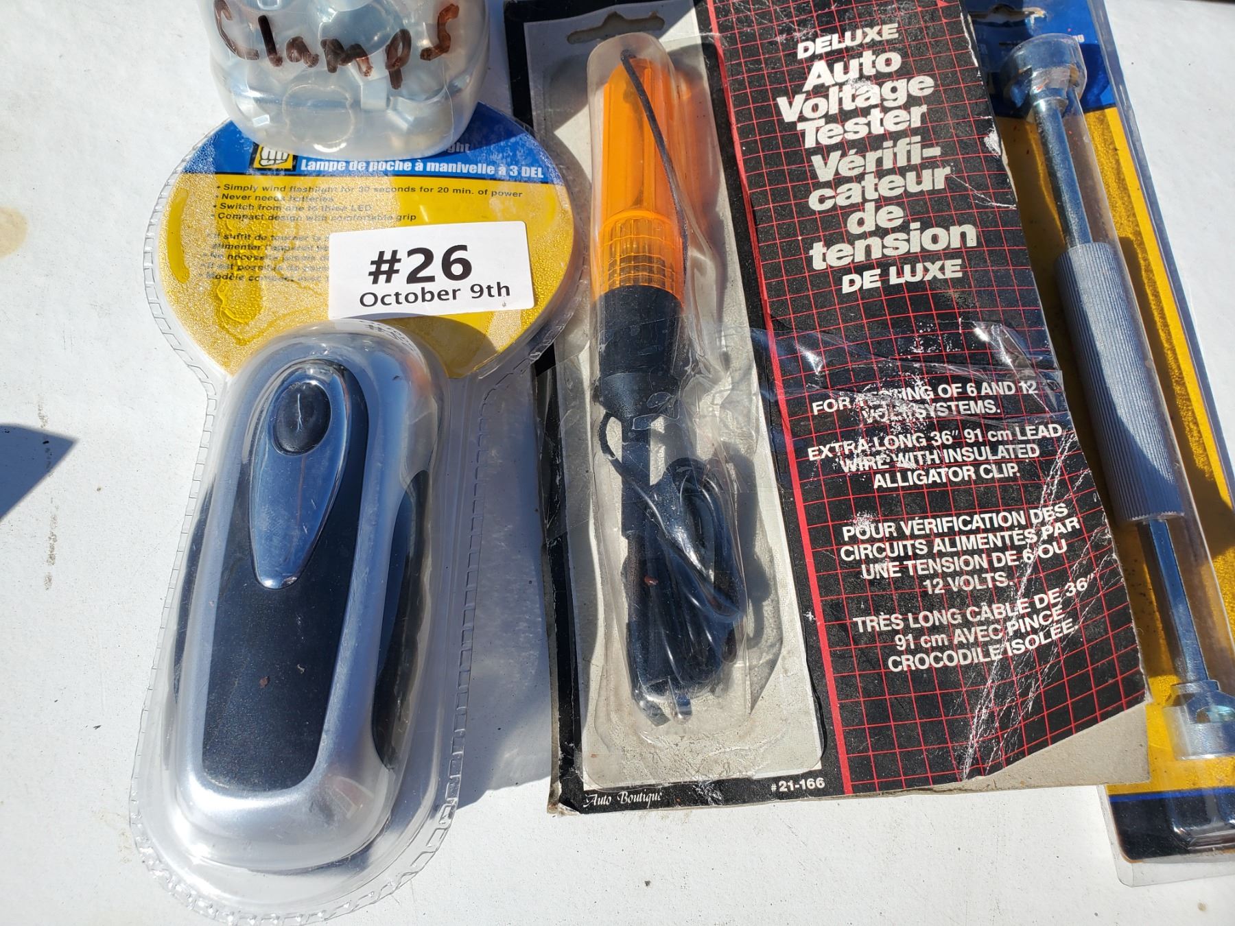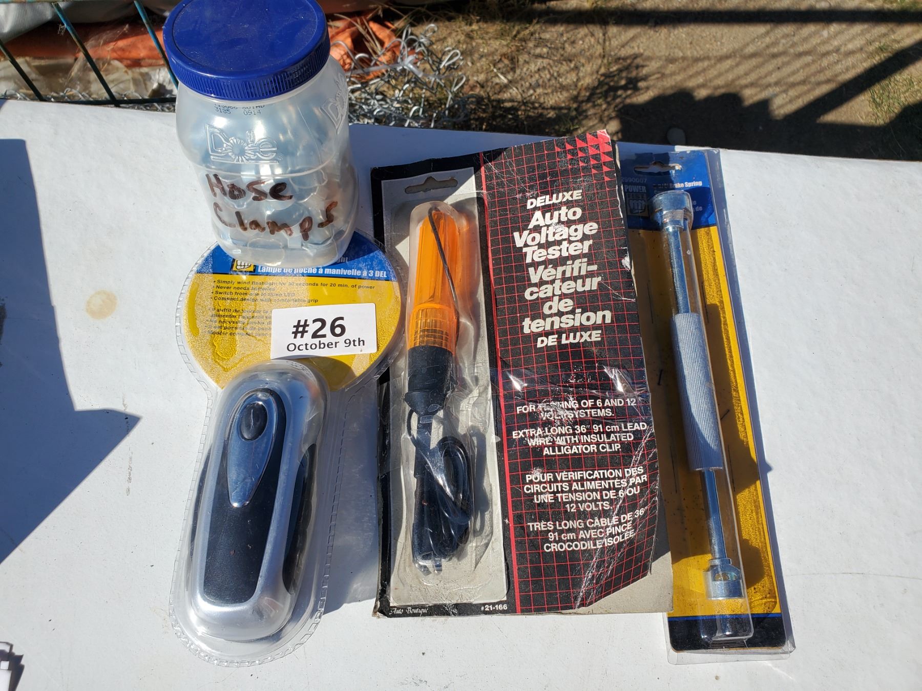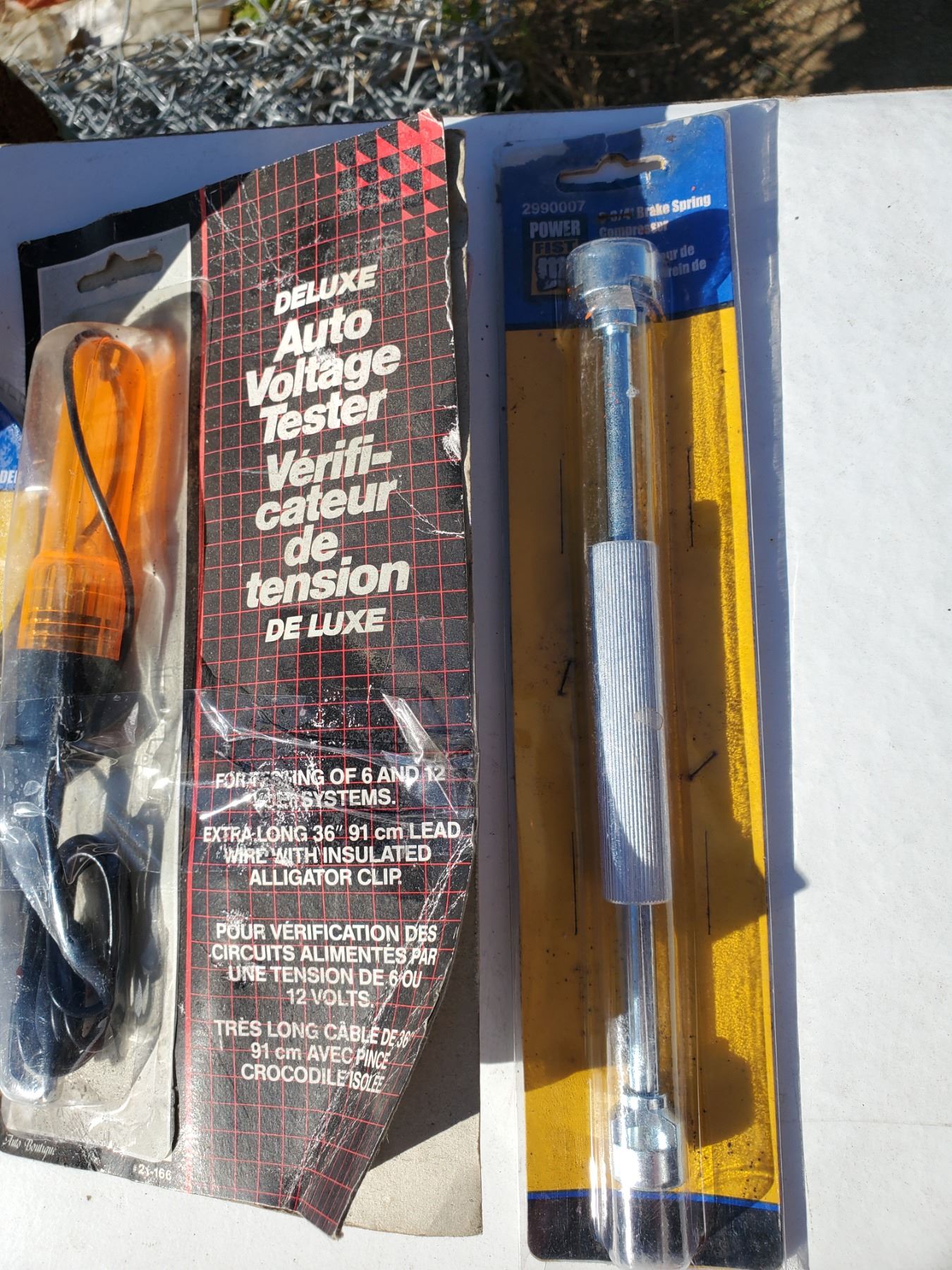 lot of assorted hose clamps, voltage testers, brake spring tool, etc.