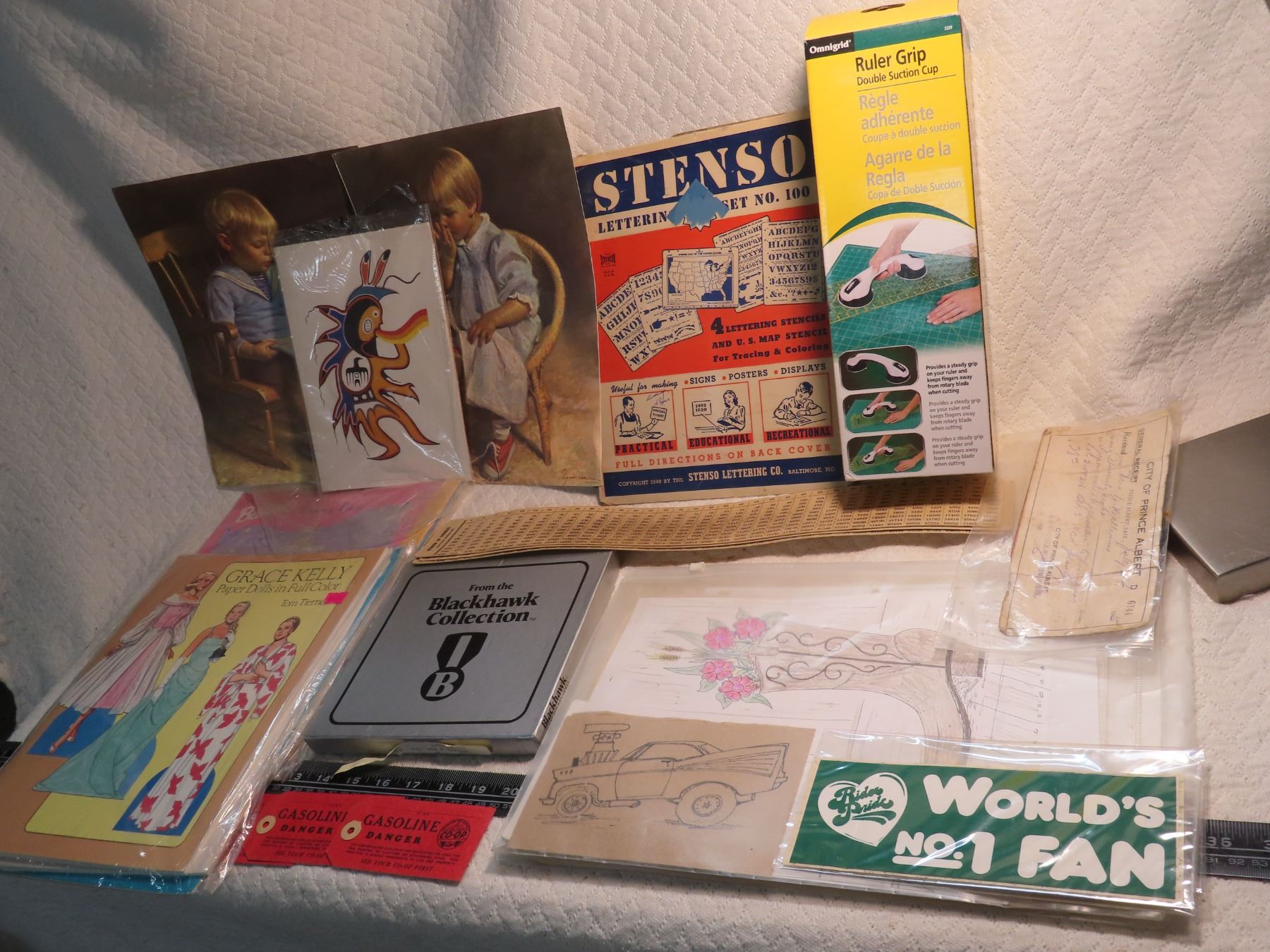 lot of collectible artifacts, paperwork, stencils, crafts