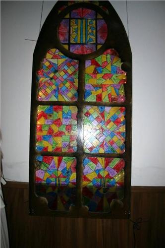 (lot) set/scene - 3 nuns wax figures. Includes stained glass window paneling.
