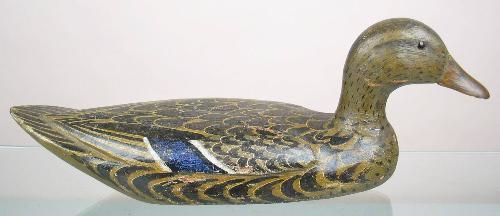 SUPERB mallard hen swimmer by Mitchell Lafrance ca. 1935. Made with glass eyes and raised carved wings that join over the tail. Rectangular lead weight. Near perfect, Struck by a few shot. Outstanding form. Probably made in New Orleans. Cypress root construction.