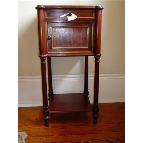 lovely mahogany bed side commode , marble top with outlet corners above a small drawer and marble lined cupboard , raised on fluted legs connected by a low shelf and ending in toupie feet , early 19 century .