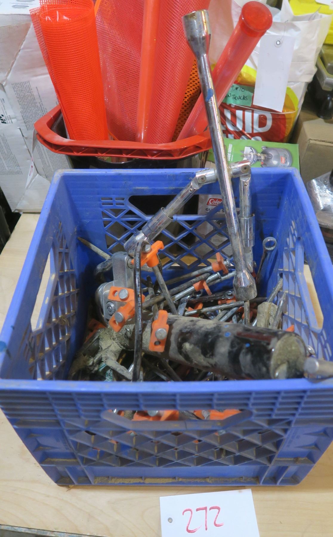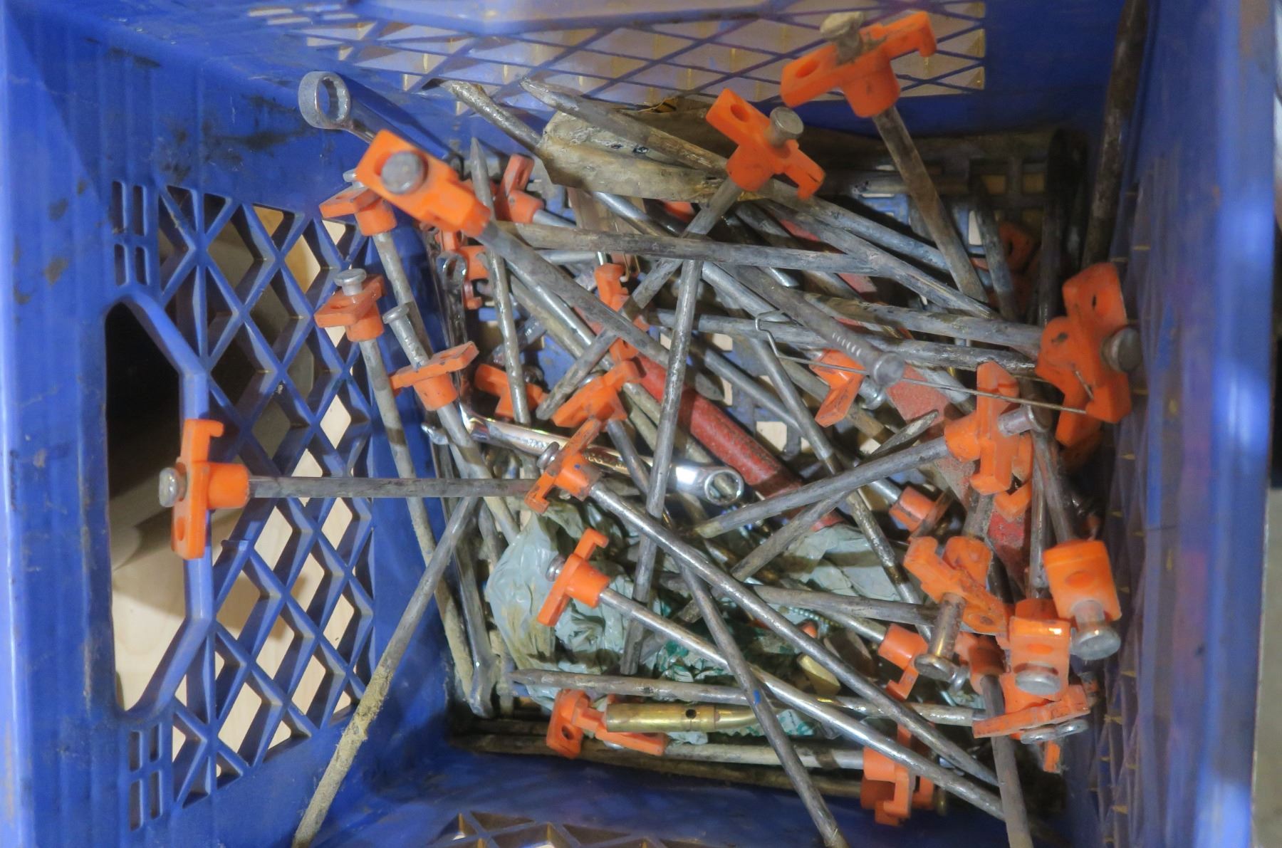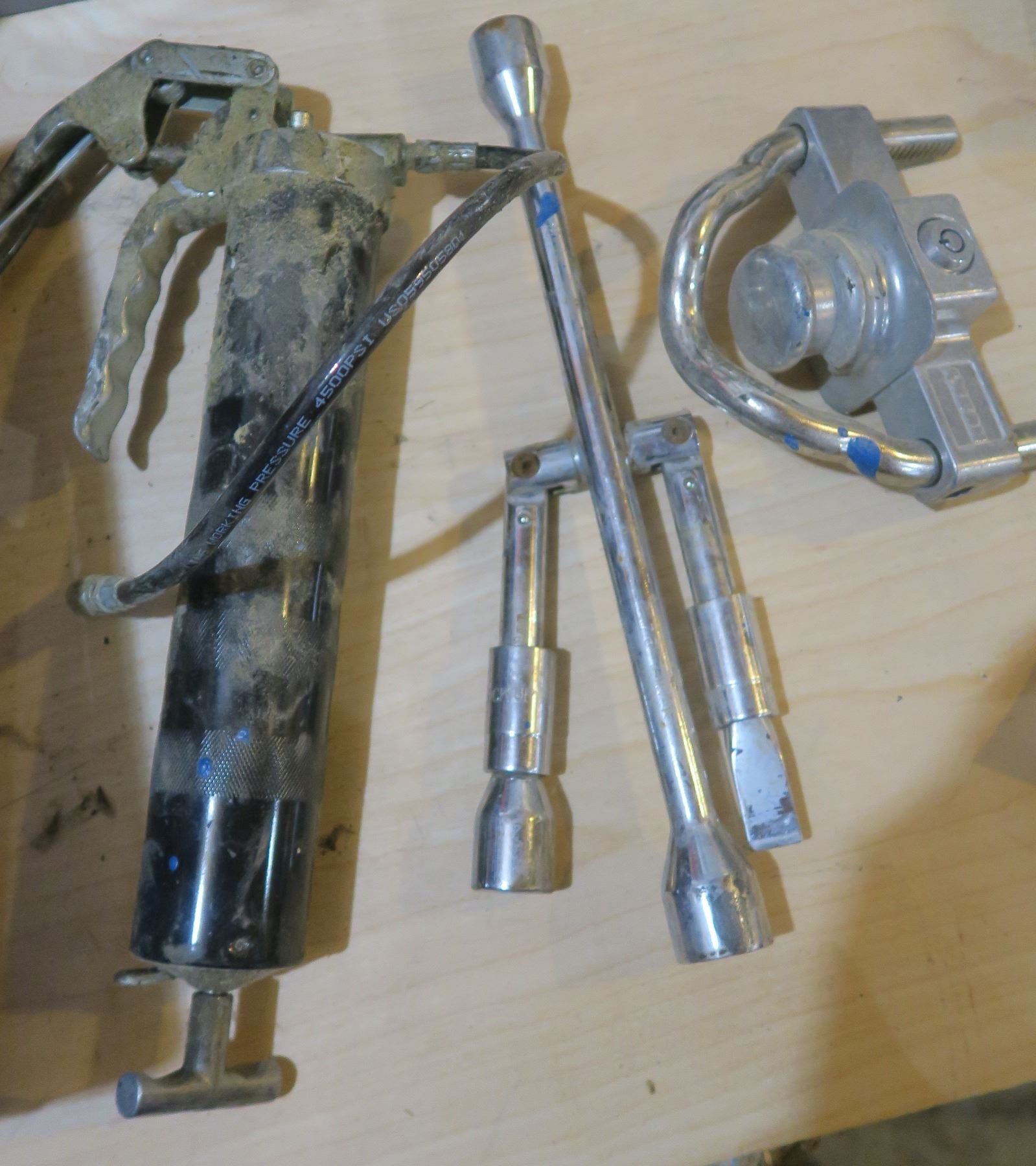milk crate with tent pegs, grease gun, tire iron, hitch lock (no key), etc.
