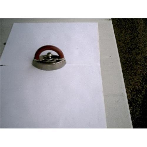 This miniature pressing iron is either a salesman's sample of the larger ones he had for sale, or a child's toy.  We're not sure which, but are inclined to believe that it was made to sell the larger irons because of the weight and because of the detailed workmanship.  This one is perfect in all ways but one.  The handle is cracked.  It may have happened when the iron was new which was probably more than 70 or 80 years ago.  There's no indication of the year it was made, but it does say that it was made in the USA. It could have been made before 1910!