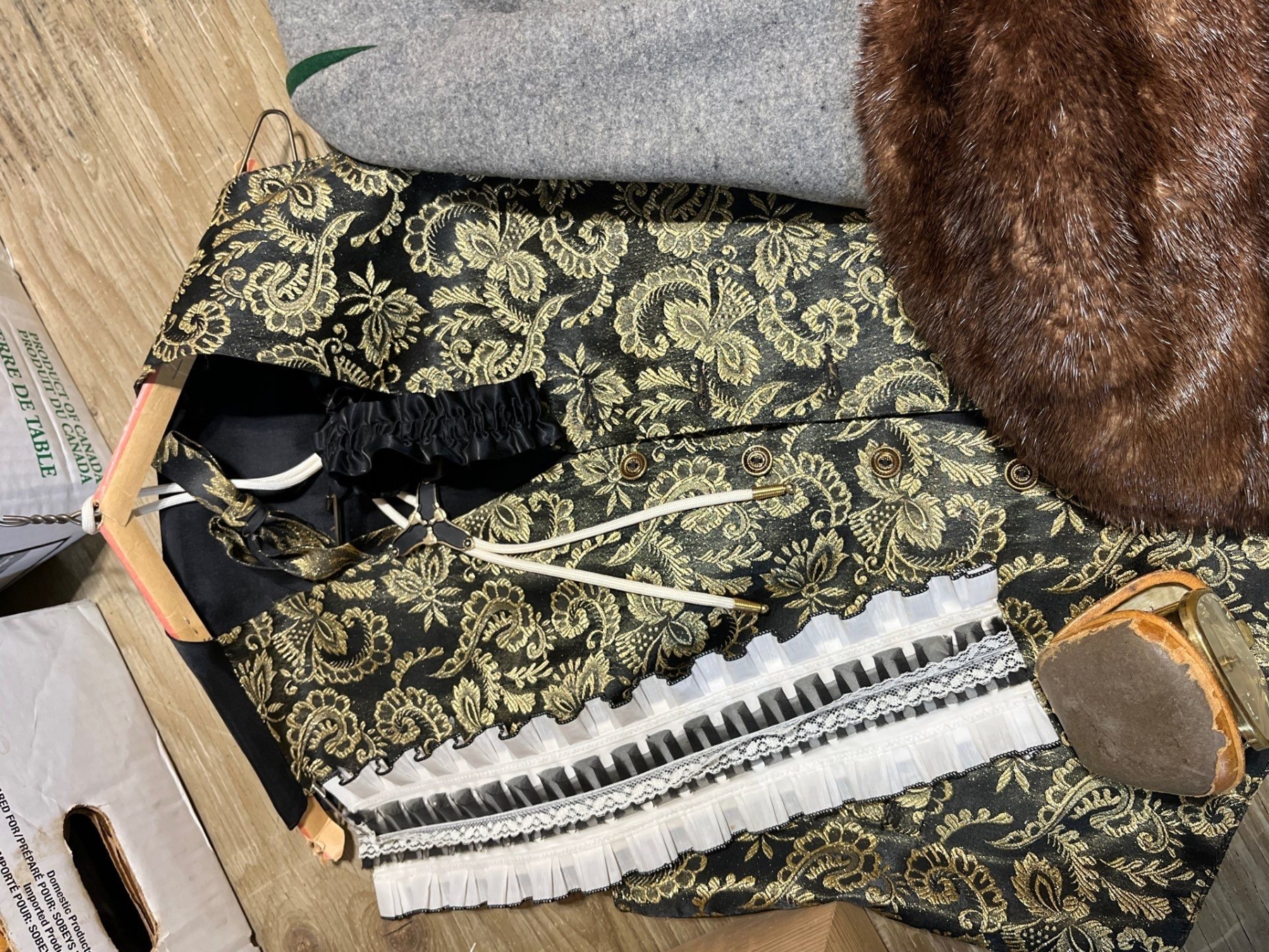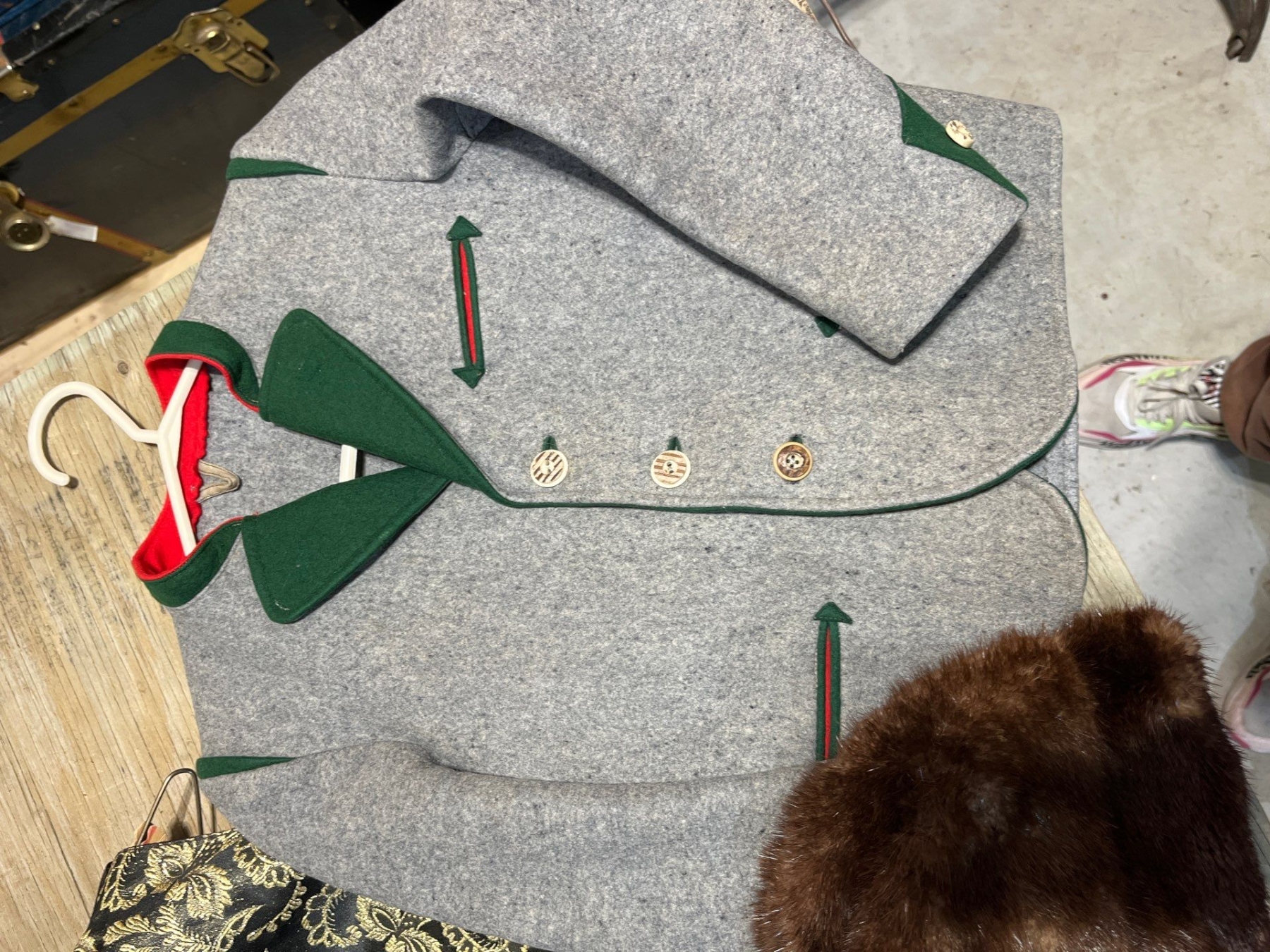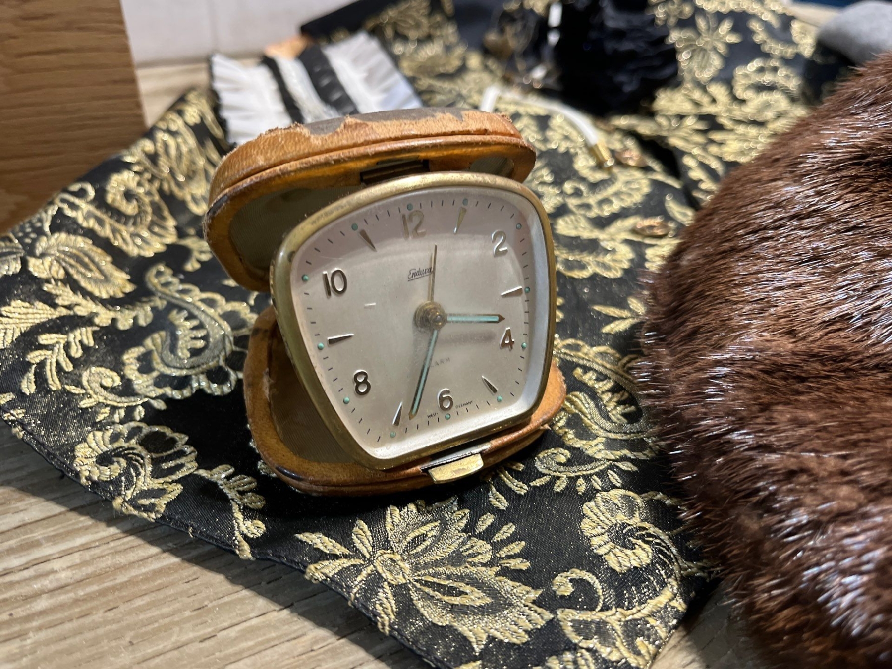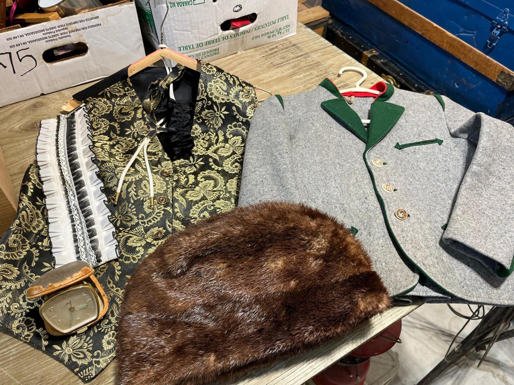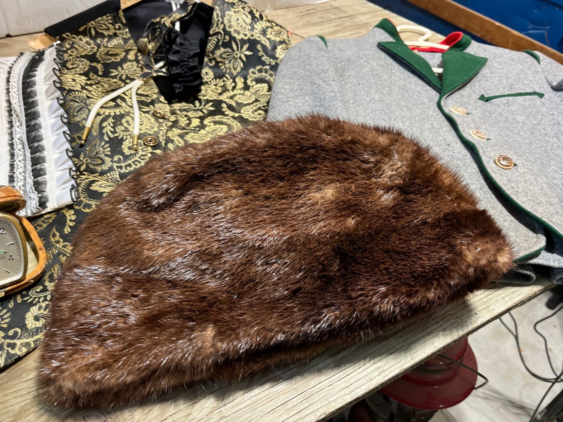 mink men’s hat, antique clock, and a toddler suit jacket with men’s vest
