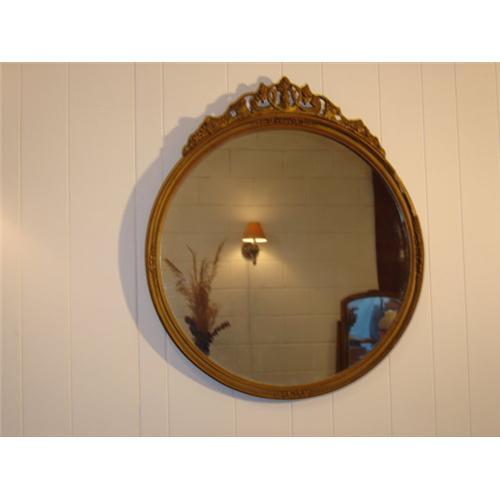 Round Mirror with detailed carving on the top and smaller on the sides and the bottom. It was painted on old gold color. There is few very small cracks on the side, but this is a sign of age.