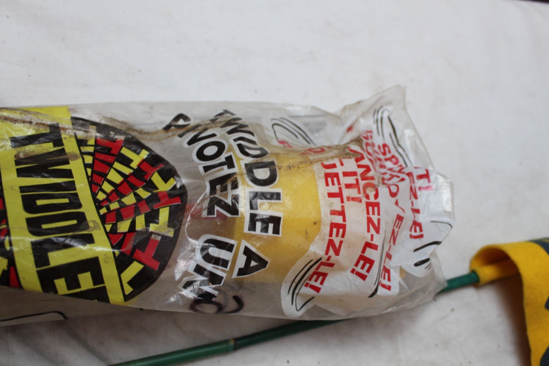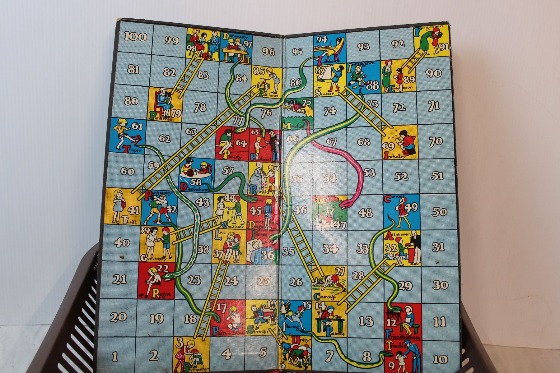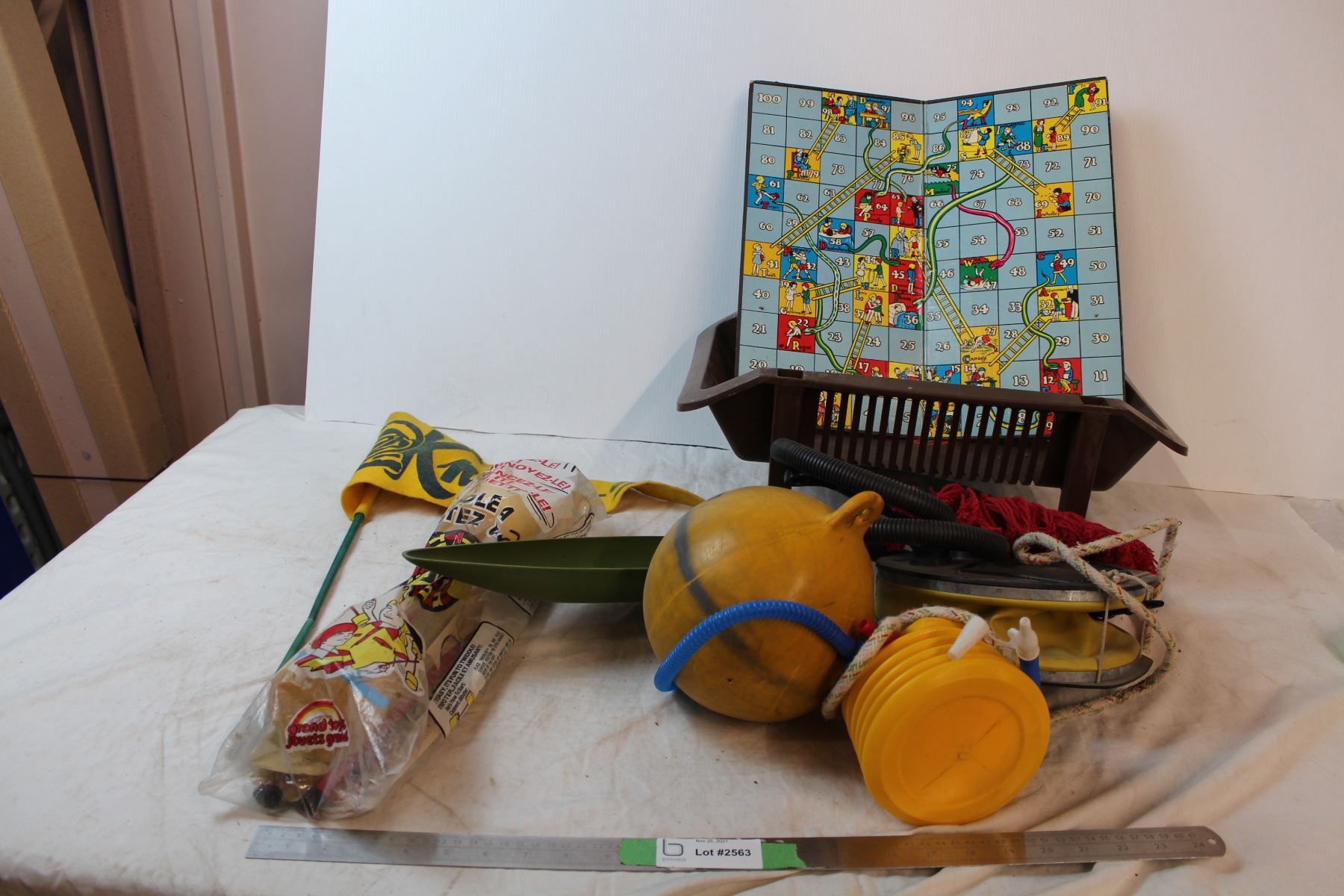 misc. Items; twiddle game (sealed in bag), Snakes and ladders board, Knights flag