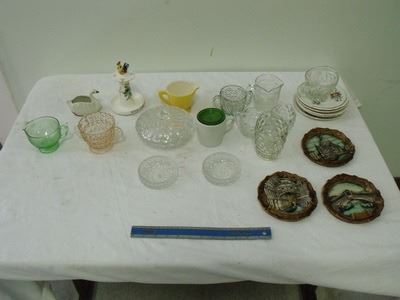gr. Dep glass creamer, pink sugar bowl, etc.