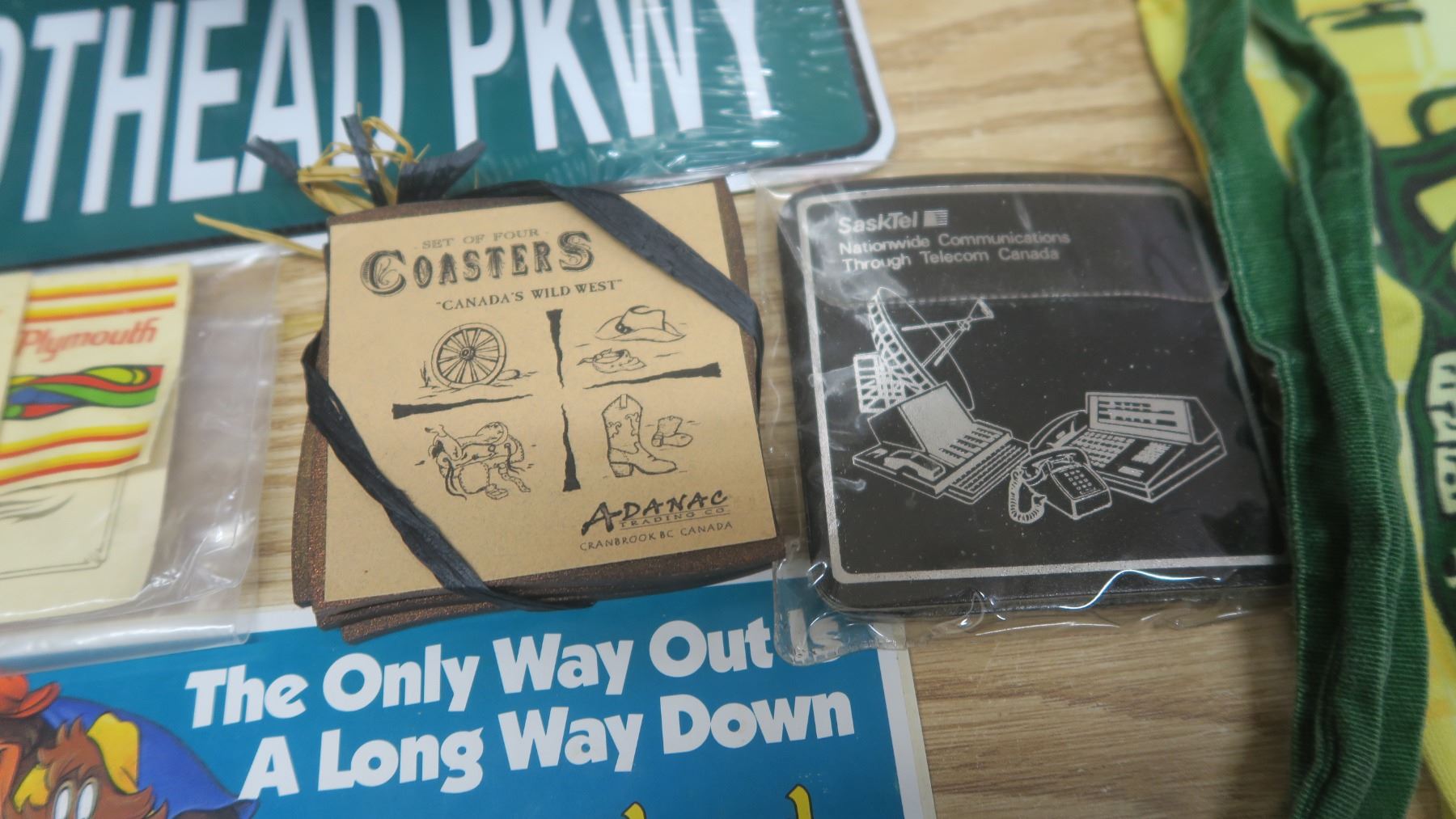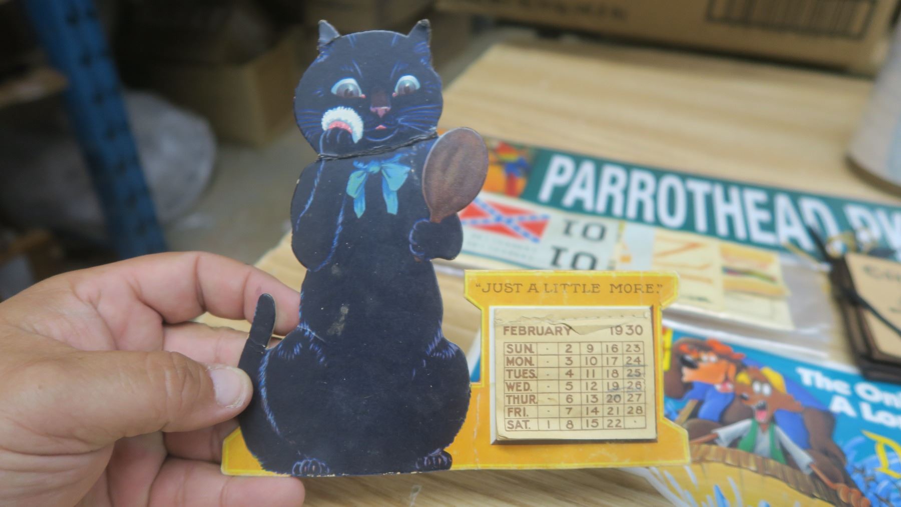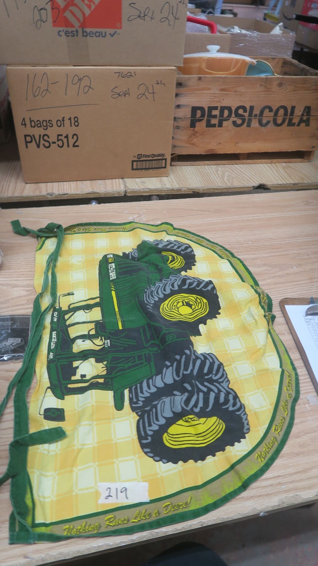 misc items, john deere apron, sign, stickers, 1930 calendar