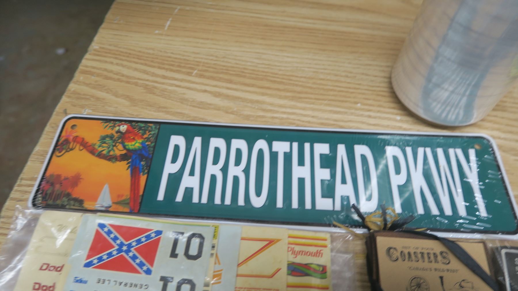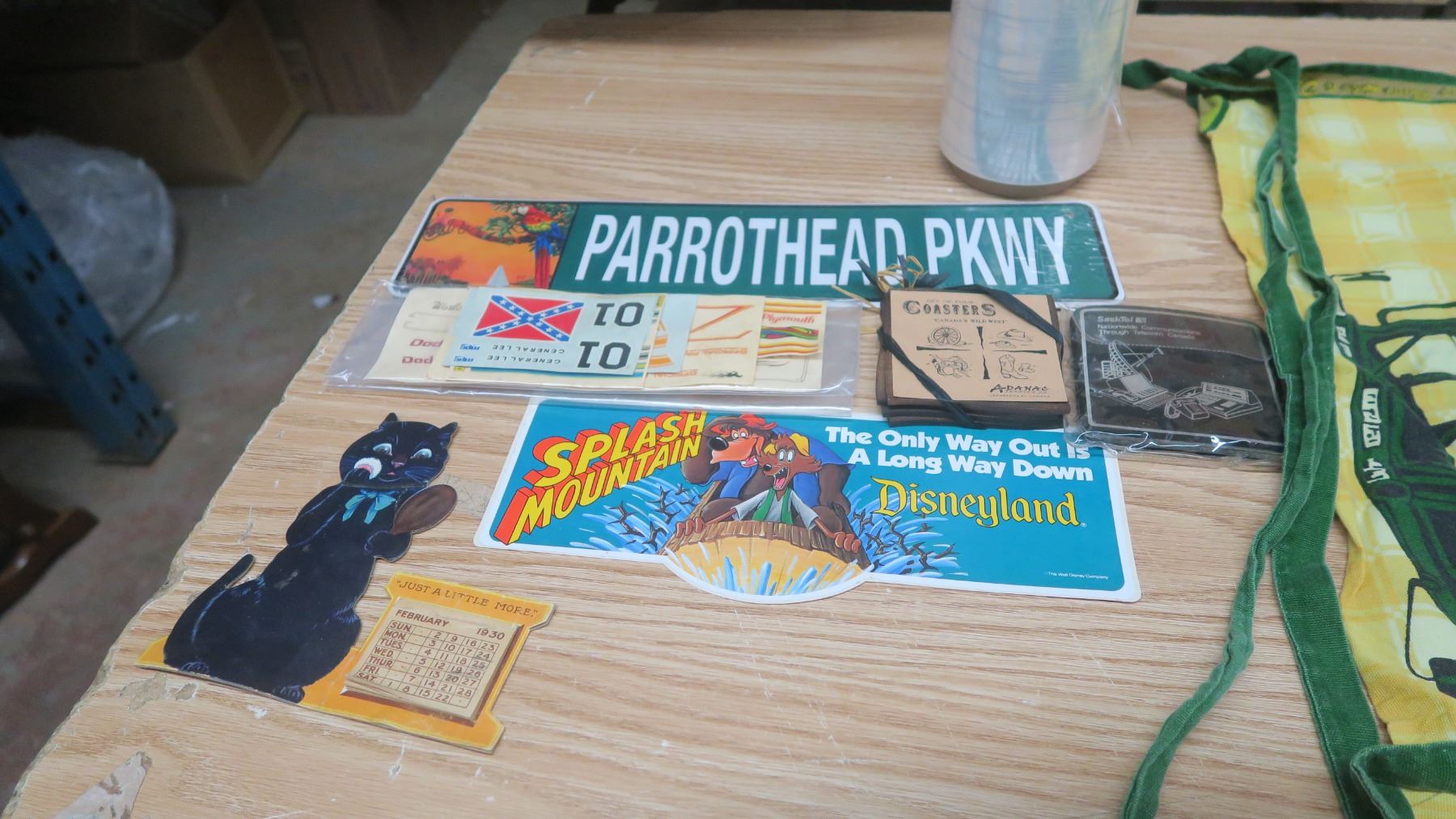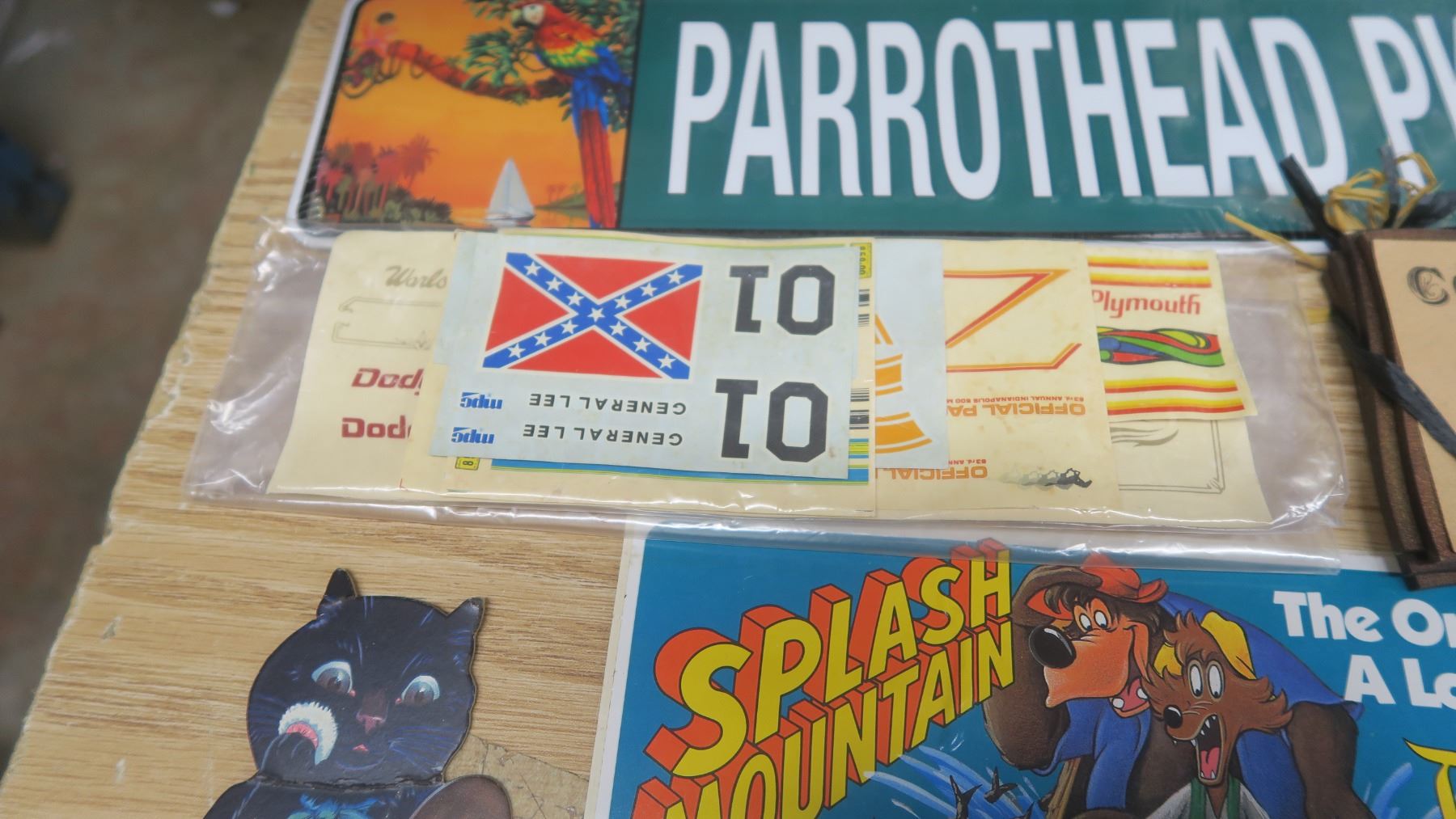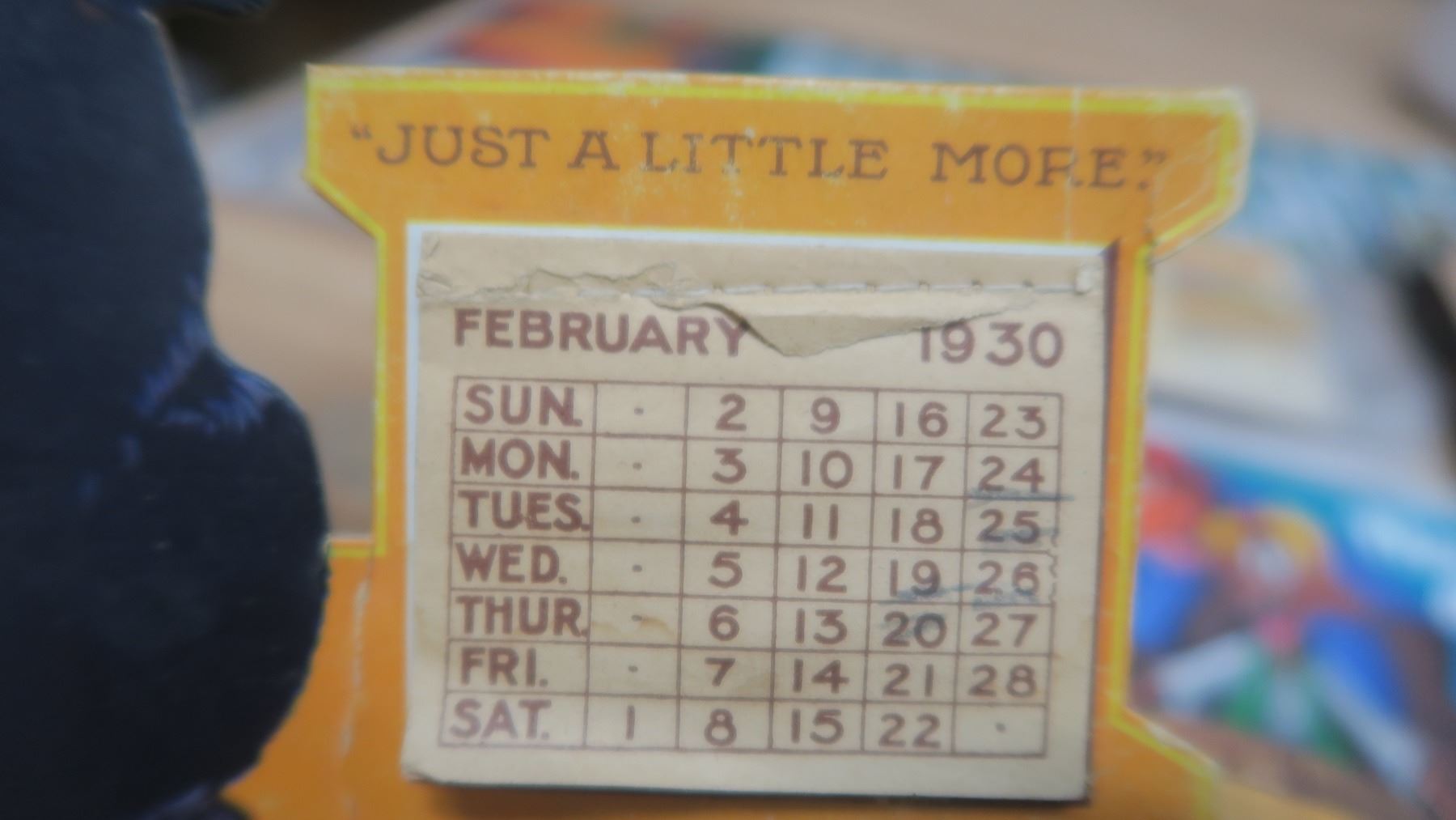 misc items, john deere apron, sign, stickers, 1930 calendar