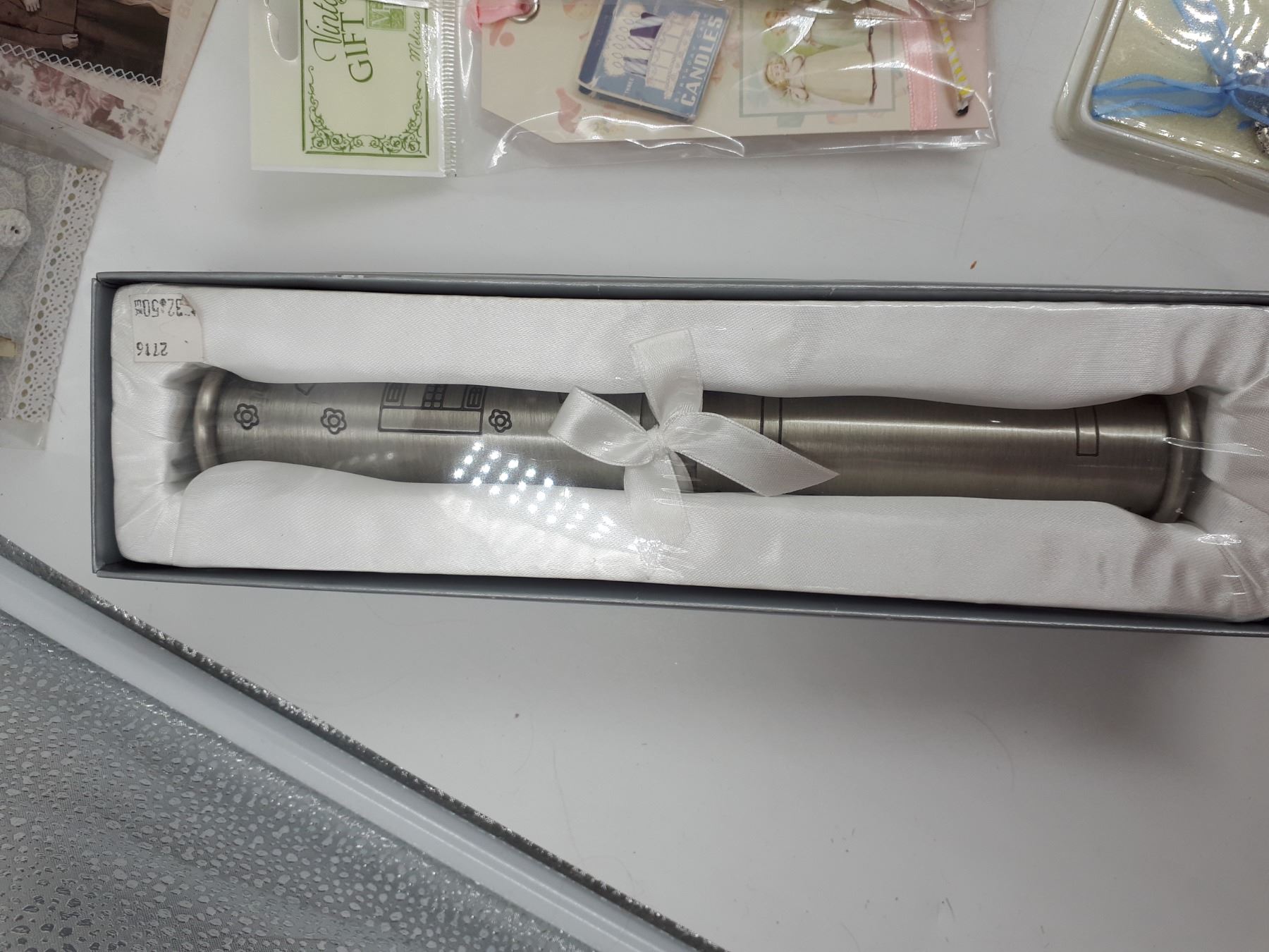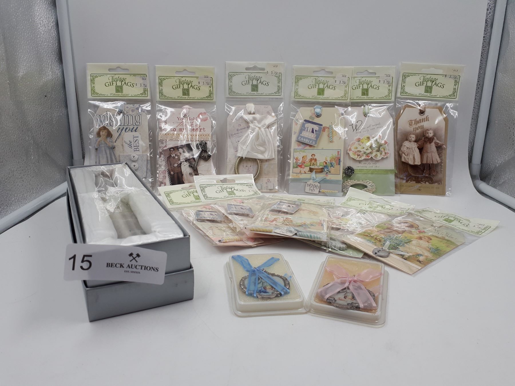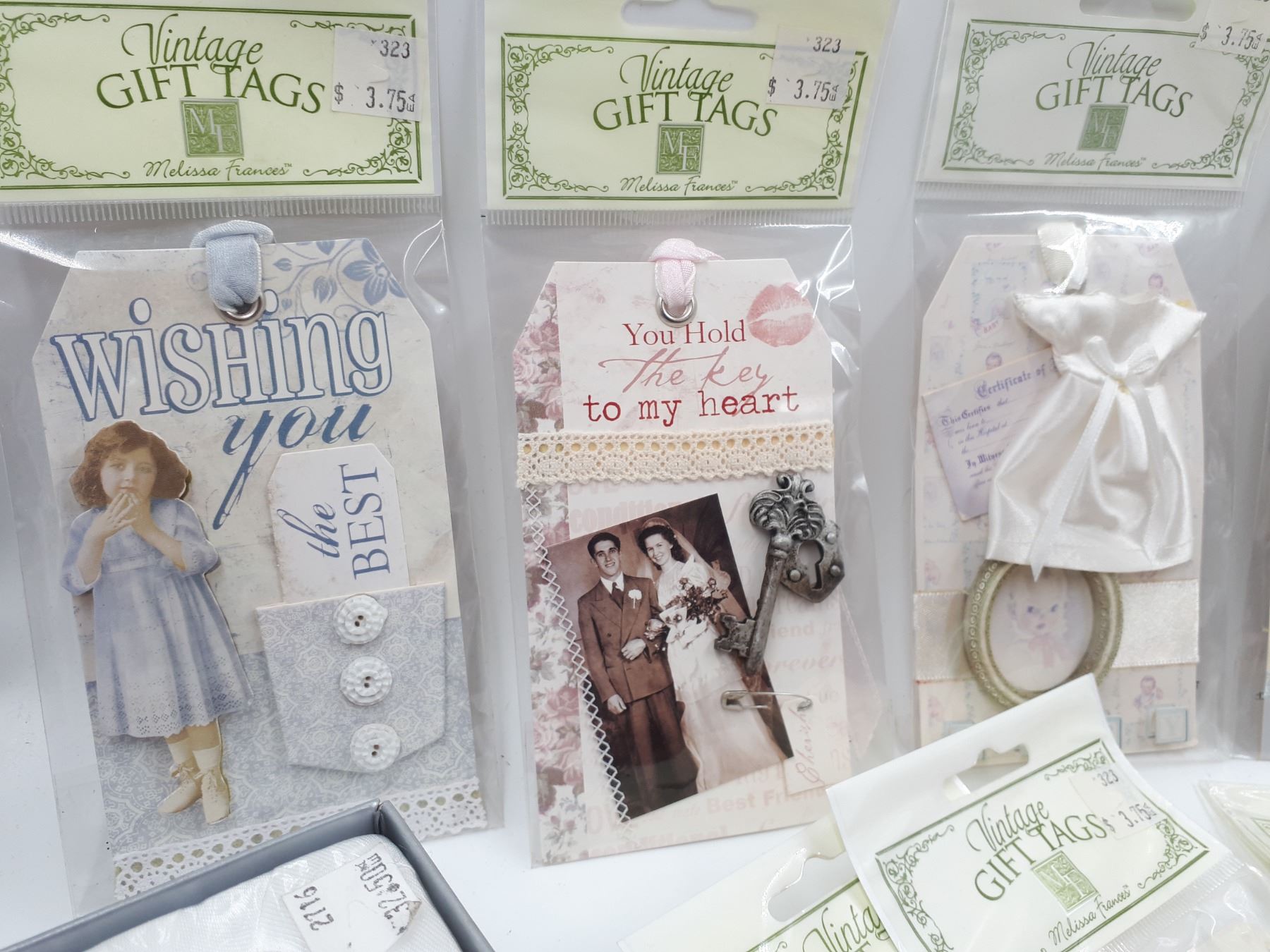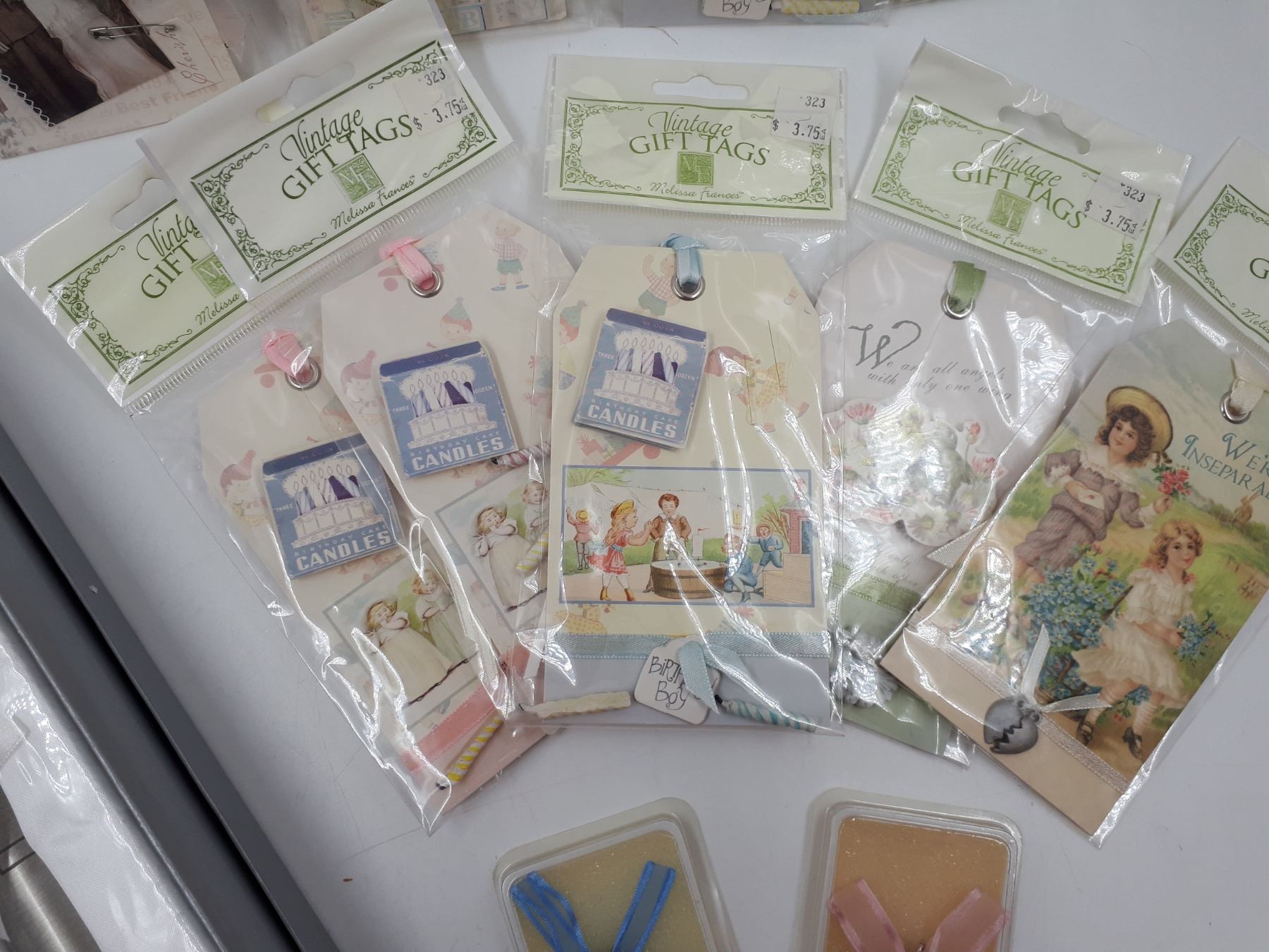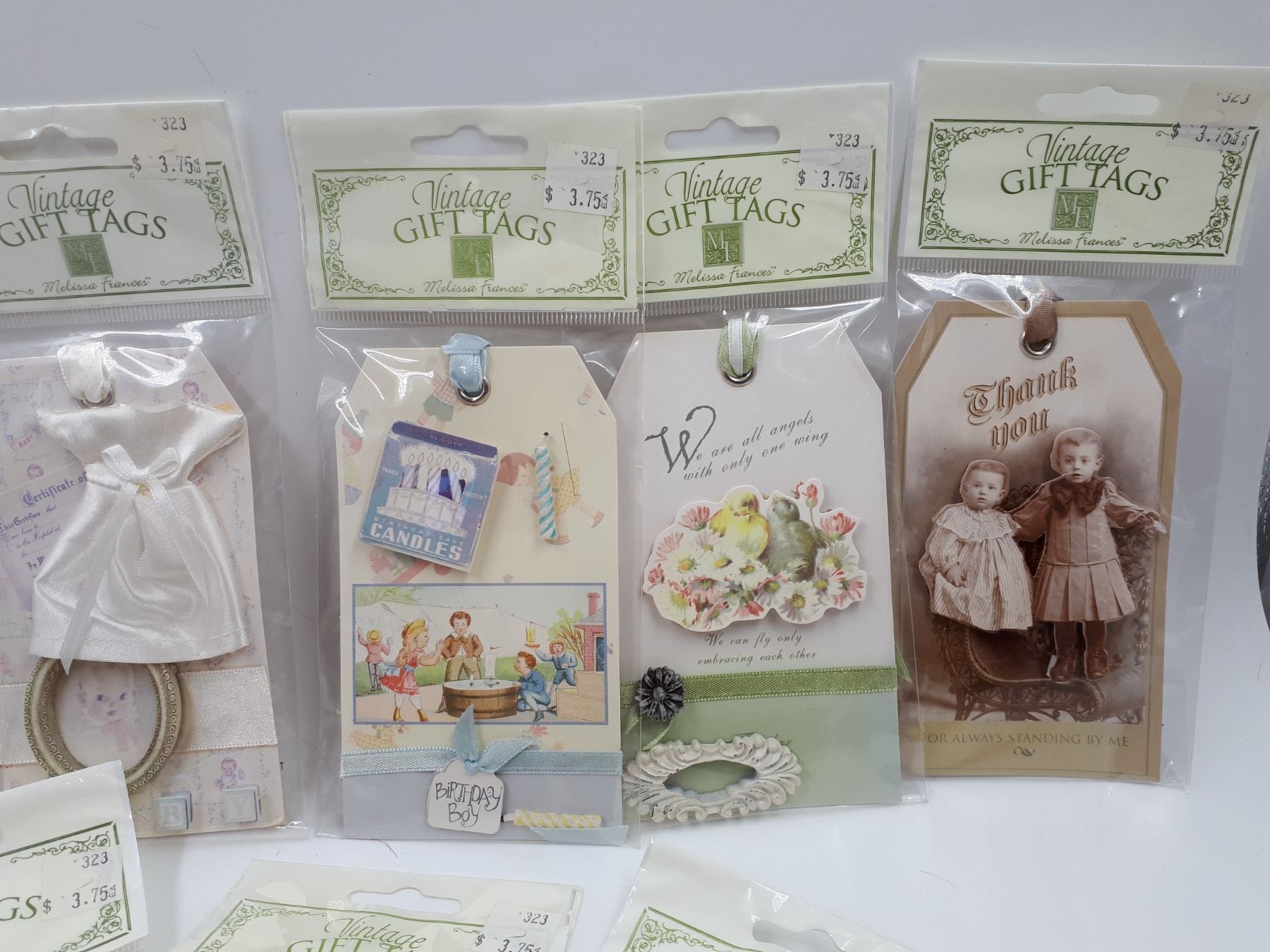 lot of 11 vintage style gift tags, 1 steel nib childs time capsule and two religious medallions boy/girl.