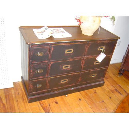 6 large drawers with campaign style pulls and three smaller drawers with half round brass pulls make this dresser so interesting . it has a stained top with breadboard ends and a tiny edge on the back side.the bottom is painted black with signs of a previeous red coat of color showing through.