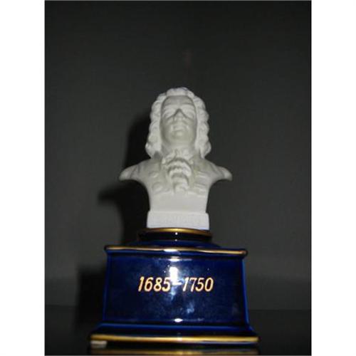 Famous Composer Bach. Bust of Bisque on cobalt blue platform accented with gold and has his birthdate 1685-1750. it is made in Japan and in excellent condition. unaware of date or maker. label reads (made in Japan). this sculpture is musical and has a winding key on the side it works and also measures 7 inch in Height. thank you!