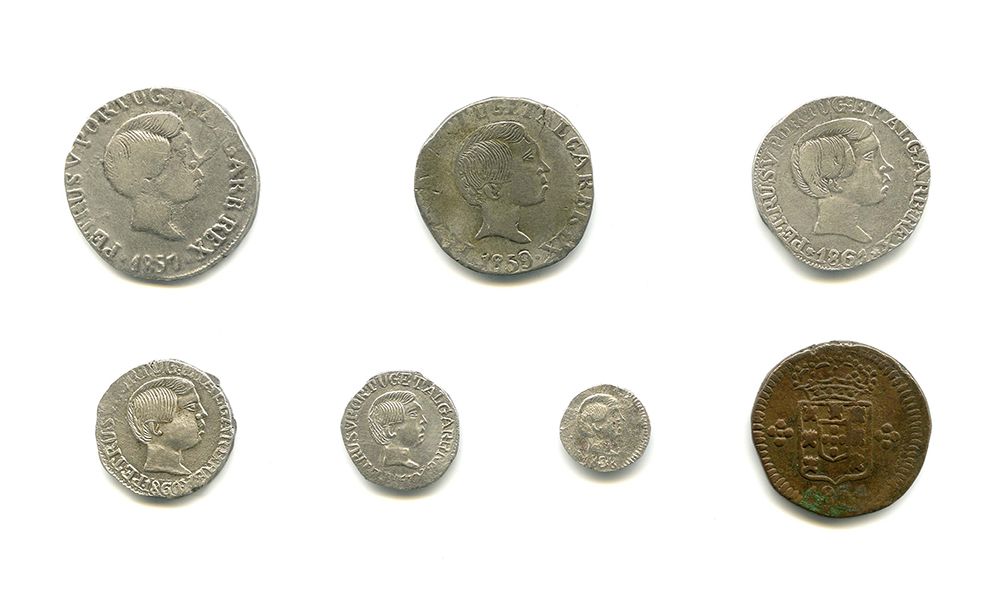 Rupia 1857 Goa (09.02) BC+, 1859 (09.04) BC, 1861 (09.06) MBC; Pardau 1860 busto maior (07.05) lindo MBC; 1/2 Pardau 1857 (05.01) BC+; Tanga 1858 (04.01) BC; 1/4 Tanga 1854 Damão (01.01) MBC