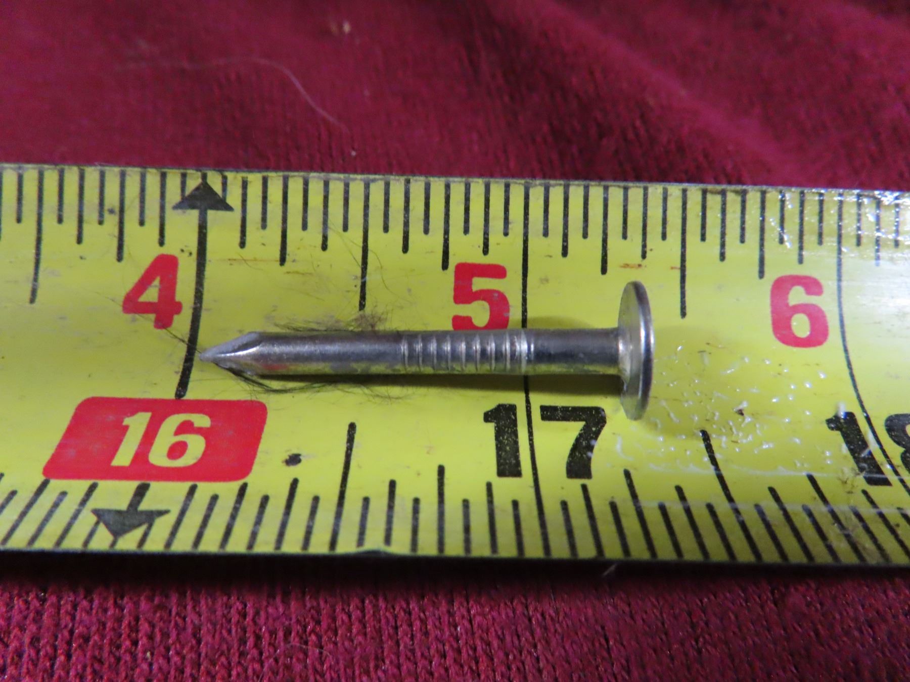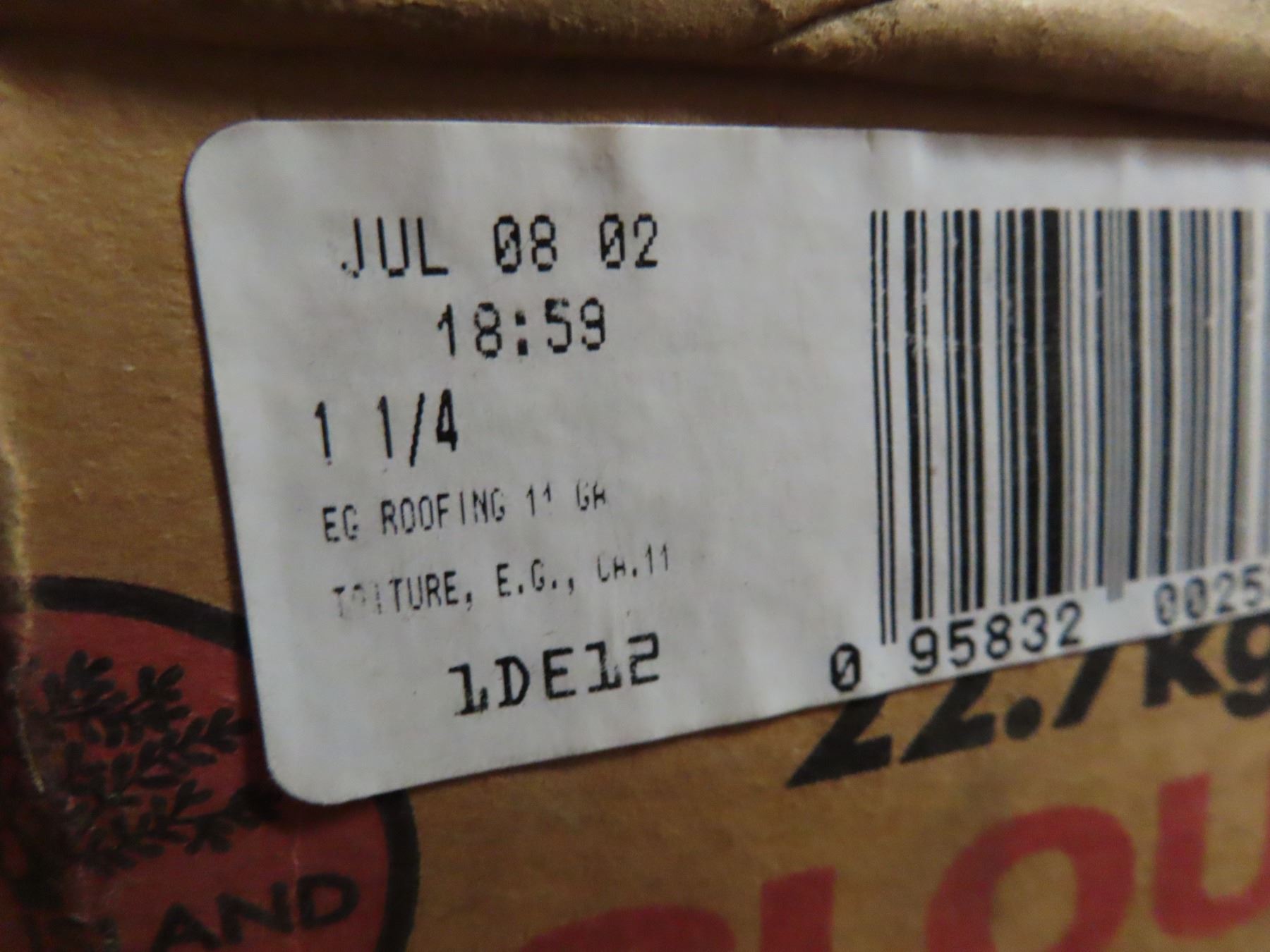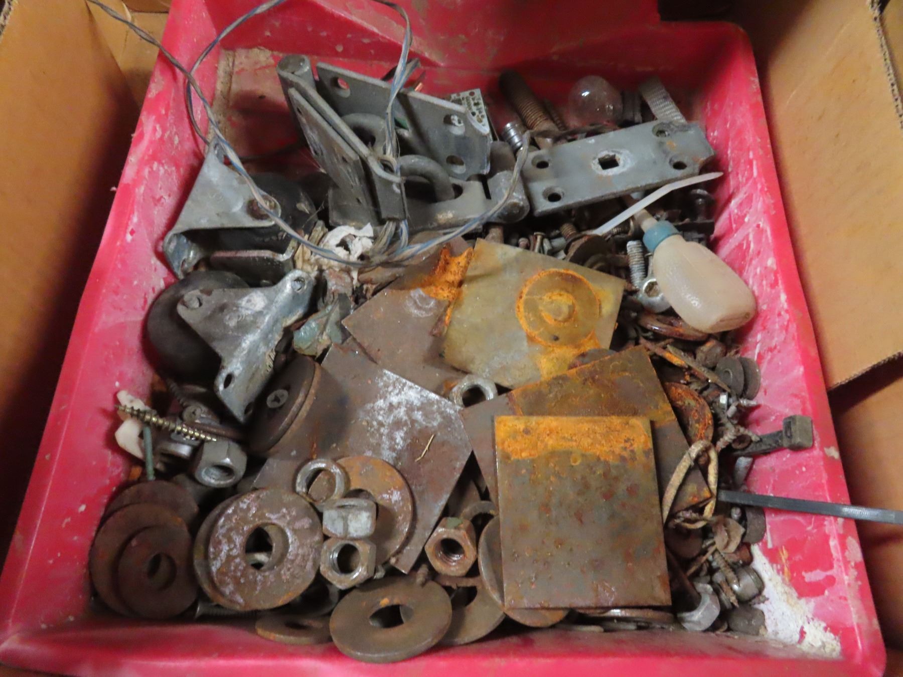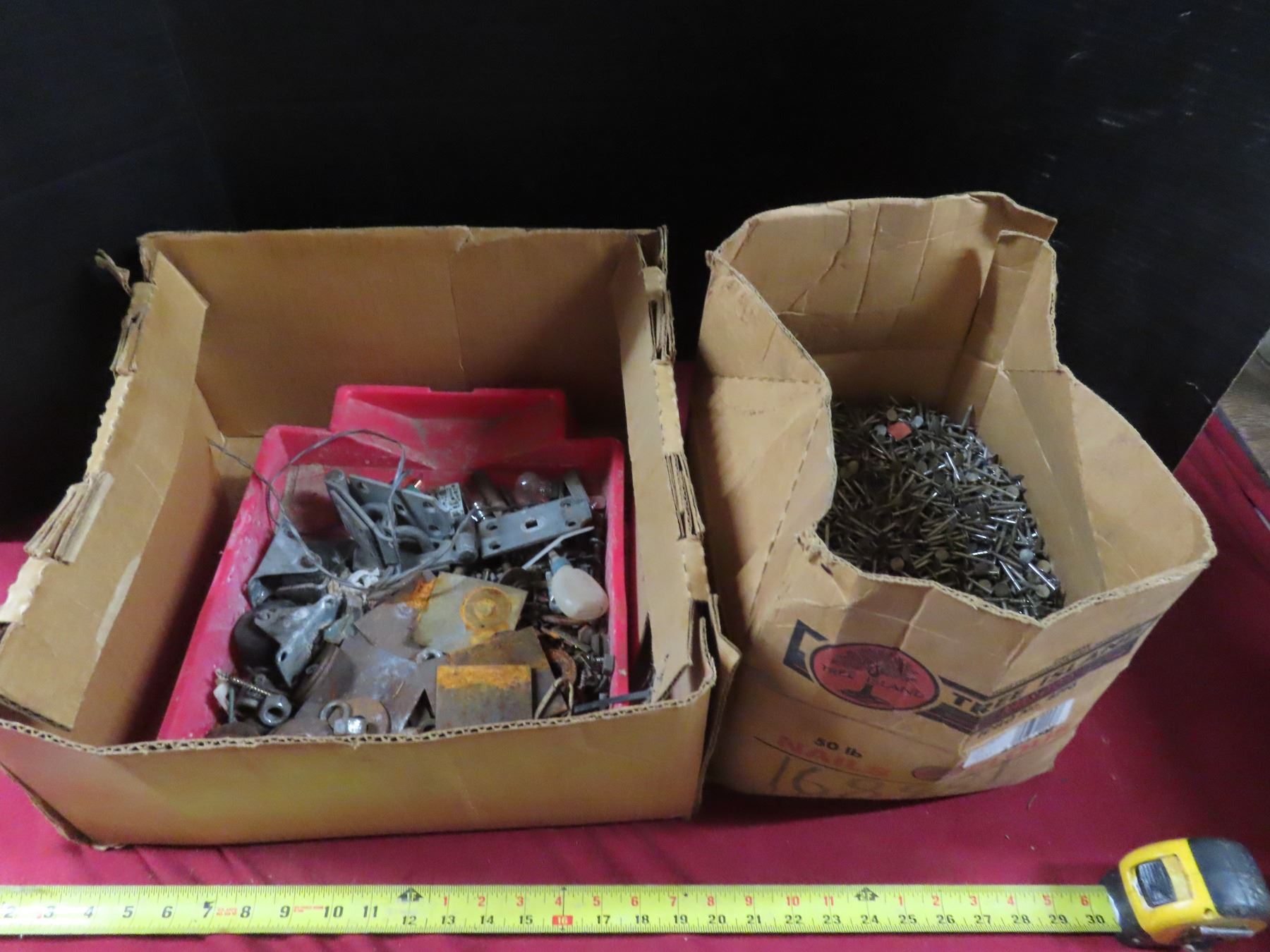 nearly full box of 1 1/4 " nails and bin of assorted hardware