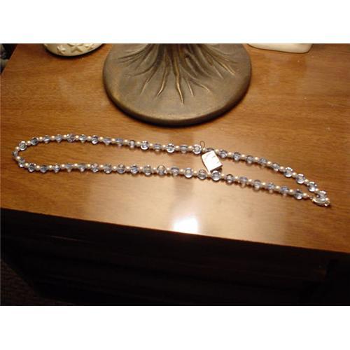 This is a 15" light blue crystal and pearl necklace. It is in perfect condition. Evidentally it was never worn as the label "Edelweiss" is still attached. The blue crystals are about 1/4" wide and the pearls are somewhat smaller. An excellent buy.